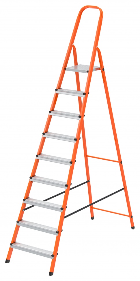 Стремянка оранжевая Сибртех 97969 со стальным профилем и 9 ступенями из стали используется, чтобы достать нужный предмет с антресолей или высокой полки, вытереть пыль на шкафу, заменить лампочку в люстре, а также решить другие бытовые вопросы. Также будет полезна для выполнения малярных и монтажных работ. Лестница рассчитана на нагрузку до 150 кг. Площадка находится на высоте 186 см от опорной поверхности, рабочая высота стремянки составляет 386 см (при среднем росте пользователя 170 см). Стремянка имеет широкое основание и характеризуется устойчивостью.