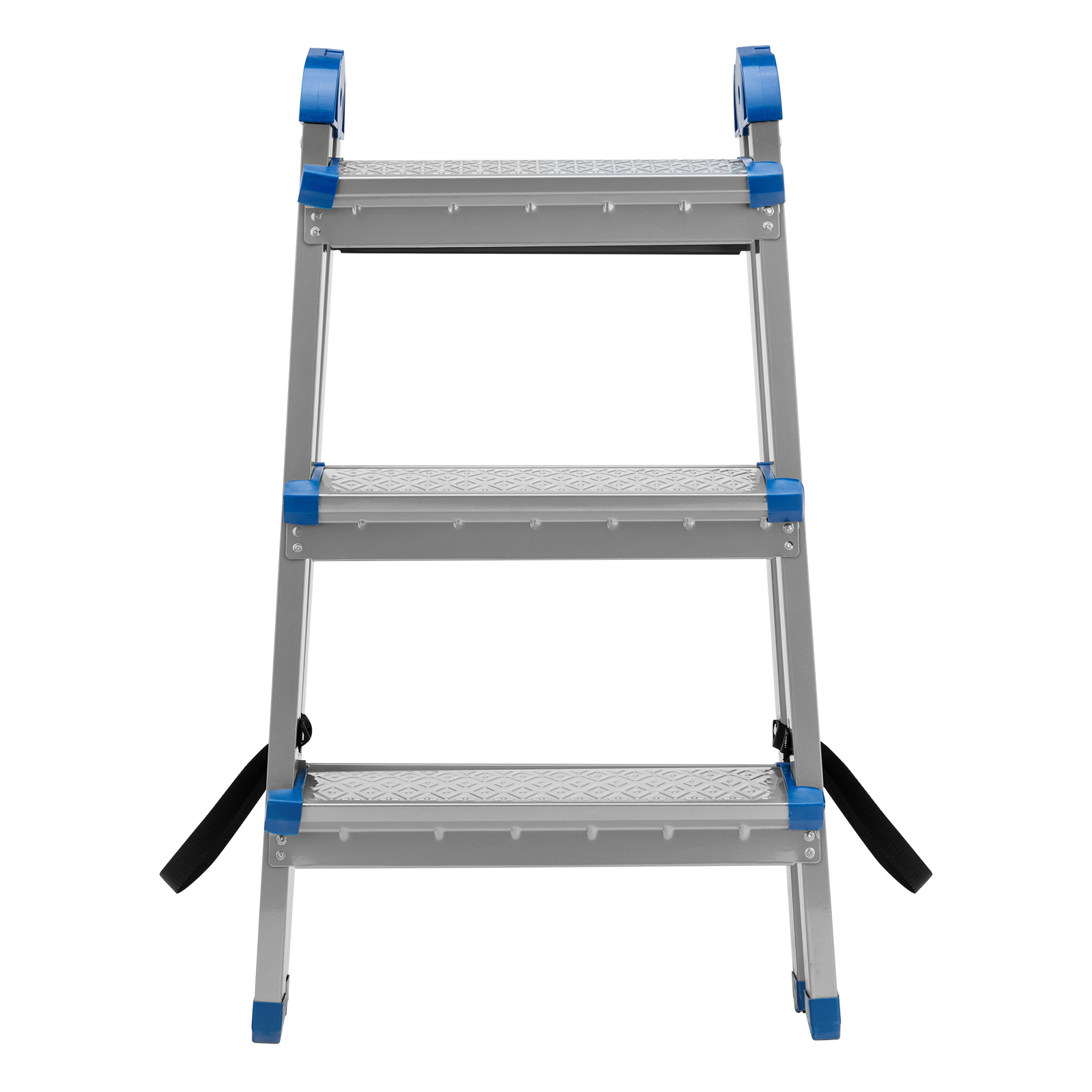 Стремянка двухсторонняя Сибртех 97983 со стальным профилем и 3 стальными ступенями помогает решать бытовые задачи на высоте, превышающей человеческий рост. Ее используют, чтобы доставать предметы с антресолей или шкафов, проводить уборку, менять лампочки, вешать полки или картины. Работать с электроинструментом на ней не рекомендуется. Стремянка с пластиковым складным механизмом повышенной стабильности и широким основанием очень устойчива на ровной поверхности. Площадка находится на высоте 66 см от опорной поверхности, рабочая высота стремянки составляет 266 см (при среднем росте пользователя 170 см).