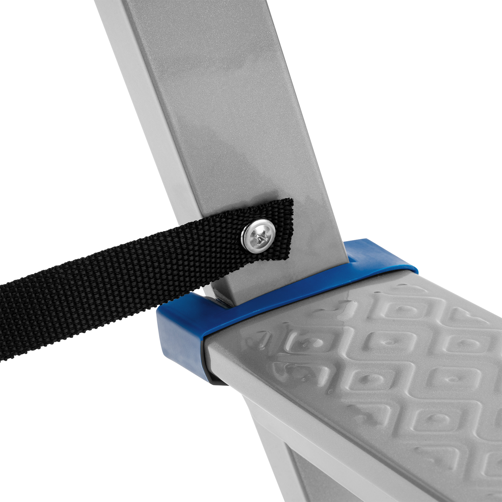 Надежность — стремянка из стального профиля с широкими ступенями выдерживает вес до 120 кг, страховочные ленты из полиэстера повышают устойчивость.