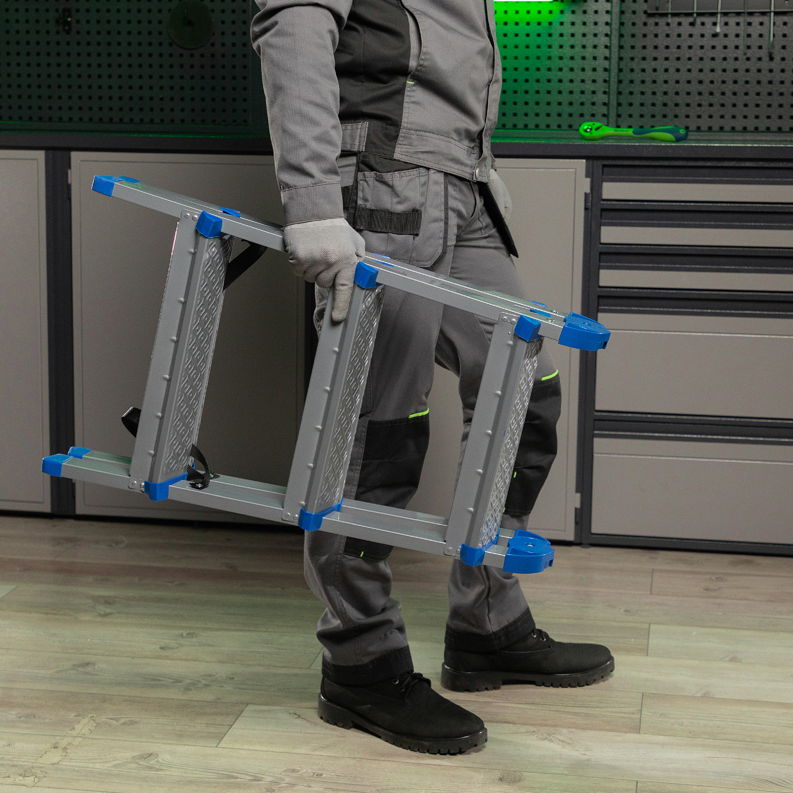 Удобная транспортировка — стремянка весом 4 кг легко складывается, ее размеры в сложенном состоянии 735 х 435 х 160 мм.