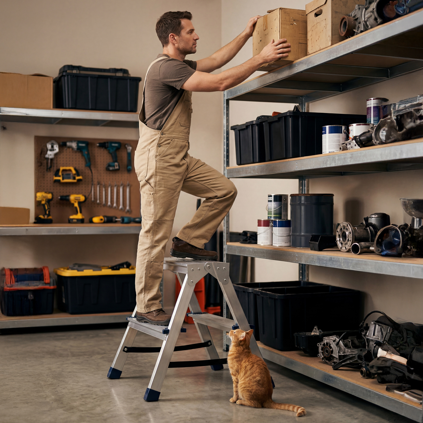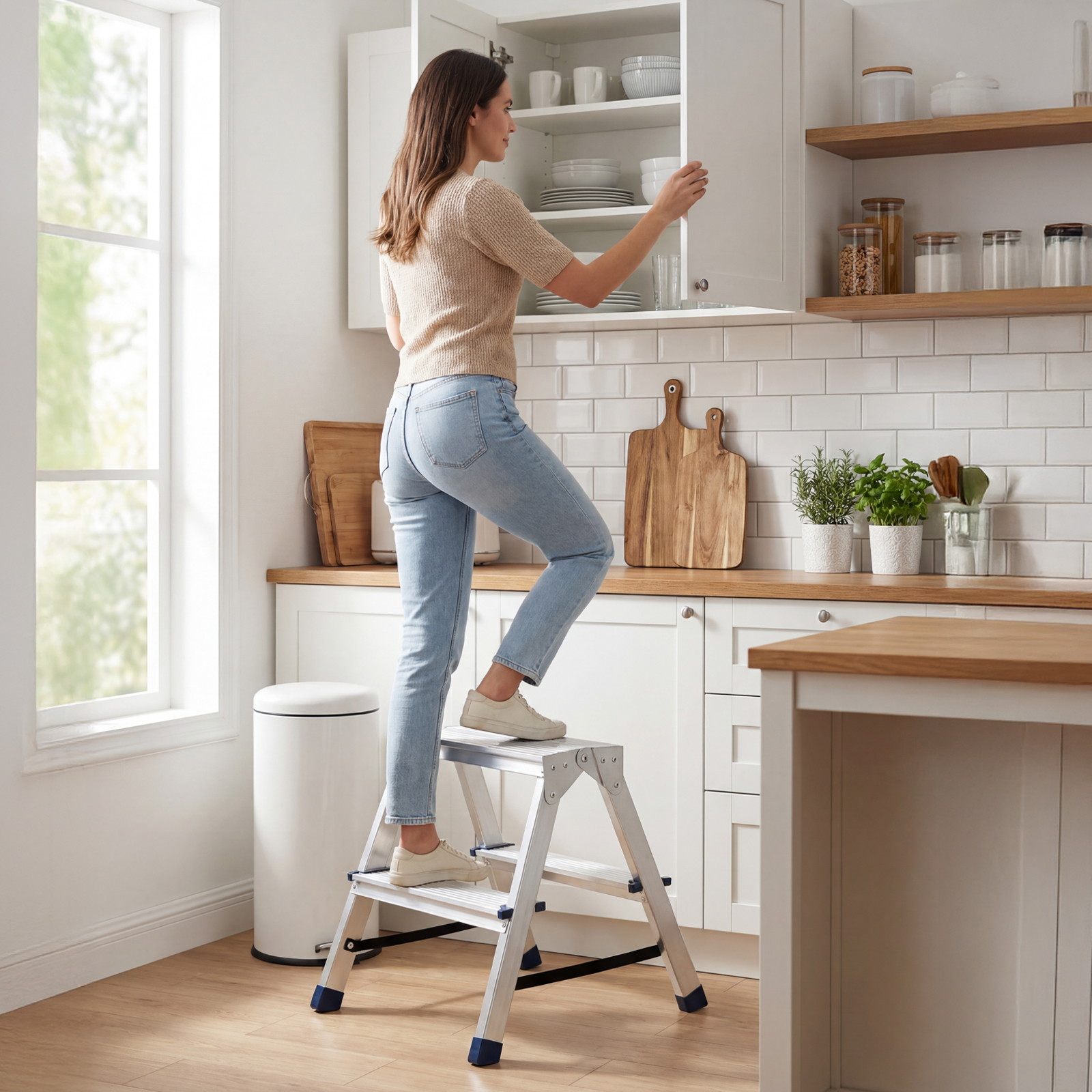 Преимущества Долговечность — стремянка выполнена из легкого, но прочного алюминия, устойчивого к коррозии. Устойчивость к высоким нагрузкам — рама из прессованного алюминиевого профиля выдерживает до 150 кг. Продуманная конструкция — нейлоновые страховочные стяжки повышают надежность фиксации стремянки в рабочем положении. Комфорт и безопасность — широкие ступени удобны для длительной работы, а пластиковые накладки на них защищают пользователя от травм. Антискользящие свойства — ступени имеют рифленую поверхность. Защита напольного покрытия — опоры с пластиковыми рифлеными наконечниками не скользят и не оставляют царапин. Вес 1,7 кг — стремянку легко сможет установить пользователь с любым уровнем подготовки. Удобное хранение и транспортировка — размеры сложенной лестницы 436 х 410 х 160,5 мм. Внешний вид товара может незначительно отличаться от указанного на изображении, что не влечет изменения его качества.