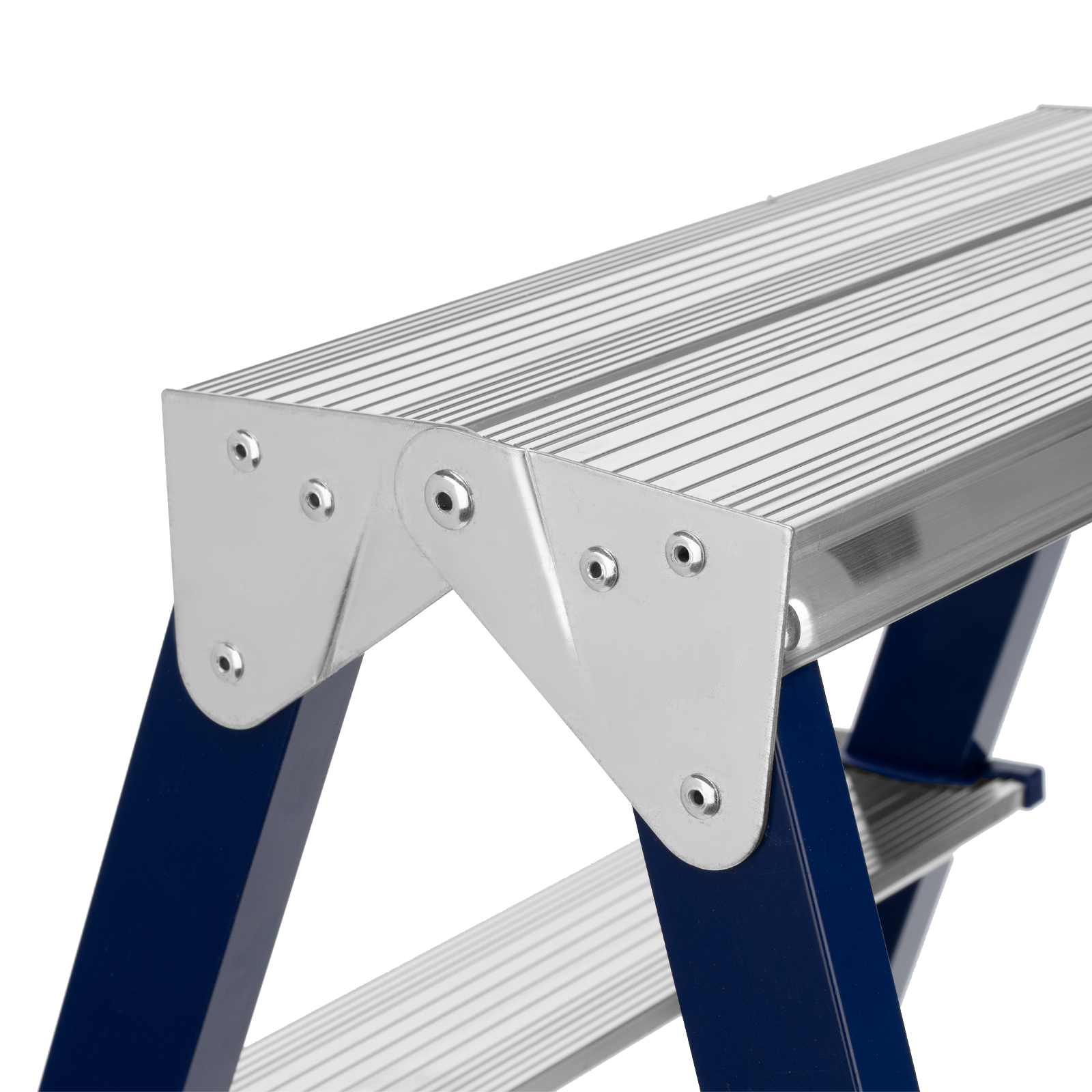 Описание Стремянка двусторонняя стальная Сибртех 97933 с 3 ступенями используется строителями, работниками коммунальных служб, а также полезна в быту. Незаменима, если нужно выполнить монтажные или отделочные работы на высоте, провести уборку, а также достать нужные предметы с антресолей или верхней полки шкафа. На широких ступенях комфортно стоять. Площадка находится на высоте 60,4 см от опорной поверхности, рабочая высота стремянки составляет 260,4 см (при среднем росте пользователя 170 см). Стальная рама прямоугольного сечения выдерживает нагрузку до 150 кг.