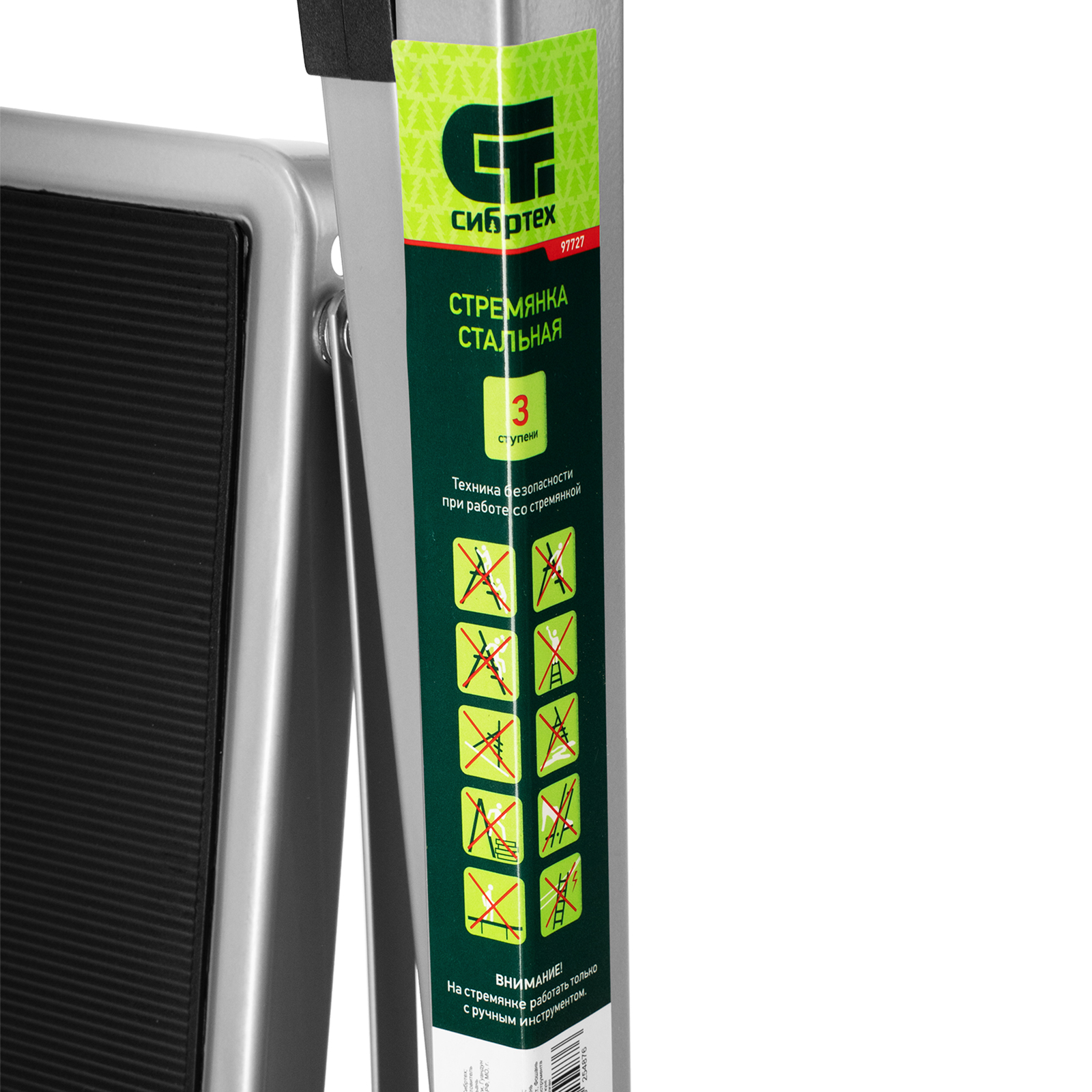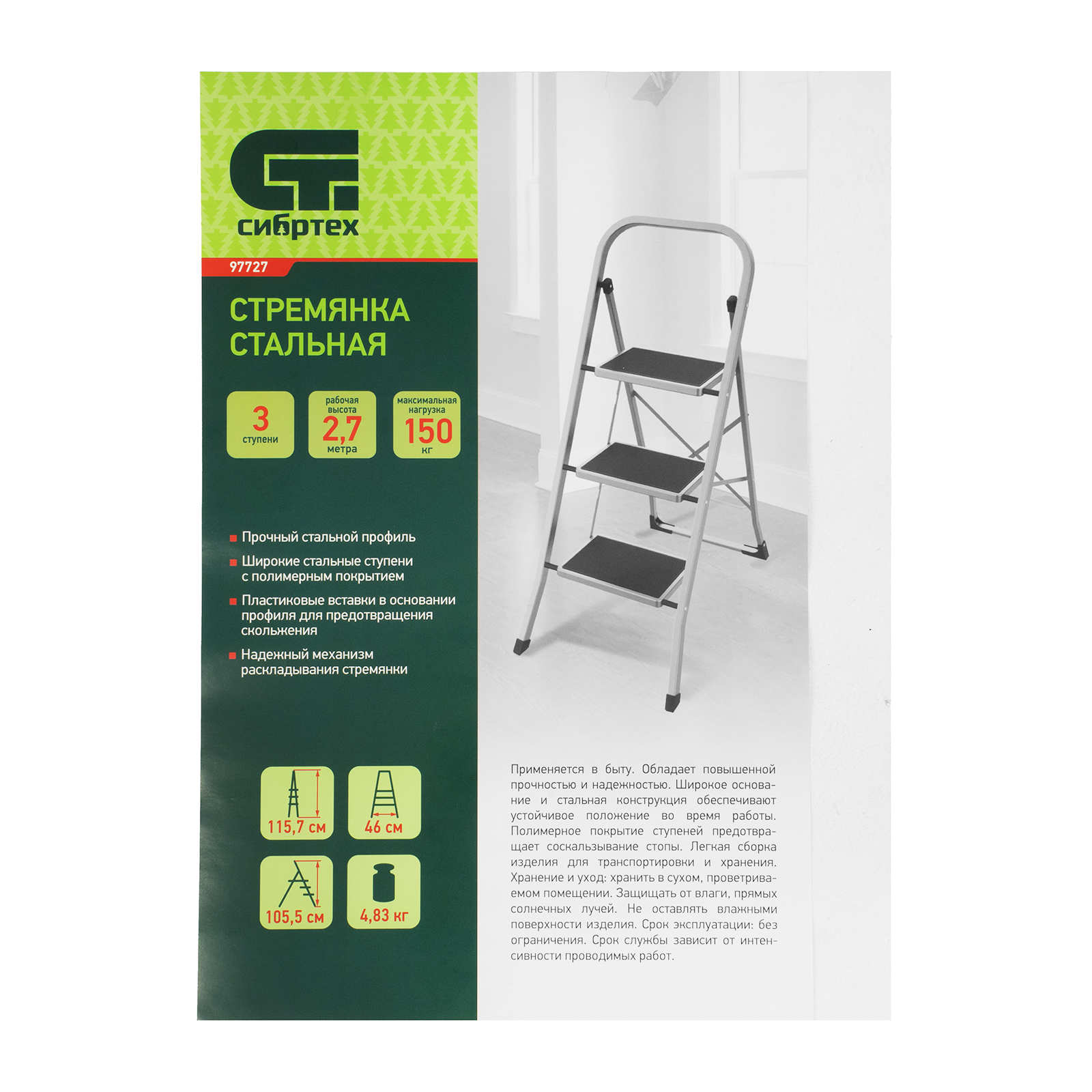 Стальная стремянка Сибртех 97727 с 3 широкими ступенями размером 20 x 30 см, с полимерным покрытием, позволяет выполнять различные работы на высоте, превышающей человеческий рост. С ее помощью можно достать нужный предмет с полки, покрасить стену, поменять лампочку, вытереть пыль на шкафу и т.д. Верхняя ступень находится на высоте 70 см от опорной поверхности, рабочая высота составляет 270 см (при среднем росте пользователя 170 см). Дуга безопасности и широкие ступени с нескользящим покрытием обеспечивают устойчивое положение пользователя. Стремянку следует размещать на ровной поверхности и использовать для работы только с ручным инструментом.