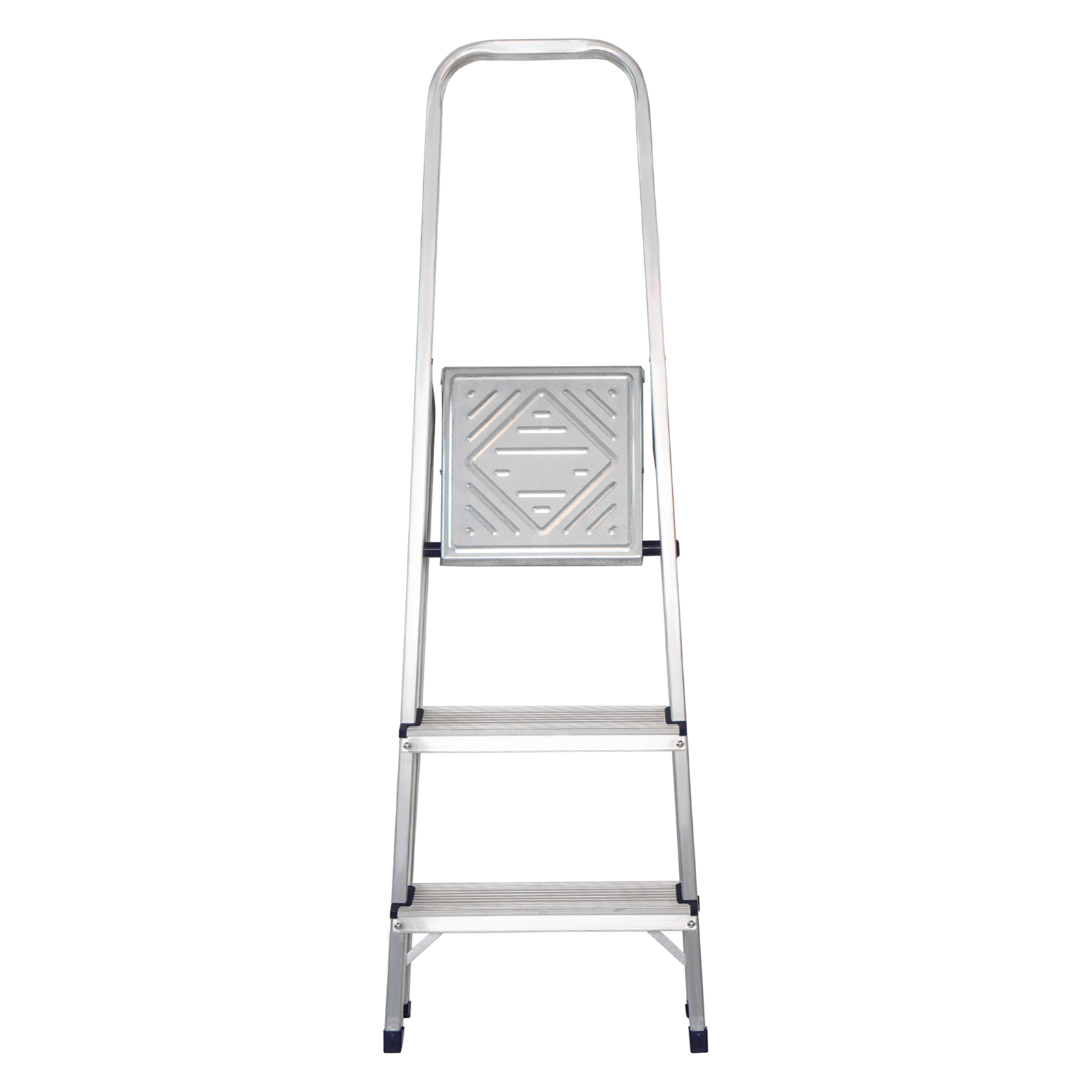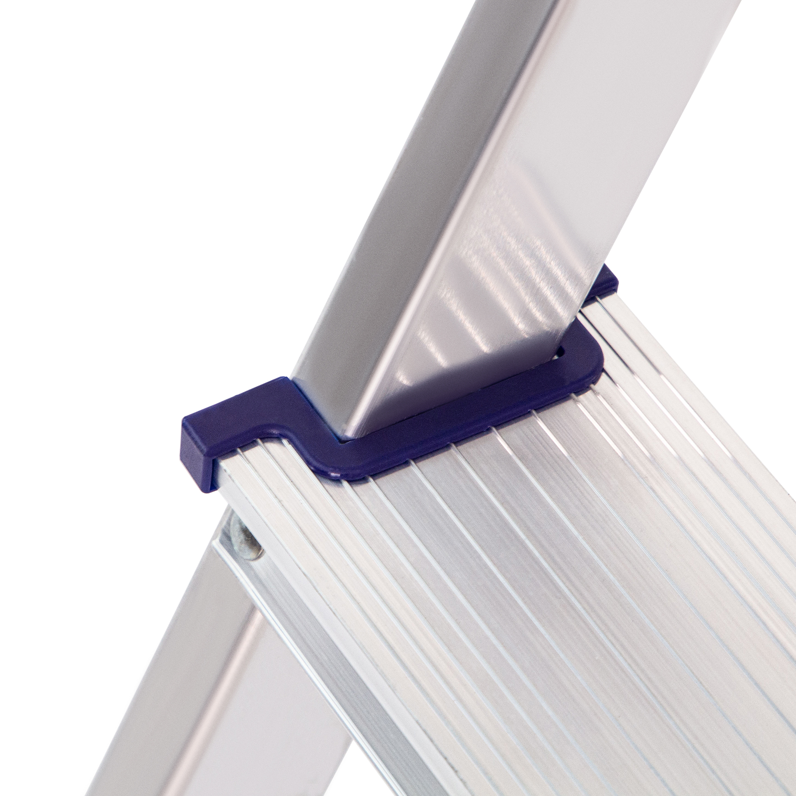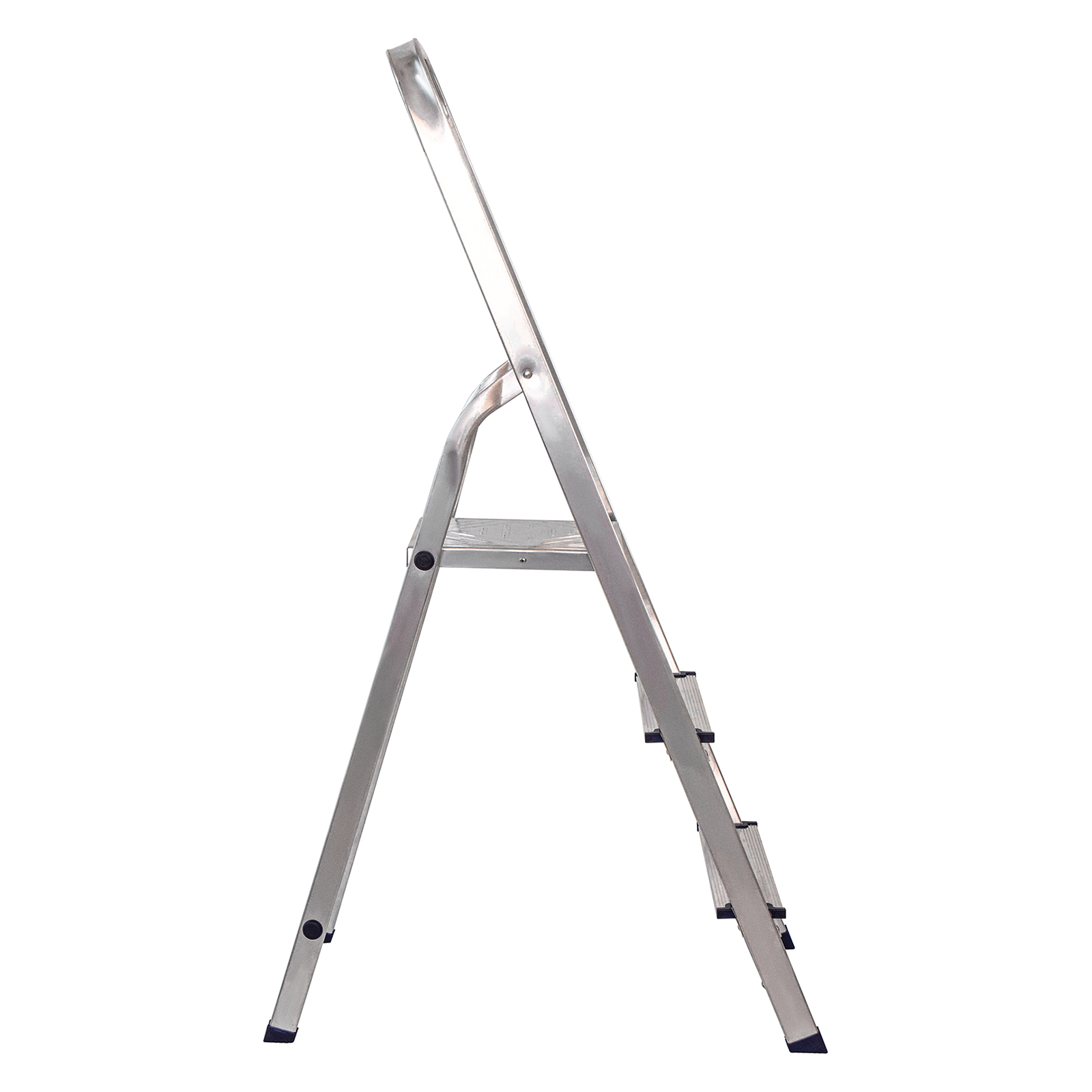 - Надежность — рама из прямоугольного алюминиевого профиля выдерживает нагрузку до 150 кг, широкие ступени закреплены заклепками.