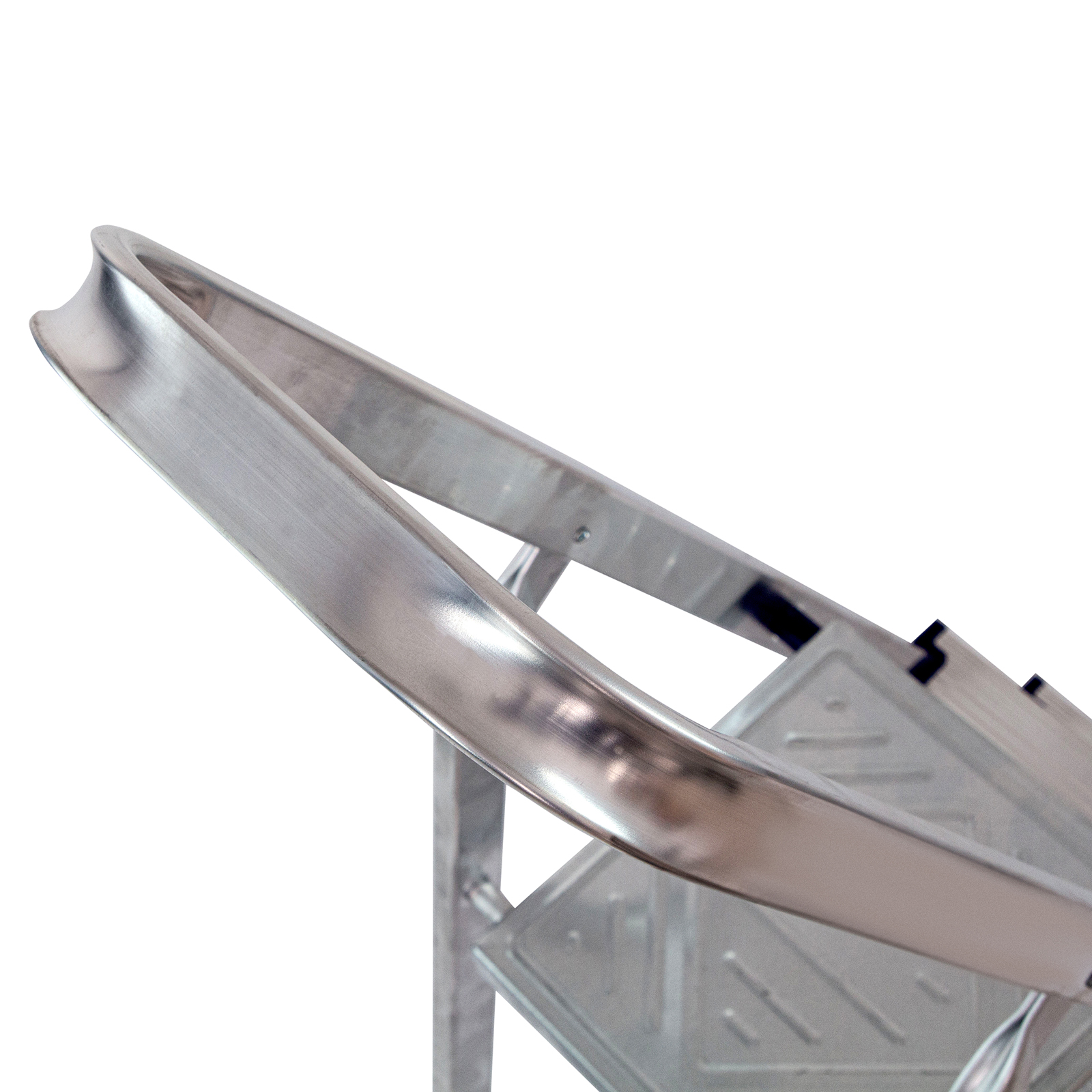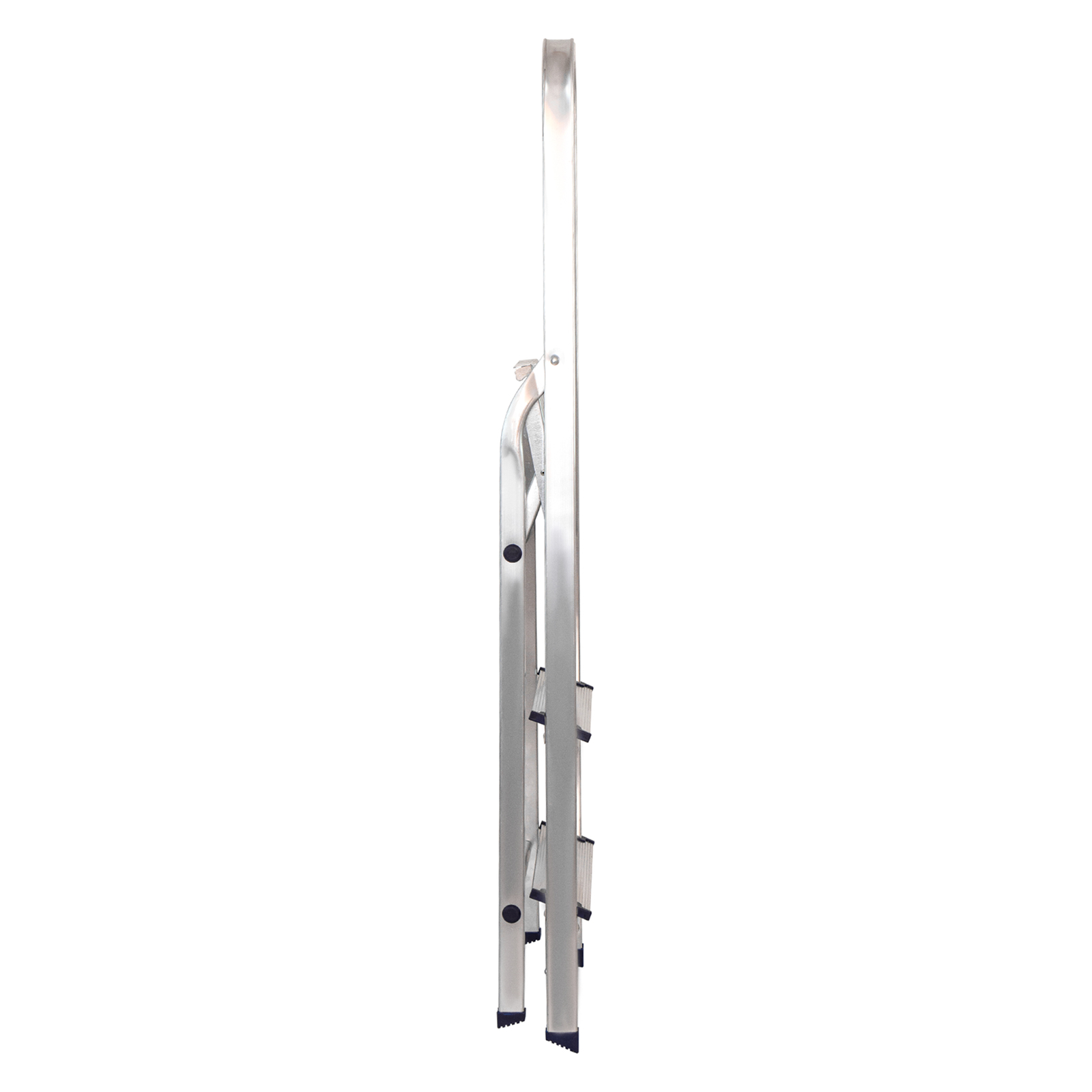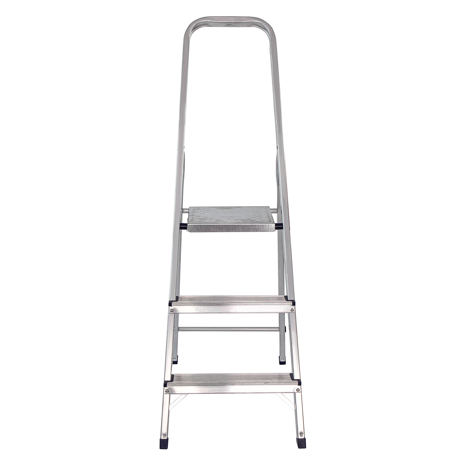 - Надежность — рама из прямоугольного алюминиевого профиля выдерживает нагрузку до 150 кг, широкие ступени закреплены заклепками.