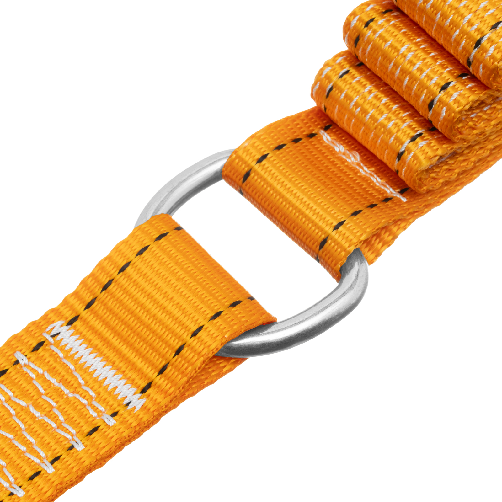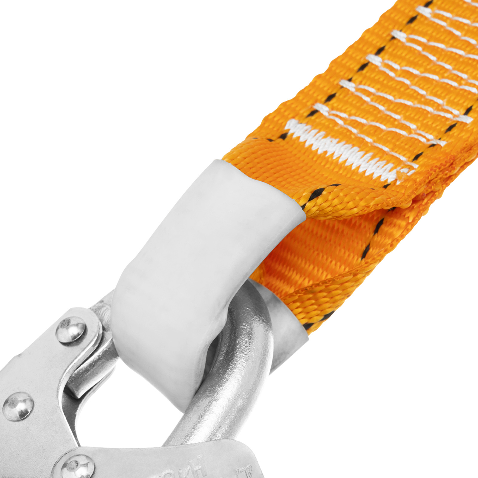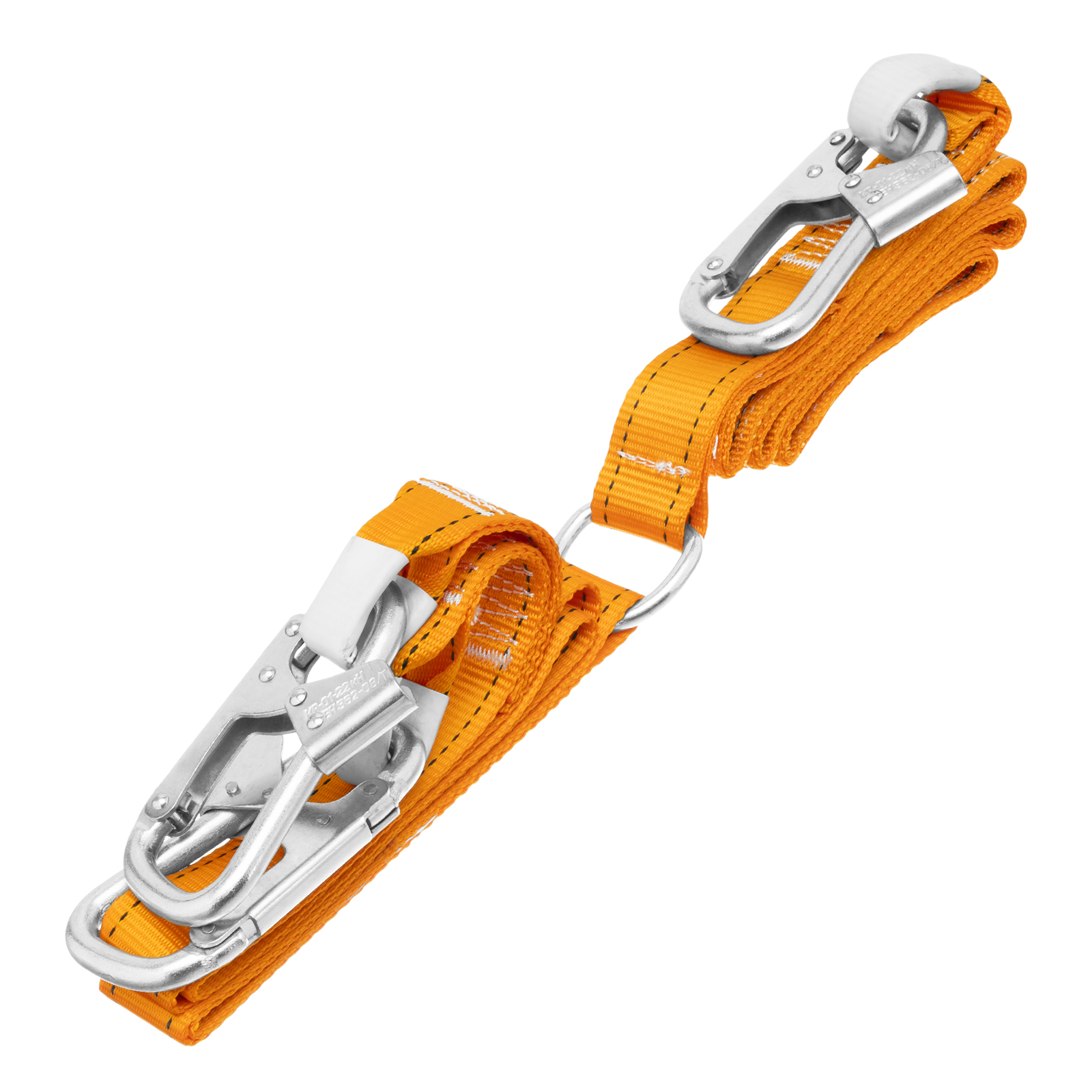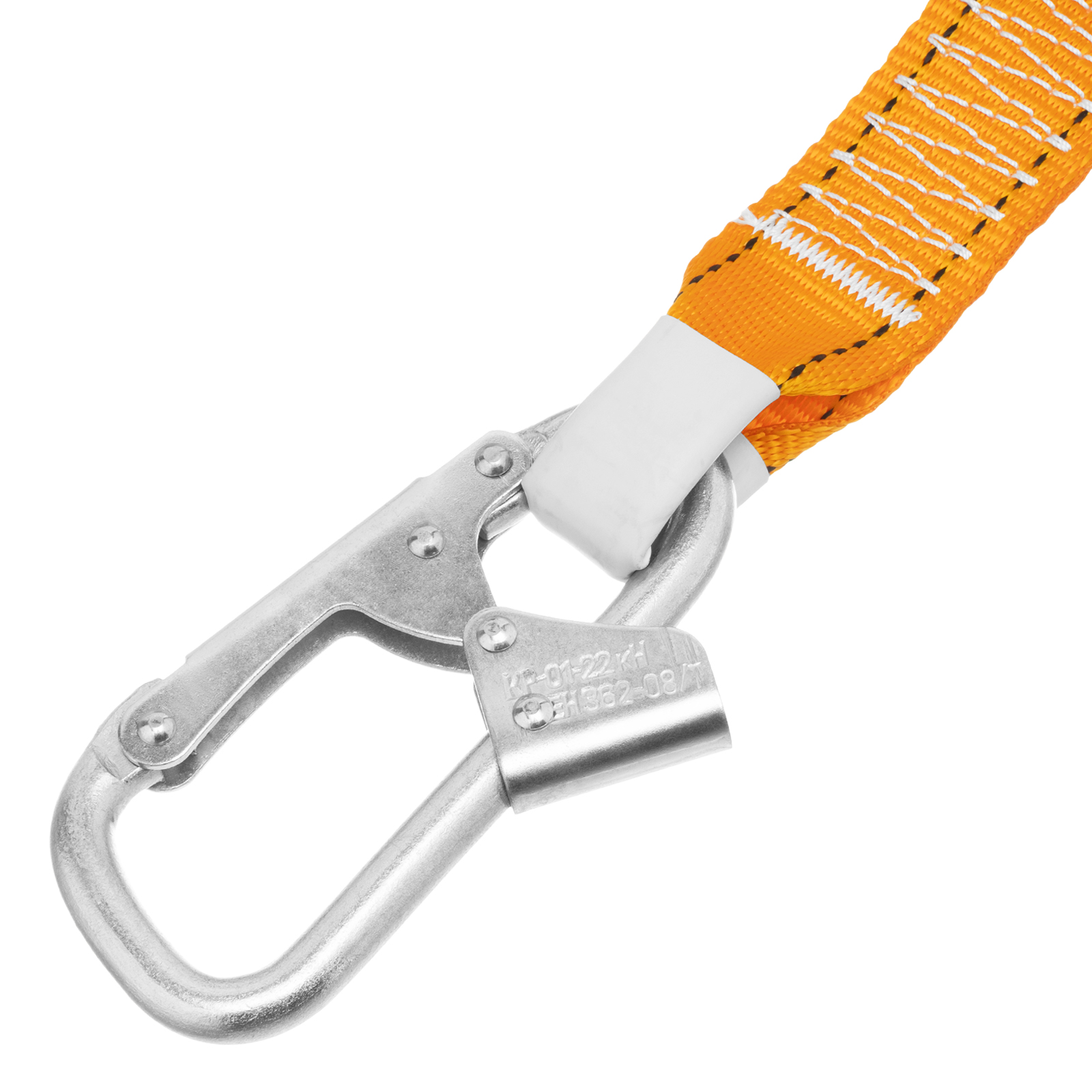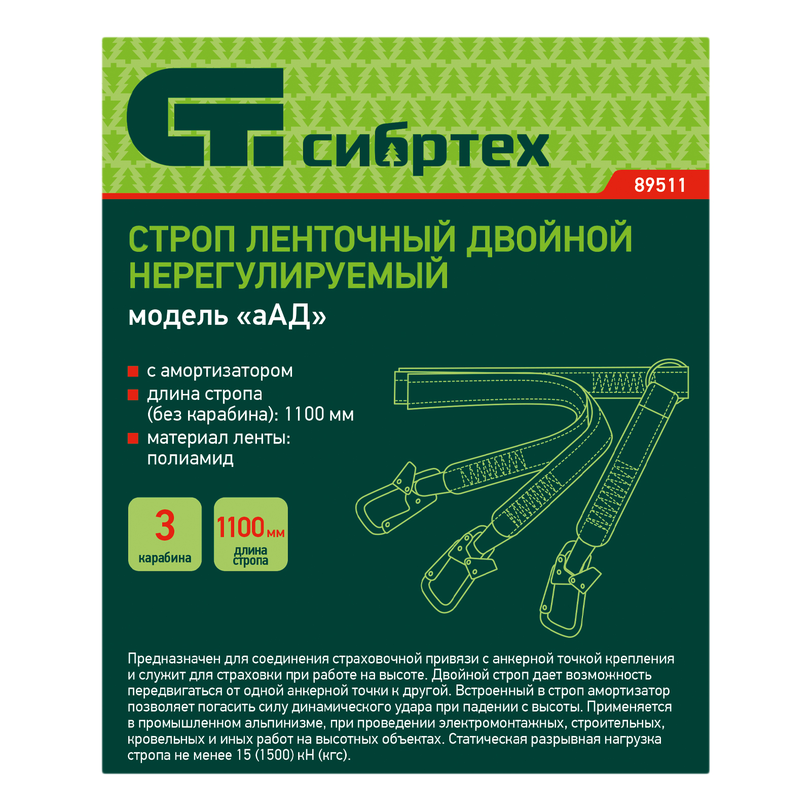 Ленточный двойной строп Сибртех 89511 с амортизатором, нерегулируемая модель «аАД», предназначен для соединения удерживающей (страховочной) привязи с анкерной точкой крепления. Используется совместно с удерживающими (страховочными) привязями, имеет 3 карабина, которые обеспечивают 3 точки крепления: 2 к анкерной точке и одну к поясу работника.