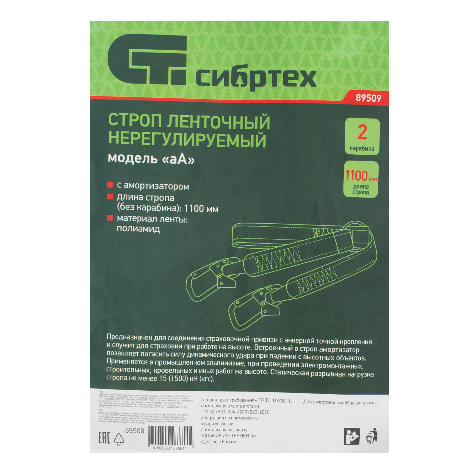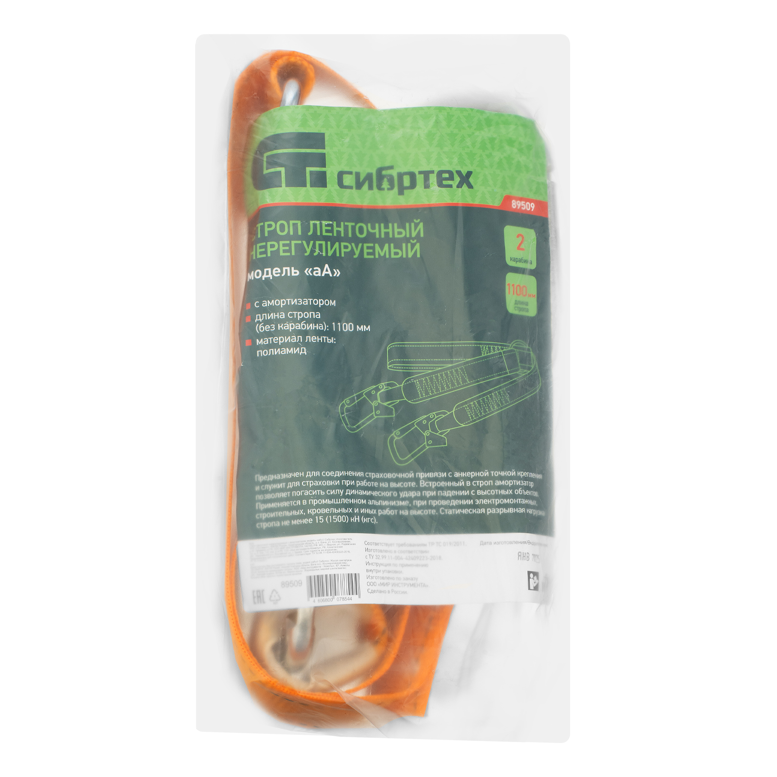 Ленточный нерегулируемый строп Сибртех 89509, модель «аА» с амортизатором, предназначен для соединения удерживающей (страховочной) привязи с анкерной точкой крепления. Применятся в ходе строительных, монтажных кровельных и других операций, когда необходимо обеспечить безопасность работника. Применение без страховочно-удерживающей привязи недопустимо.