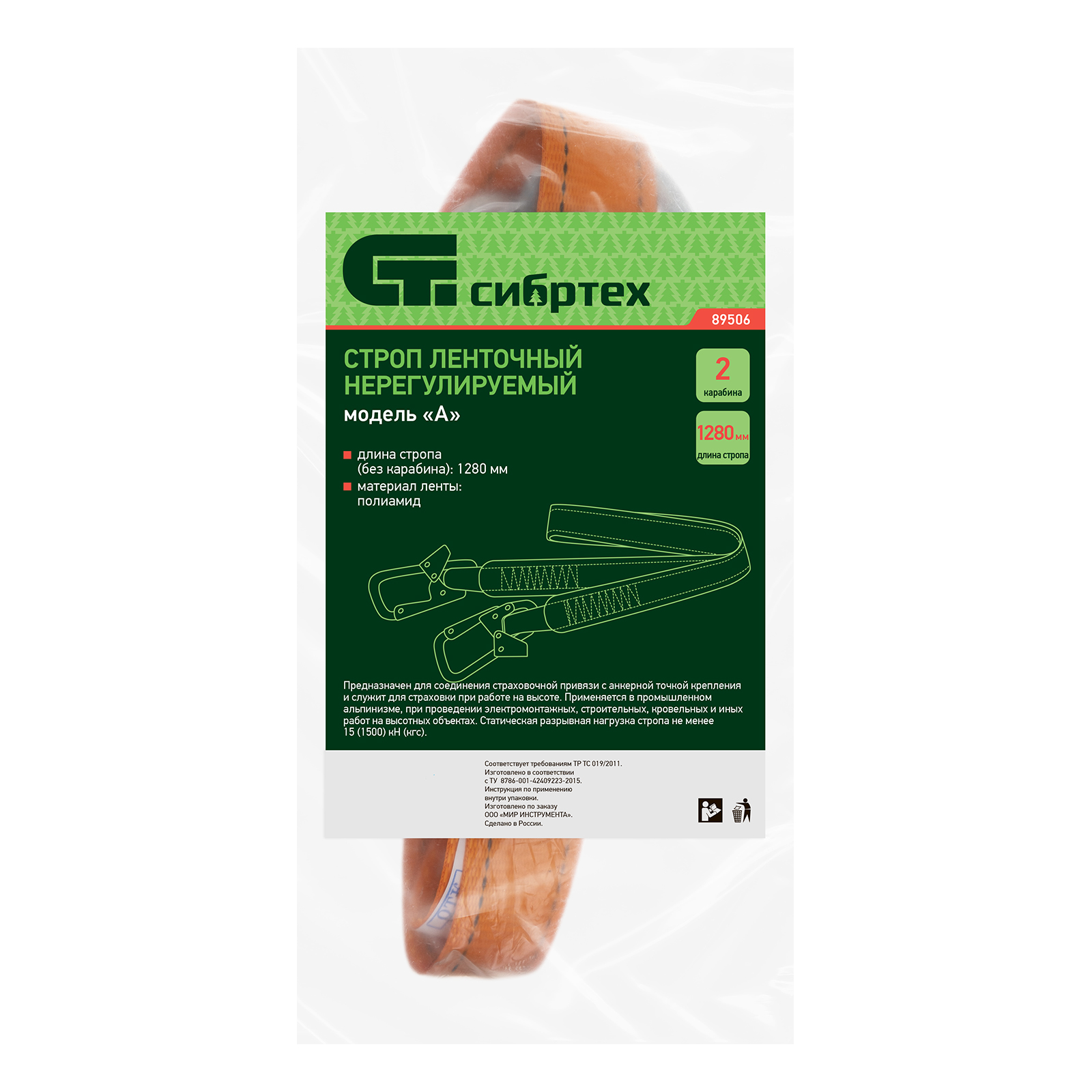Ленточный нерегулируемый строп Сибртех 89506, модель «А» с 2 карабинами, предназначен для соединения удерживающей (страховочной) привязи с анкерной точкой крепления. Позволяет предотвратить падение работника с высоты. Используется в ходе строительных, монтажных и других высотных работ.
