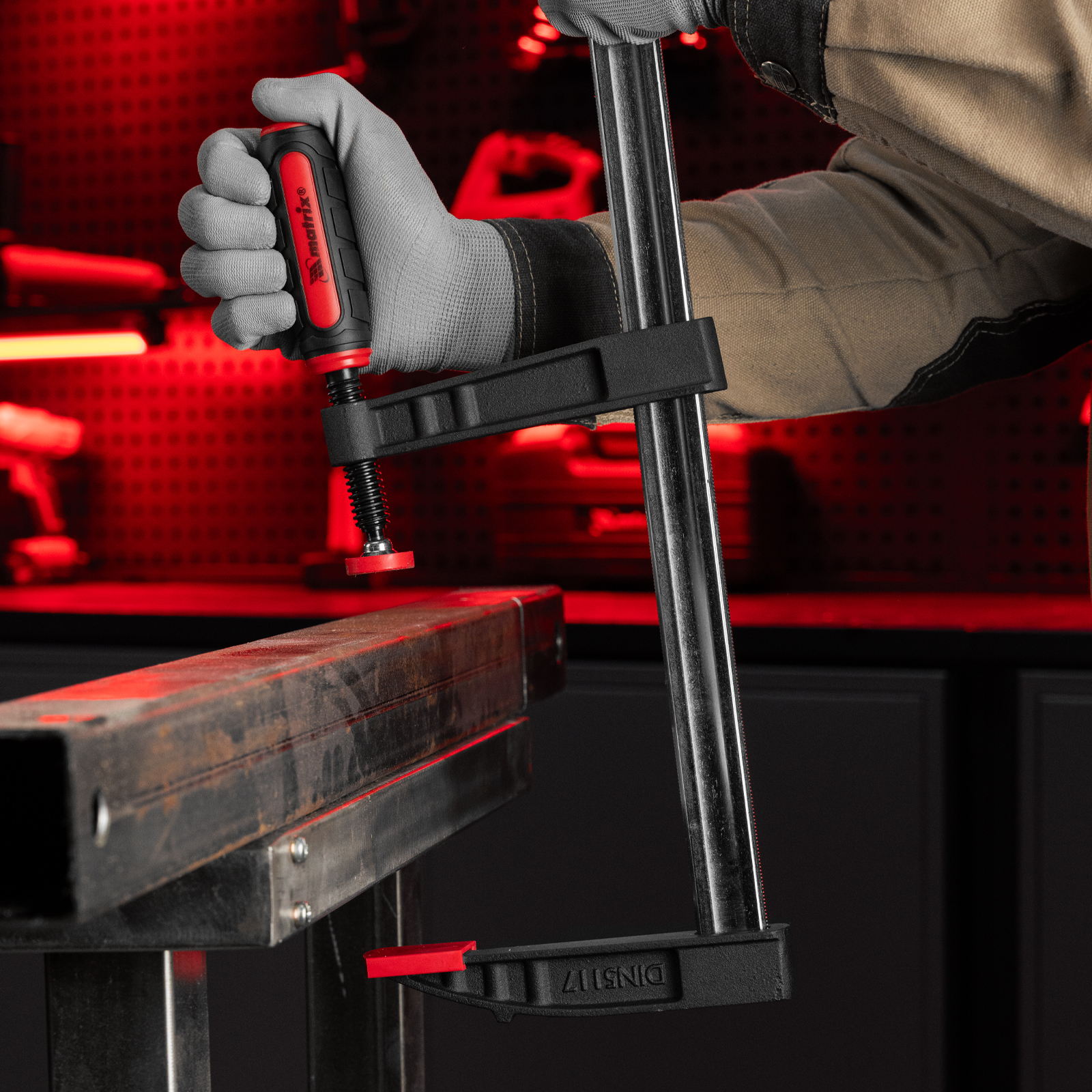 F-образная струбцина Matrix 20410 размером 1000 х 120 х 1100 мм используется для зажима металлических, деревянных и других заготовок для их последующей обработки или сборки. Представляет собой штангу, на которой установлено 2 кронштейна — неподвижный и подвижный. Деталь помещается между ними и прижимается к губкам при помощи винтового зажима с трапециевидной резьбой. Подвижный кронштейн позволяет регулировать величину захвата, которая может достигать 1000 мм. Струбцину применяют для выполнения слесарных и столярных работ.