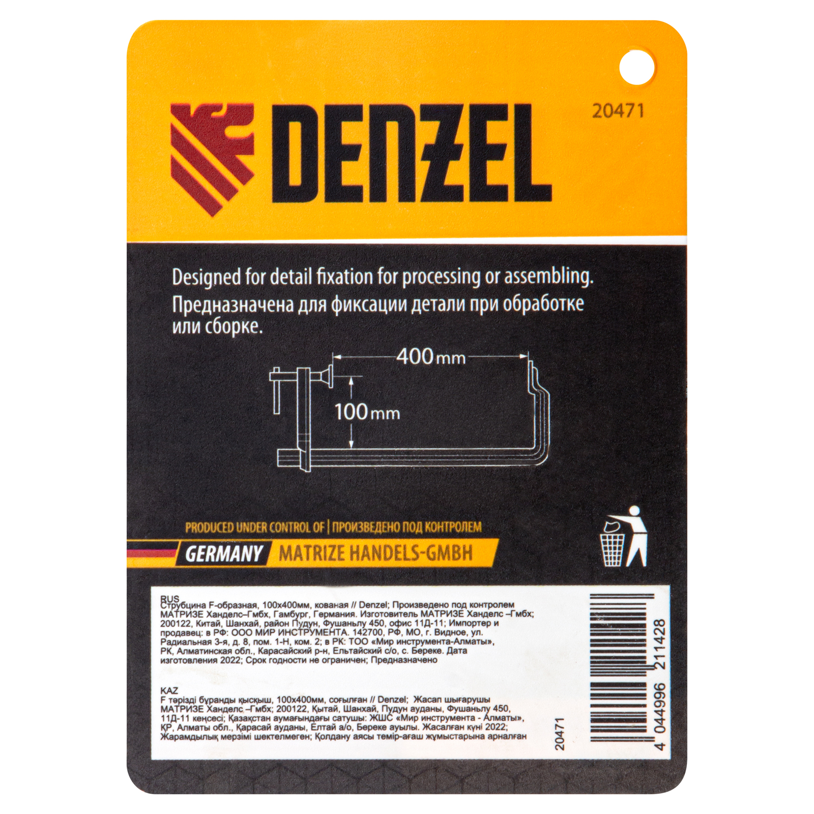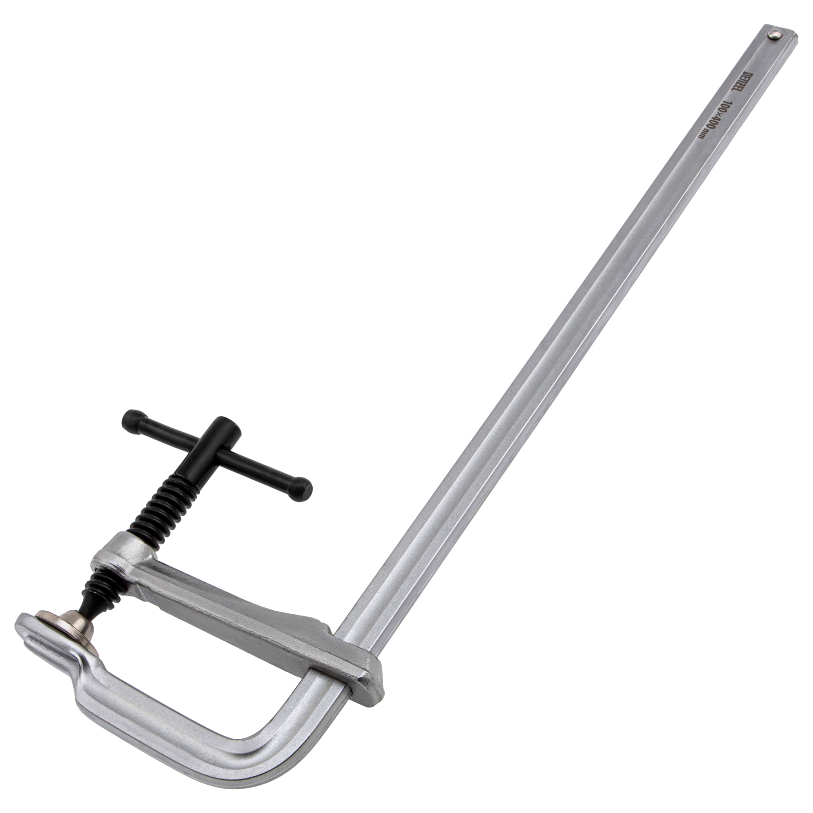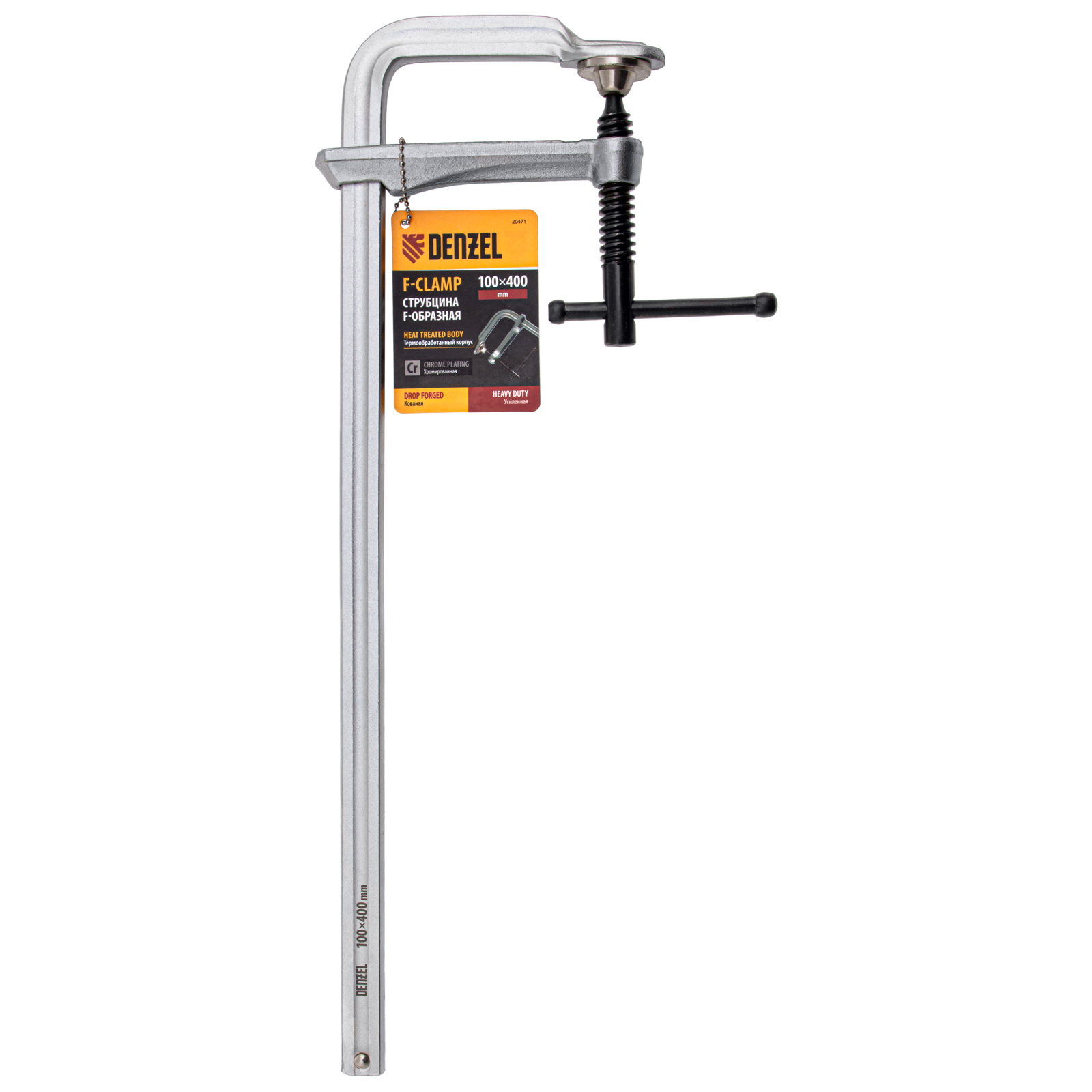 Кованая F-образная струбцина Denzel 20471 с глубиной зажима 100 мм, усиленная, предназначена для фиксации деталей шириной до 400 мм и материалов при проведении слесарных, столярных и сварочных работ. Тавровый профиль обеспечивает устойчивость конструкции к изгибу, что позволяет фиксировать детали со значительным усилием. Струбцина подходит для профессионального применения.