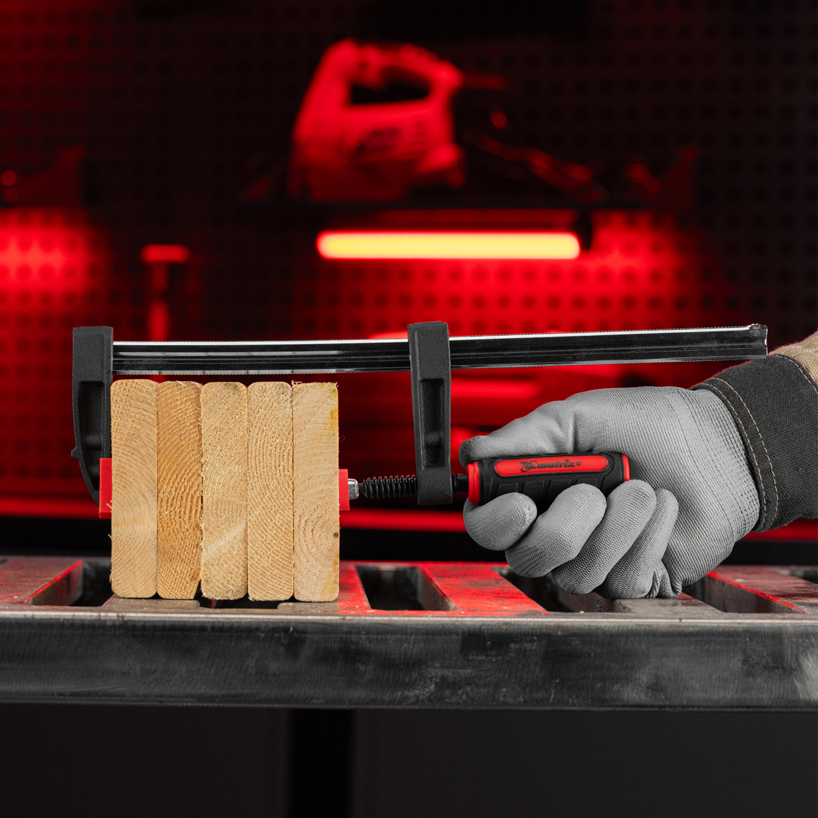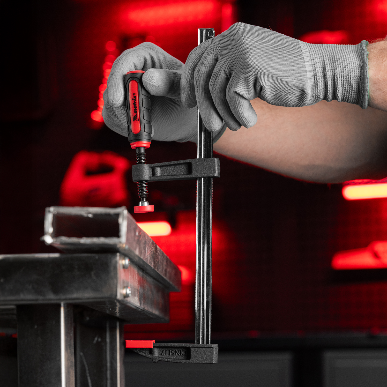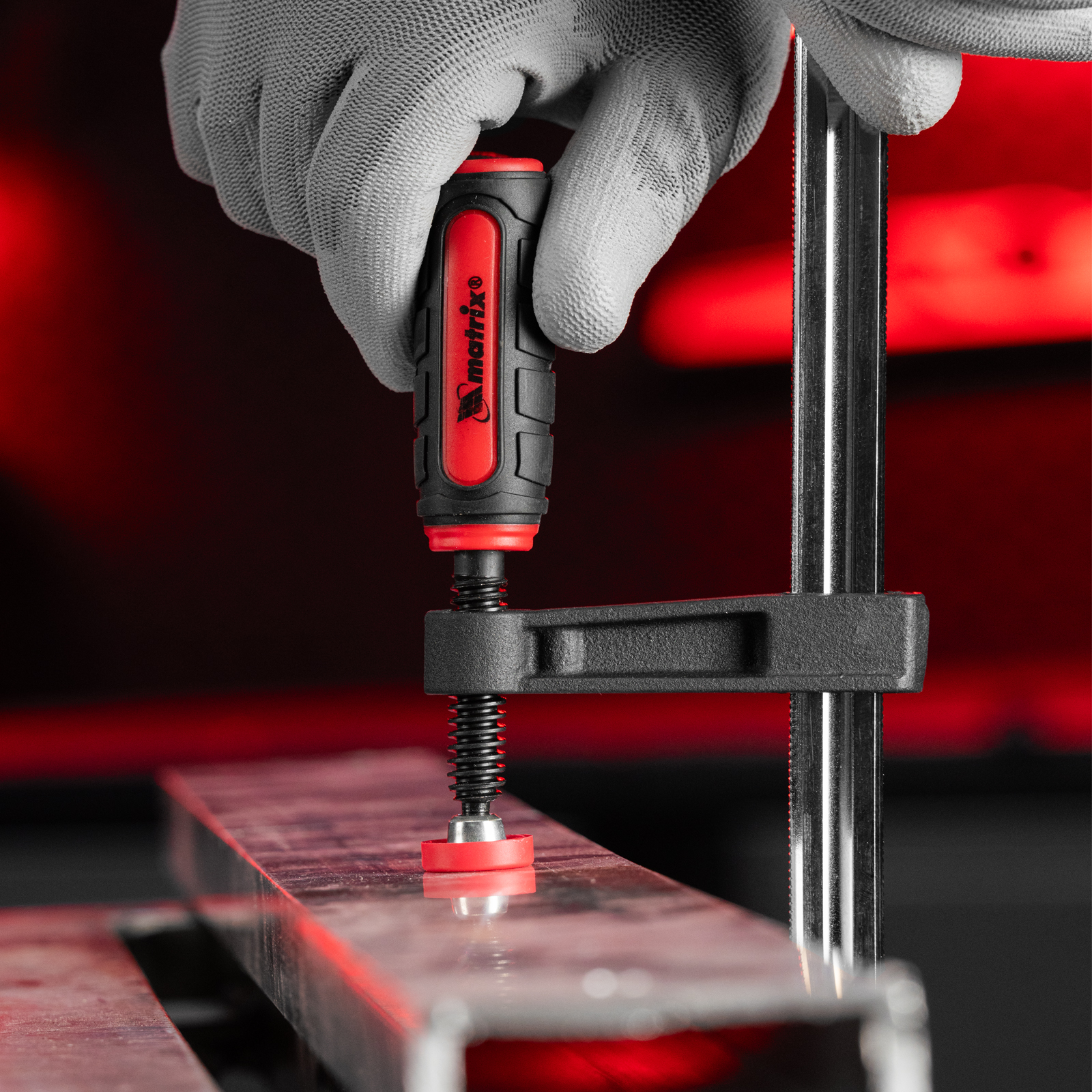 F-образная струбцина Matrix 20404 размером 250 х 50 х 310 мм используется для зажима металлических, деревянных и других заготовок для их последующей обработки или сборки. Представляет собой штангу, на которой установлено 2 кронштейна — неподвижный и подвижный. Деталь помещается между ними и прижимается к губкам при помощи винтового зажима с трапециевидной резьбой. Подвижный кронштейн позволяет регулировать величину захвата, которая может достигать 250 мм. Струбцину применяют для выполнения слесарных и столярных работ.