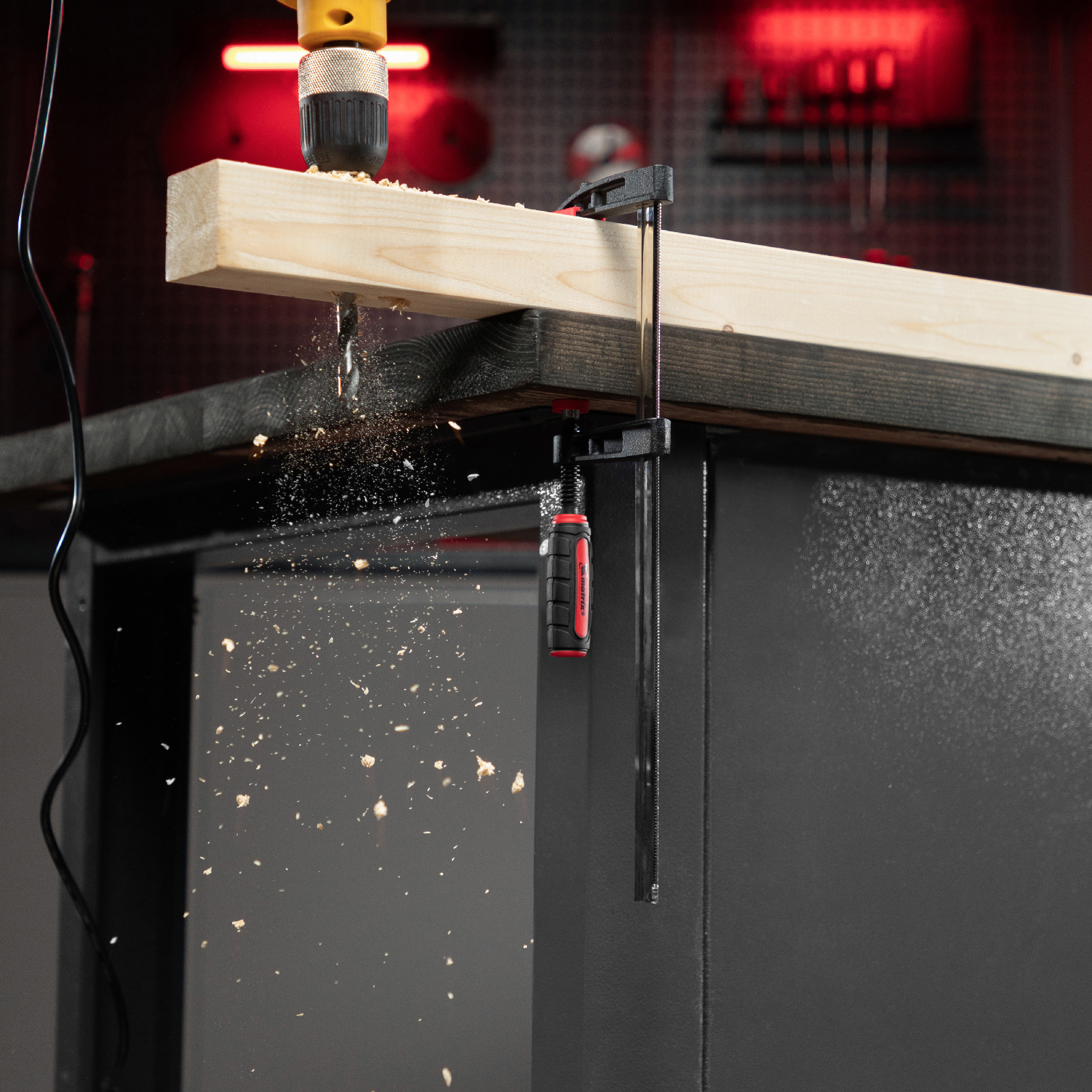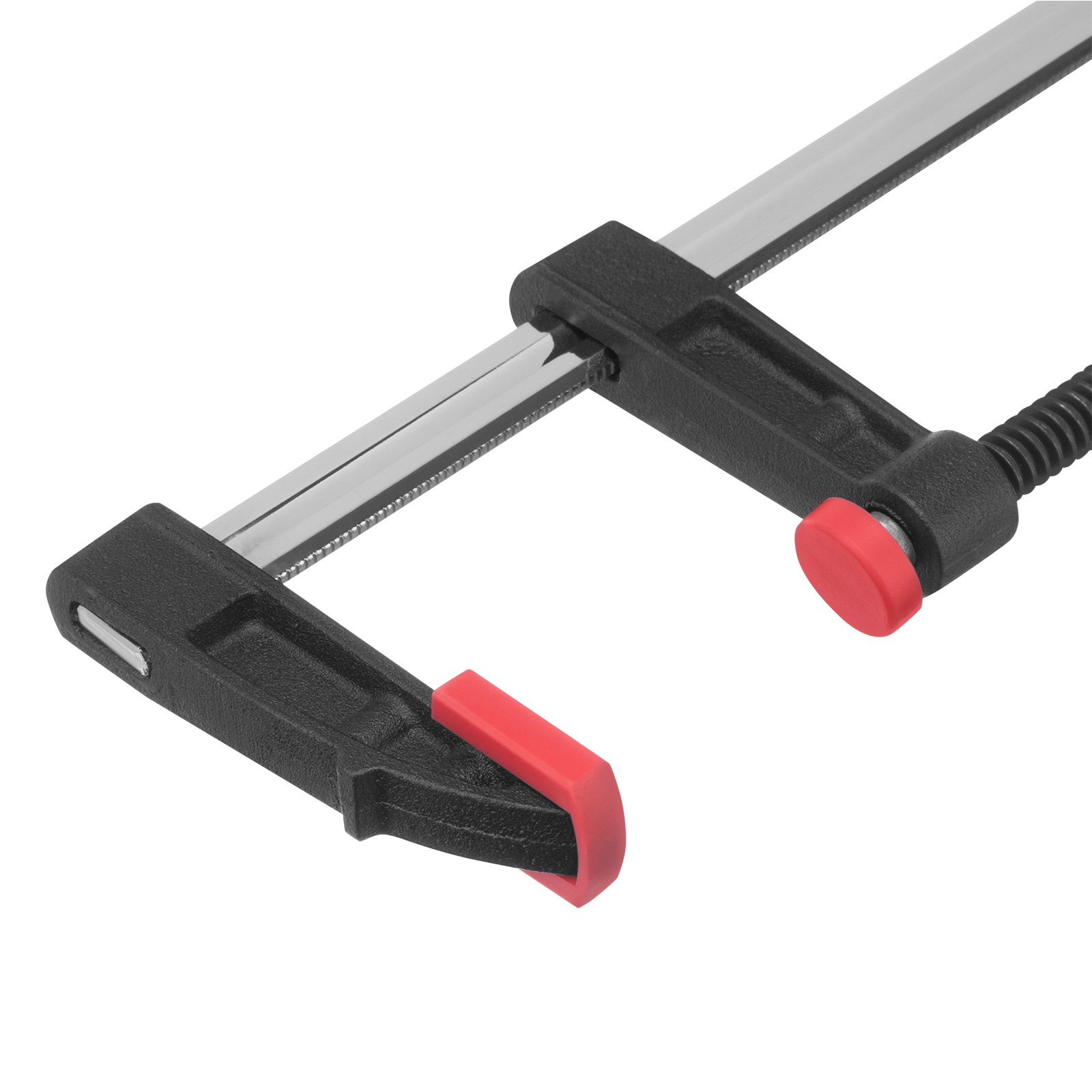 F-образная струбцина Matrix 20405 размером 300 х 50 х 370 мм используется для зажима металлических, деревянных и других заготовок для их последующей обработки или сборки. Представляет собой штангу, на которой установлено 2 кронштейна — неподвижный и подвижный. Деталь помещается между ними и прижимается к губкам при помощи винтового зажима с трапециевидной резьбой. Подвижный кронштейн позволяет регулировать величину захвата, которая может достигать 300 мм. Струбцину применяют для выполнения слесарных и столярных работ.