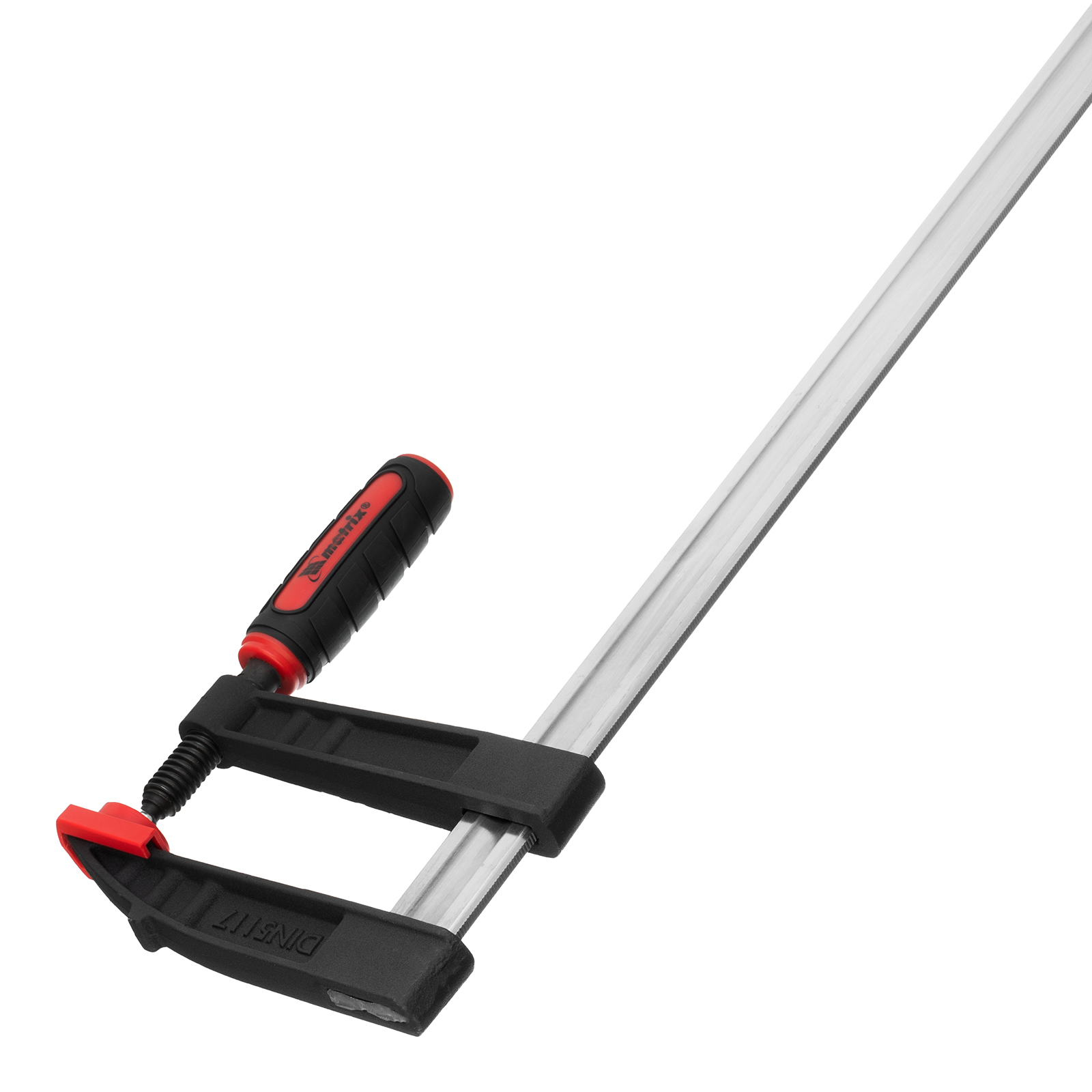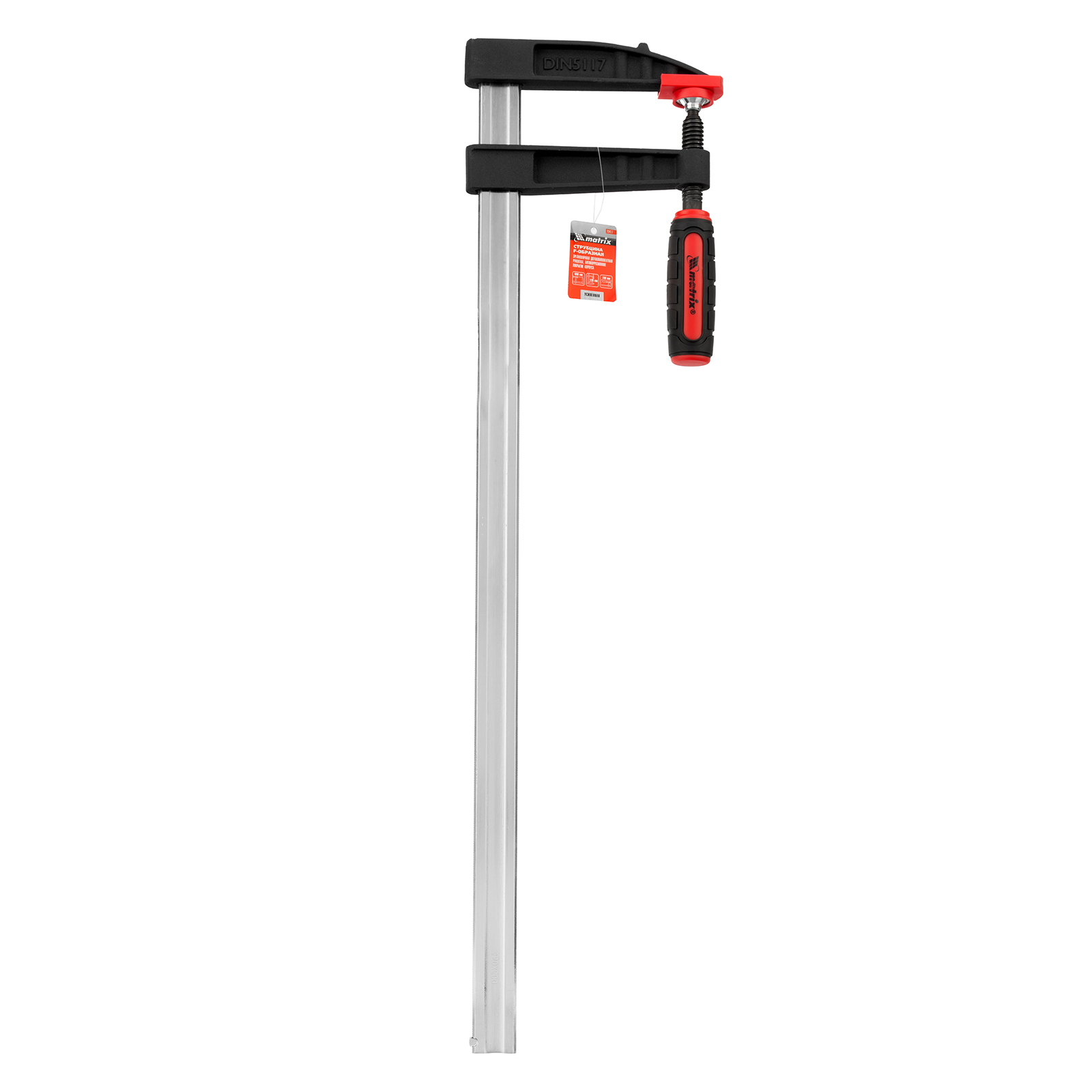 Усиленная F-образная струбцина Matrix 20417 размером 600 х 120 х 700 мм используется для зажима металлических, деревянных и других заготовок для их последующей обработки или сборки. Представляет собой штангу, на которой установлены 2 кронштейна — неподвижный и подвижный. Деталь помещается между ними и прижимается к губкам при помощи винтового зажима с трапециевидной резьбой. Величина захвата регулируется при помощи подвижного кронштейна и может достигать 200 мм. Струбцину используют для проведения слесарных и столярных работ. Металлическая конструкция выдерживает высокую температуру, поэтому инструмент пригодится для выполнения сварочных работ (перед началом необходимо снять пластиковые накладки с губок).