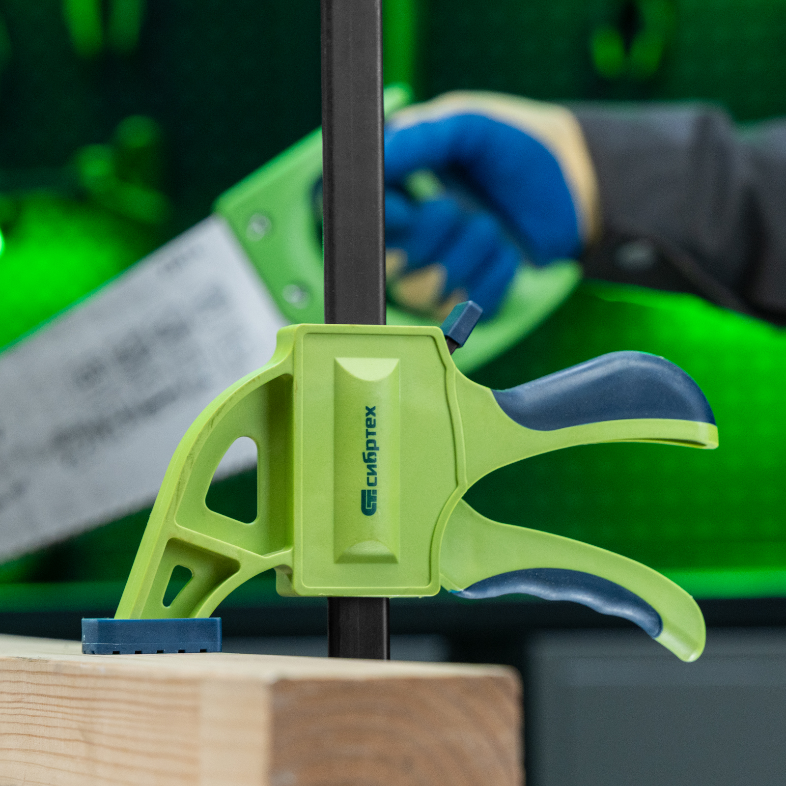 F-образная быстрозажимная струбцина Сибртех 20567 длиной 820 мм, с шириной и глубиной зажима 600 и 70 мм соответственно, в пластиковом корпусе, с фиксатором и двухкомпонентной рукояткой, позволяет зажимать заготовки для их дальнейшей обработки или сборки. Помогает решать множество задач благодаря оптимальной глубине зажима. Пластинчатый механизм пошагово перемещает подвижную губку вдоль направляющей до достижения максимально плотного захвата детали. Фиксатор препятствует движению губки в обратную сторону. Струбцина пригодится в столярной мастерской, а также будет полезна в быту.