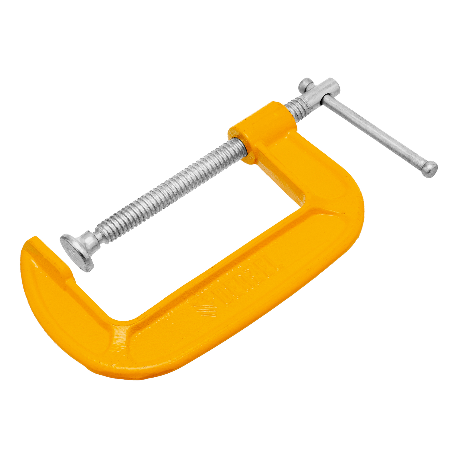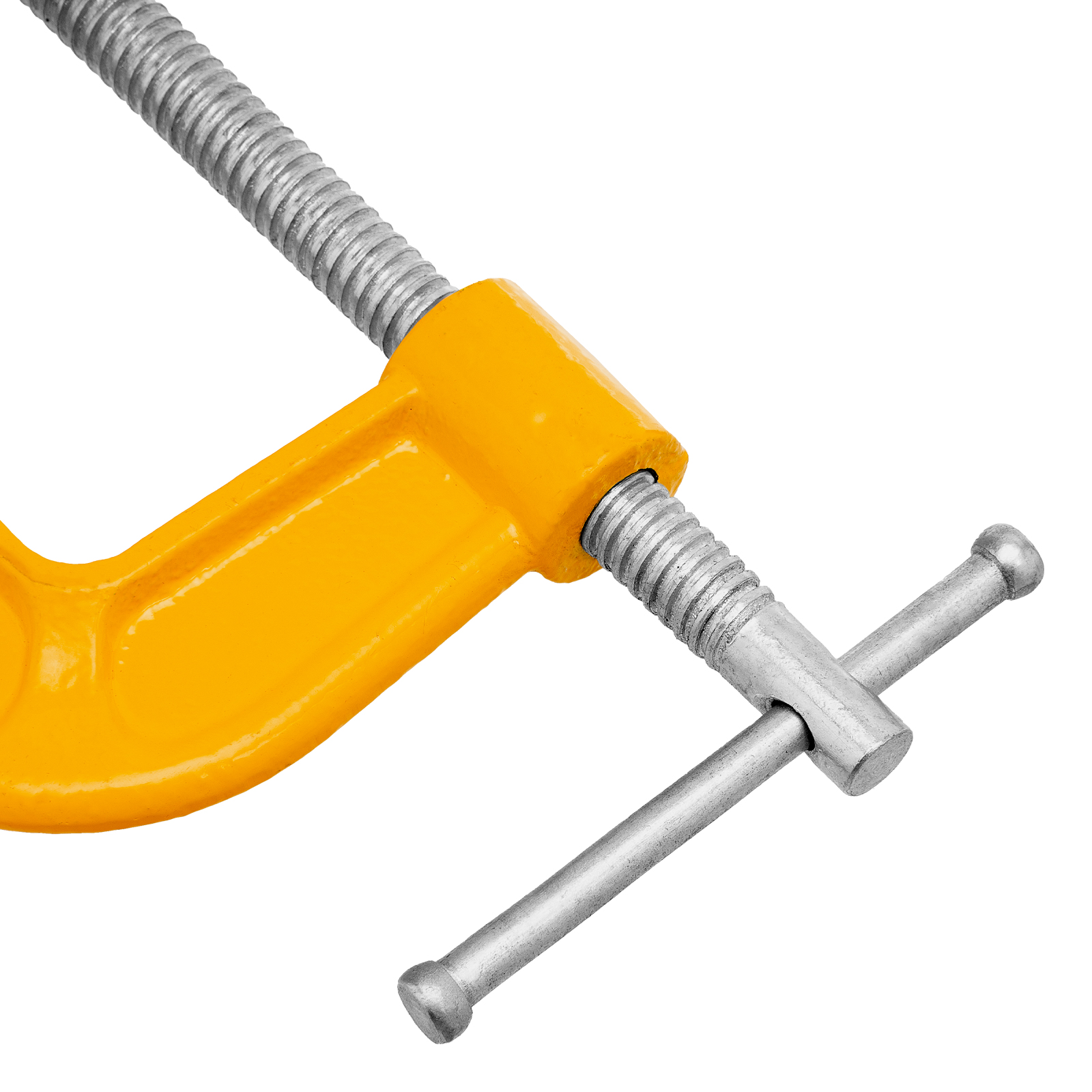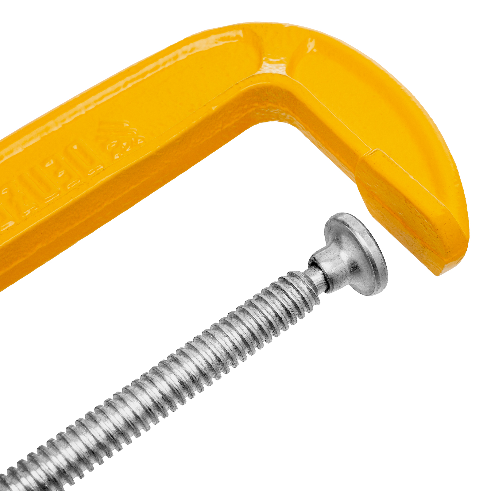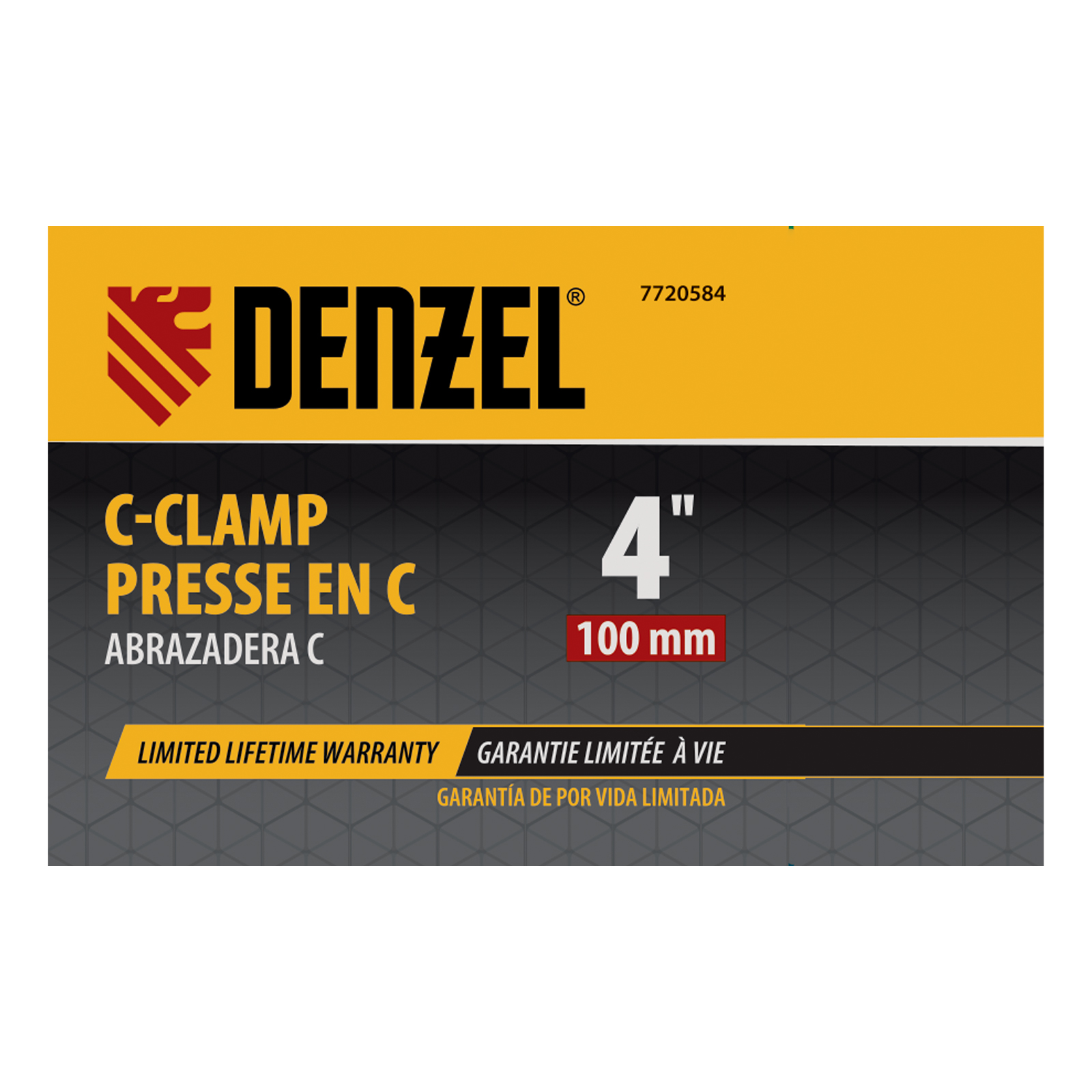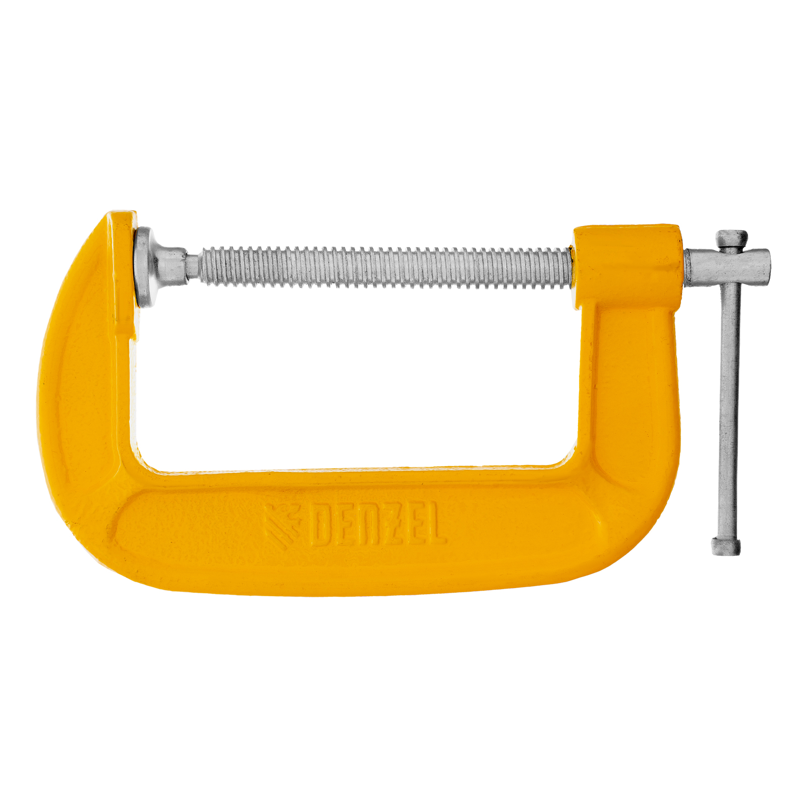 G-образная струбцина Denzel 7720584 с шириной захвата 4″ (100 мм) позволяет зажимать заготовки, фиксировать их на верстаке или станке. Упрощает склеивание деревянных деталей, а также сверление, резание и опиливание заготовок. Может использоваться во время сварочных работ. Струбцина применяется для металлообработки, востребована в столярном и слесарном деле, будет полезна в быту.