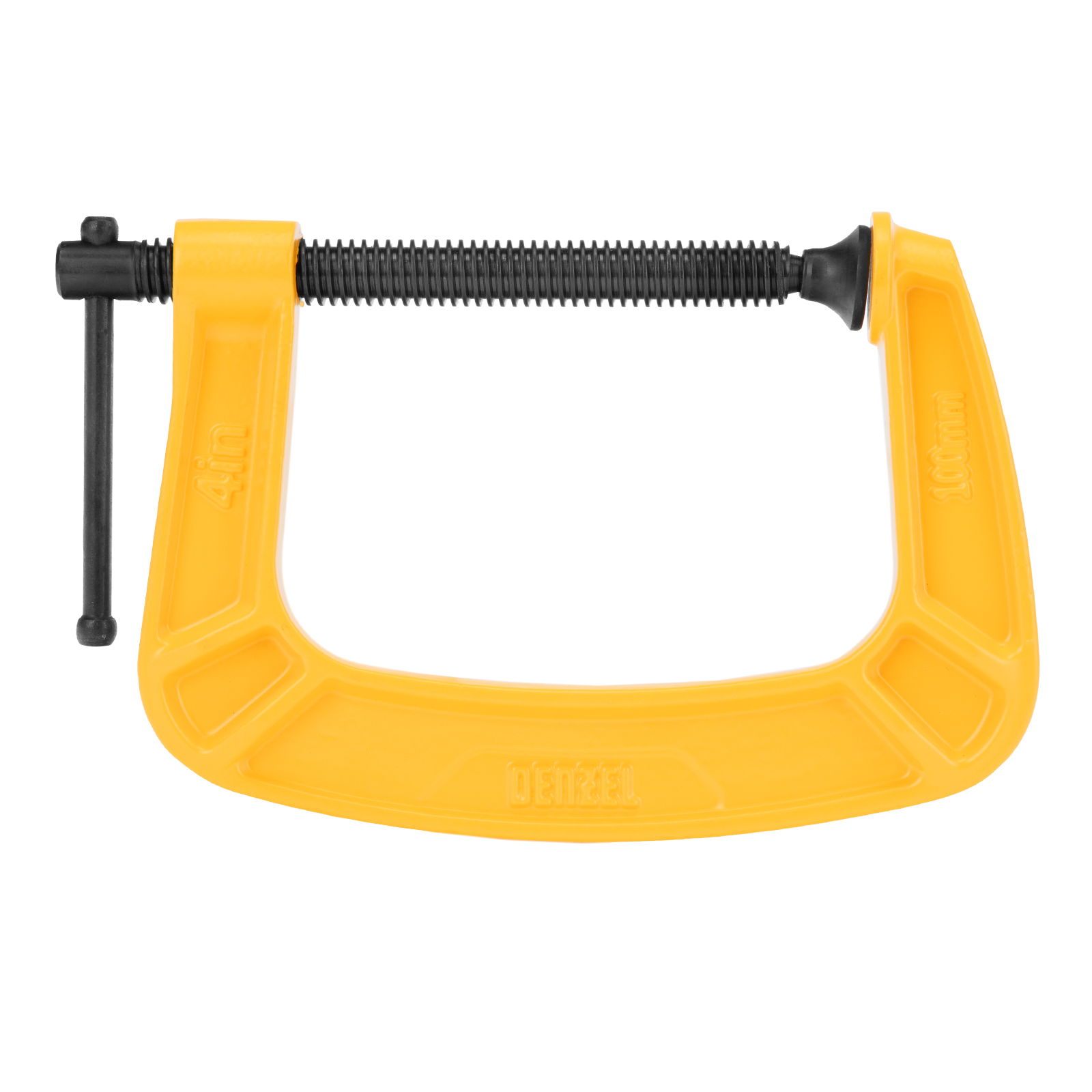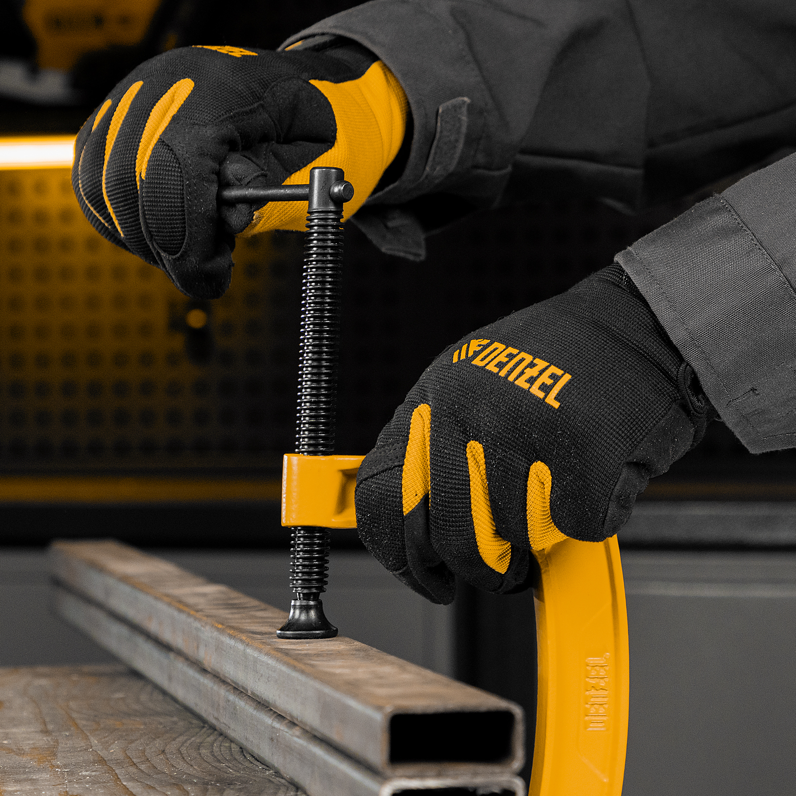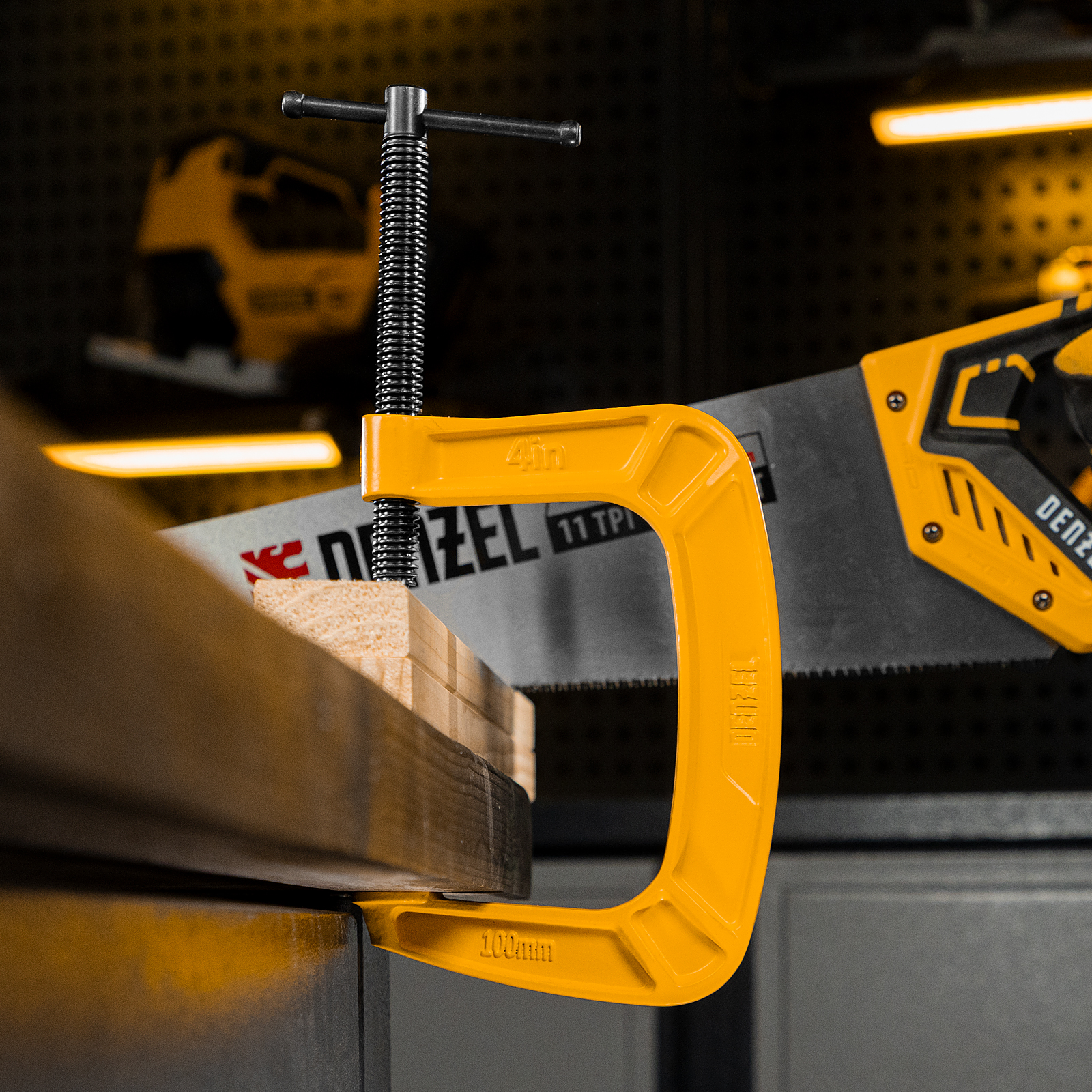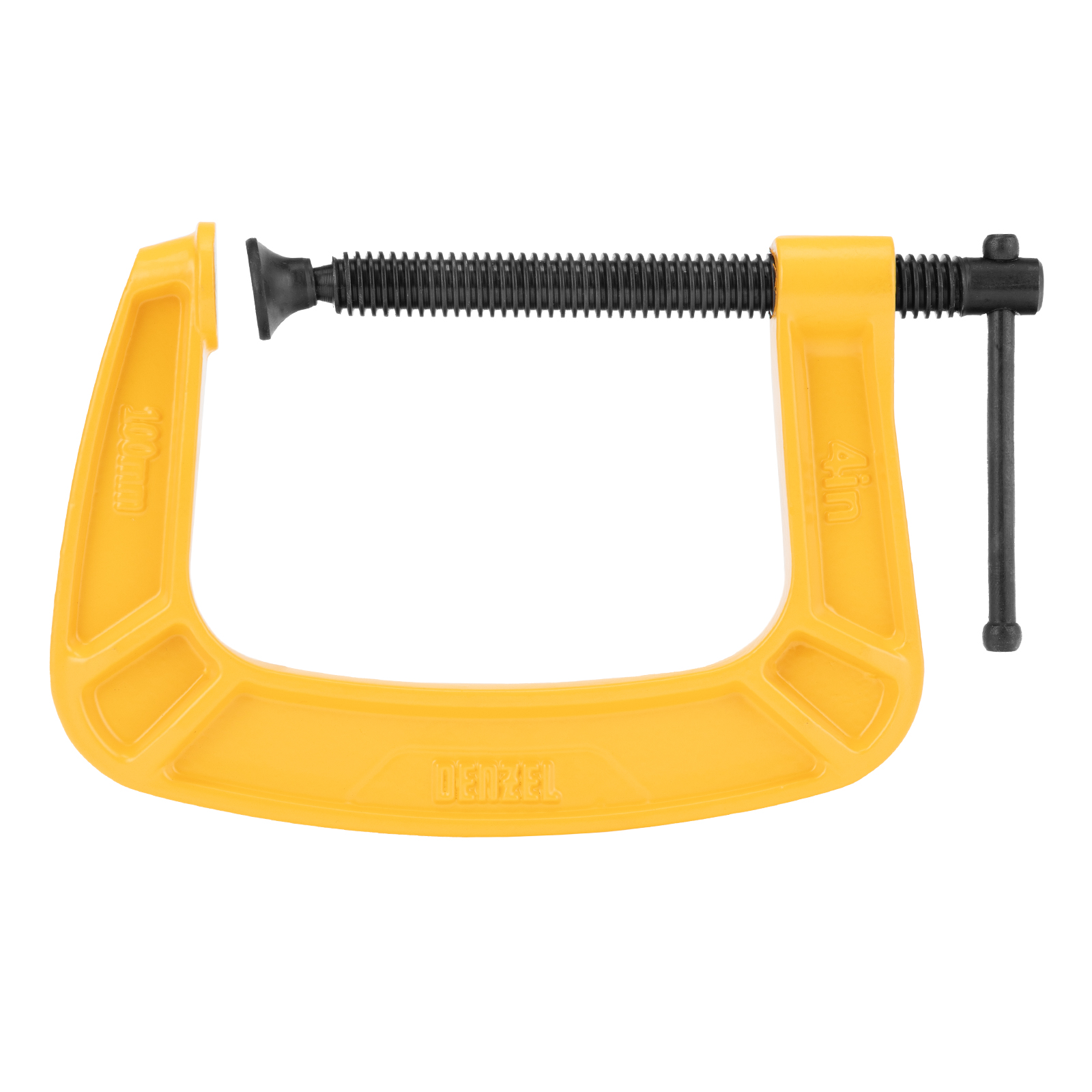 G-образная струбцина Denzel 20643 с максимальной шириной зажима 100 мм используется для фиксации заготовок или закрепления их на верстаке, станке или между собой. Позволяет склеивать детали, а также сверлить их, шлифовать, опиливать и проводить другие работы. Может использоваться во время выполнения сварочных работ. Винт с трапециевидной резьбой обеспечивает надежную фиксацию предметов. Струбцина применяется в слесарном и столярном деле, будет полезна также домашнем хозяйстве.