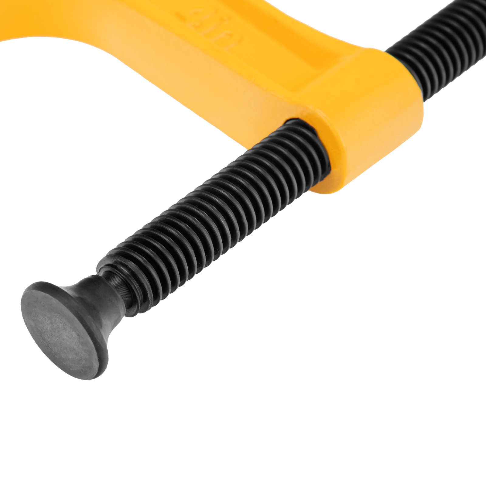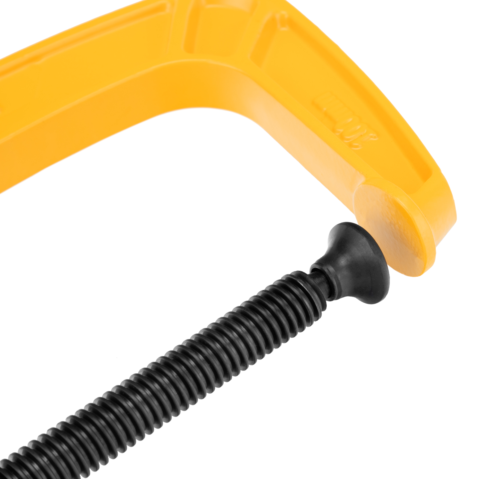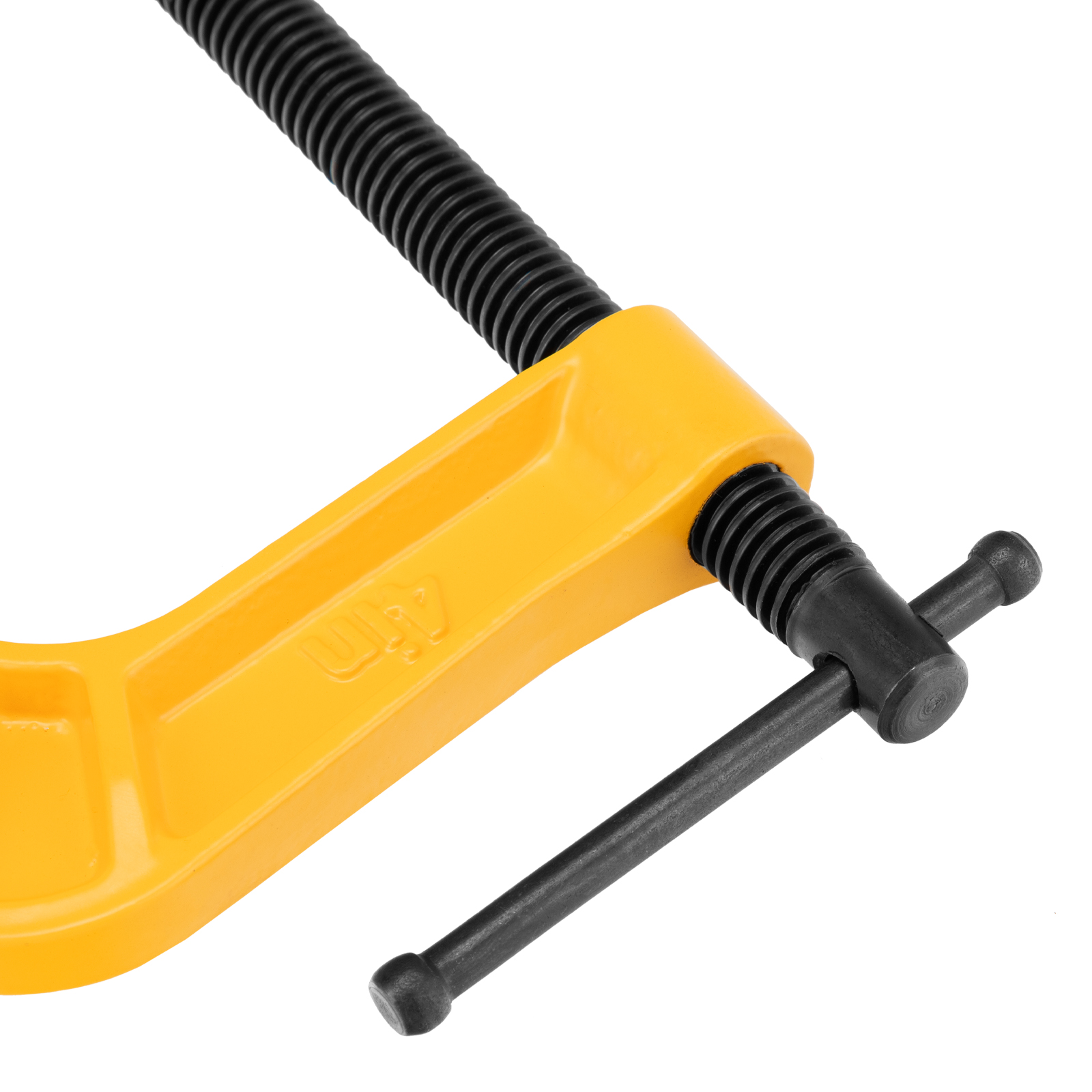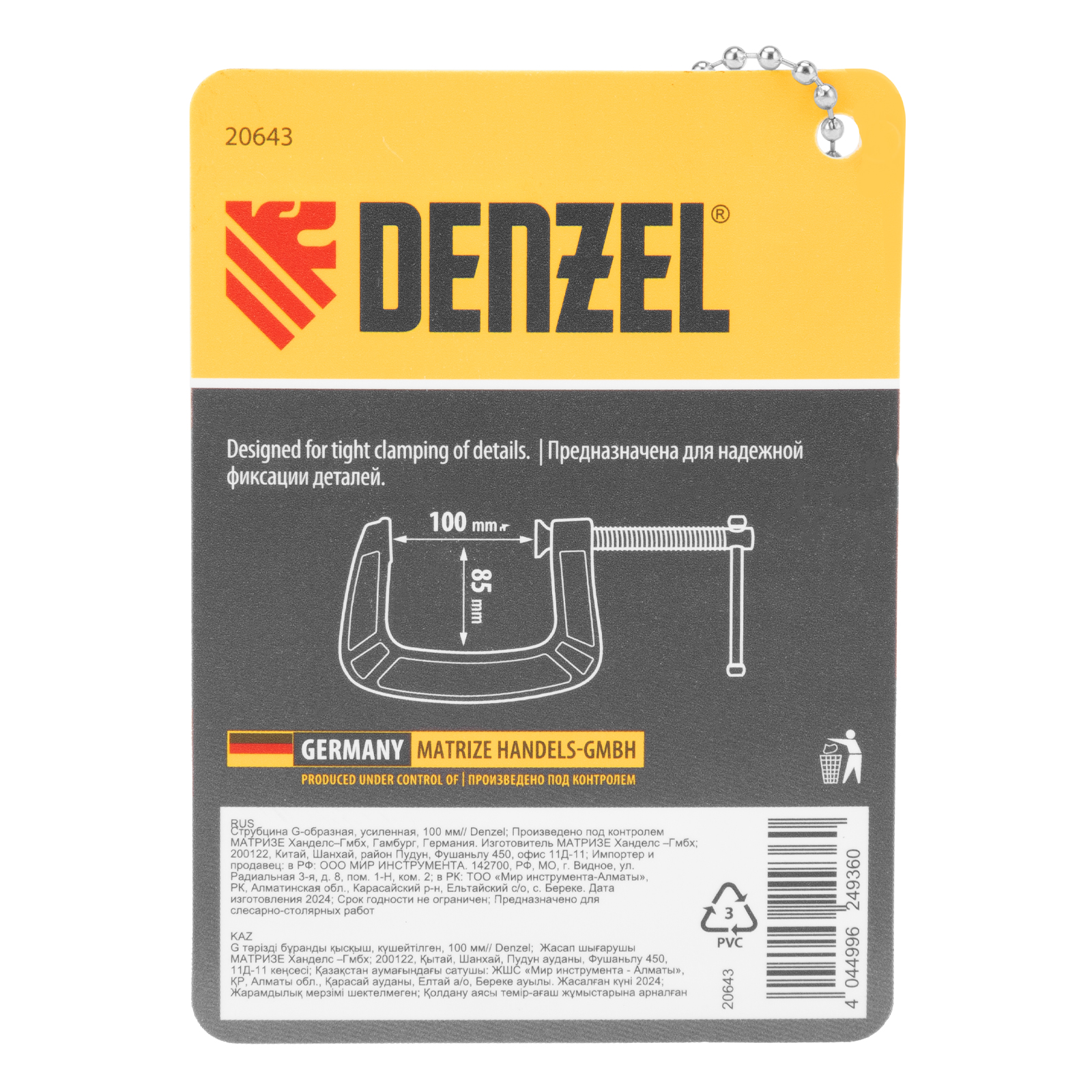 G-образная струбцина Denzel 20643 с максимальной шириной зажима 100 мм используется для фиксации заготовок или закрепления их на верстаке, станке или между собой. Позволяет склеивать детали, а также сверлить их, шлифовать, опиливать и проводить другие работы. Может использоваться во время выполнения сварочных работ. Винт с трапециевидной резьбой обеспечивает надежную фиксацию предметов. Струбцина применяется в слесарном и столярном деле, будет полезна также домашнем хозяйстве.