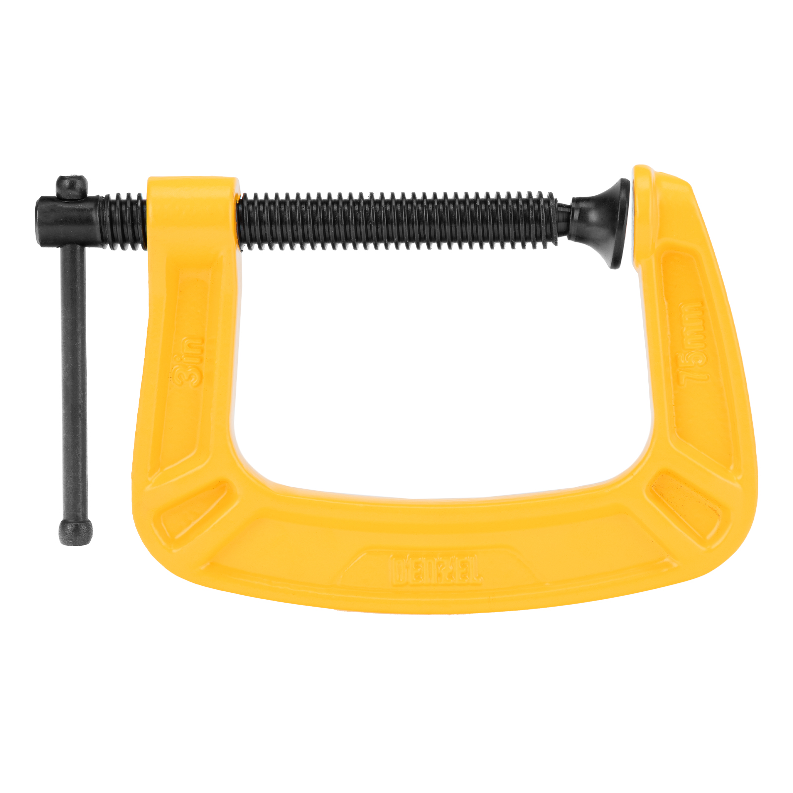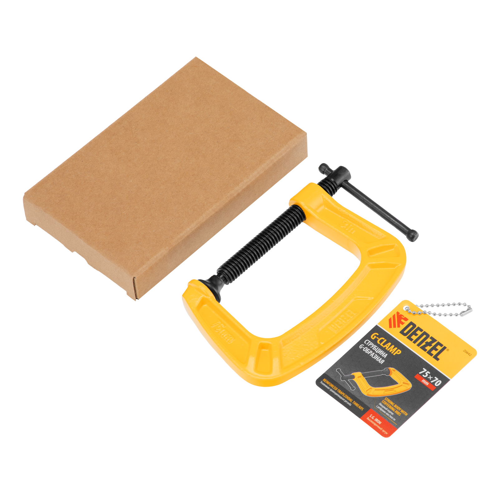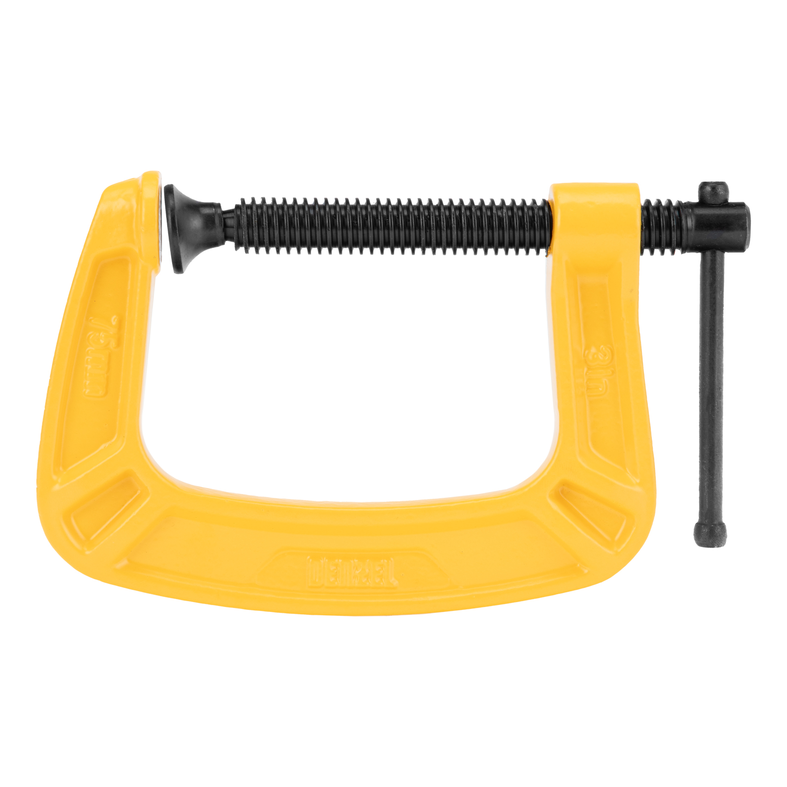 G-образная струбцина Denzel 20642 с максимальной шириной зажима 75 мм используется для фиксации заготовок или закрепления их на верстаке, станке или между собой. Позволяет склеивать детали, а также сверлить их, шлифовать, опиливать и проводить другие работы. Может использоваться во время выполнения сварочных работ. Винт с трапециевидной резьбой обеспечивает надежную фиксацию предметов. Струбцина применяется в слесарном и столярном деле, будет полезна также домашнем хозяйстве.