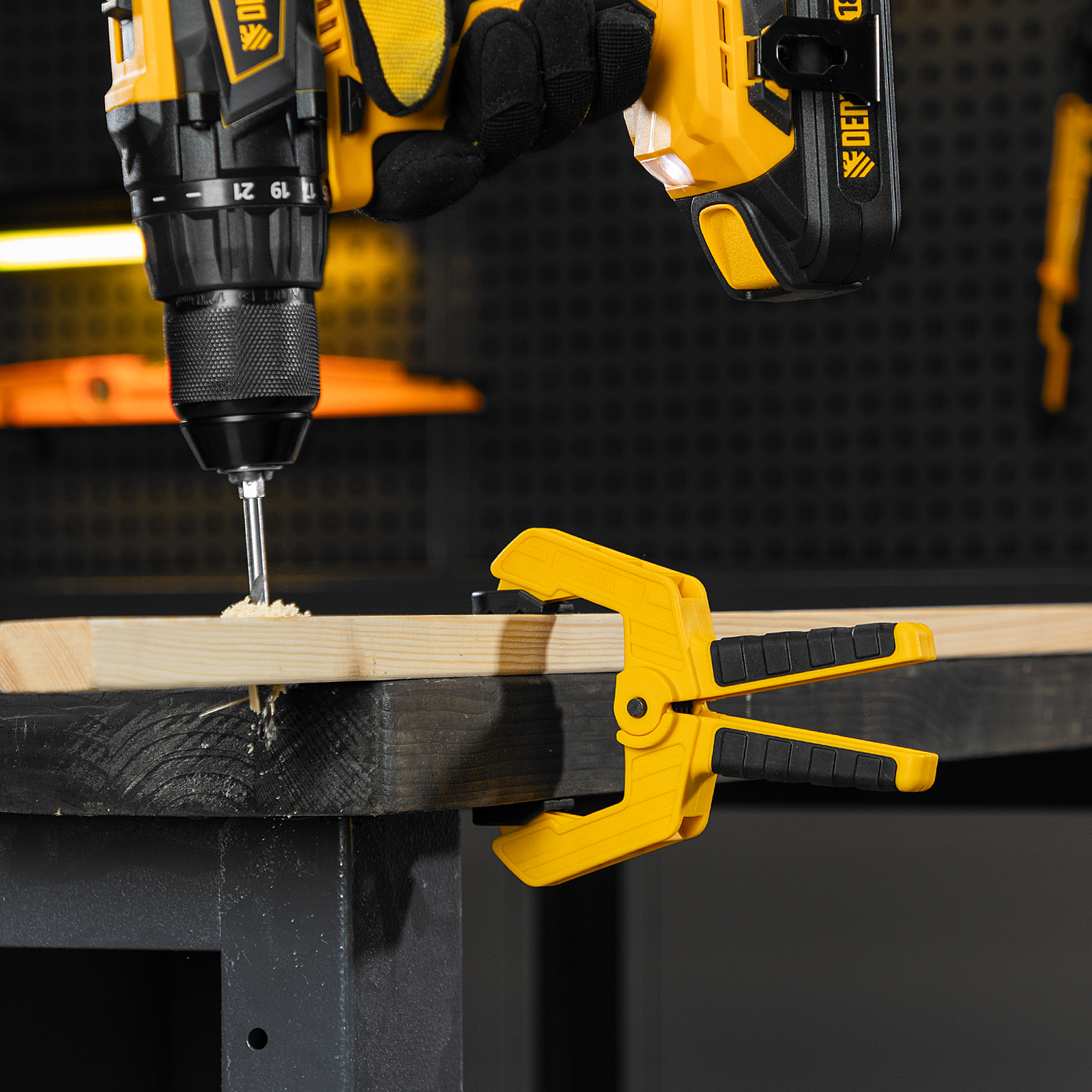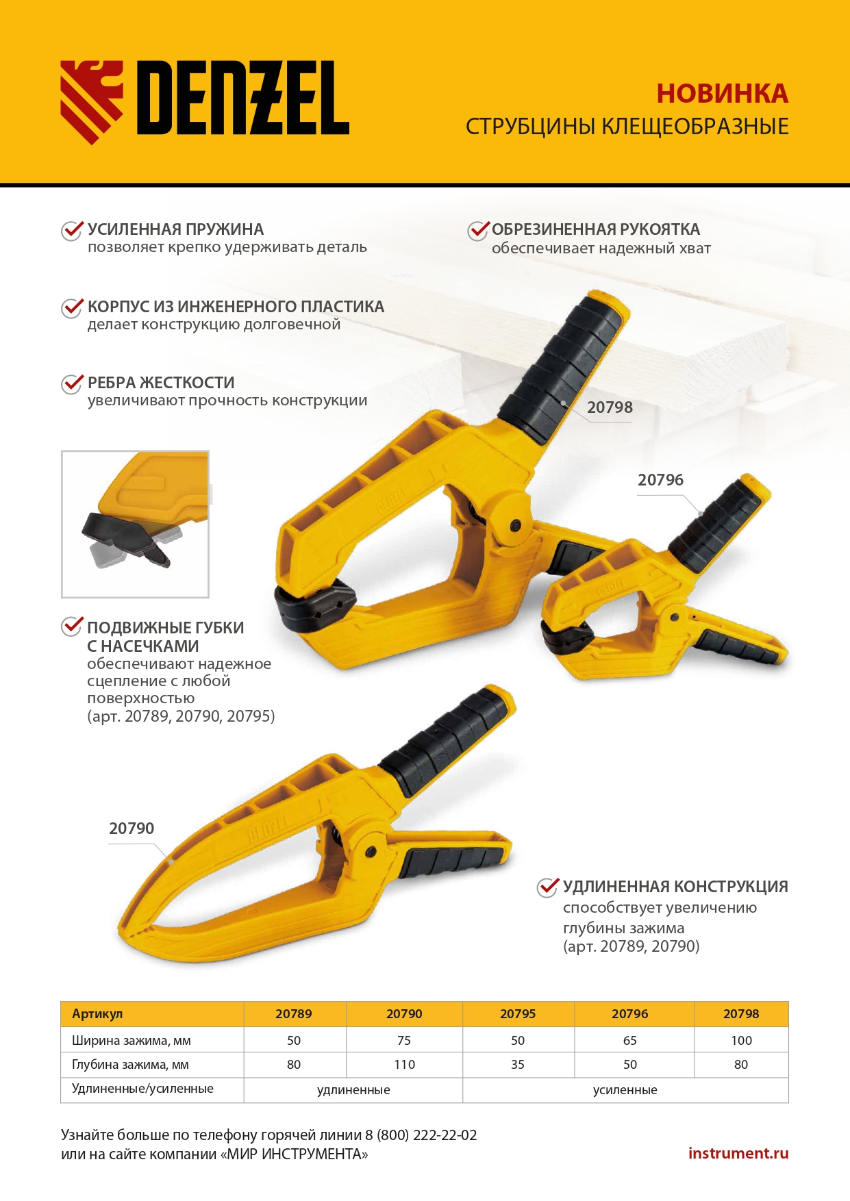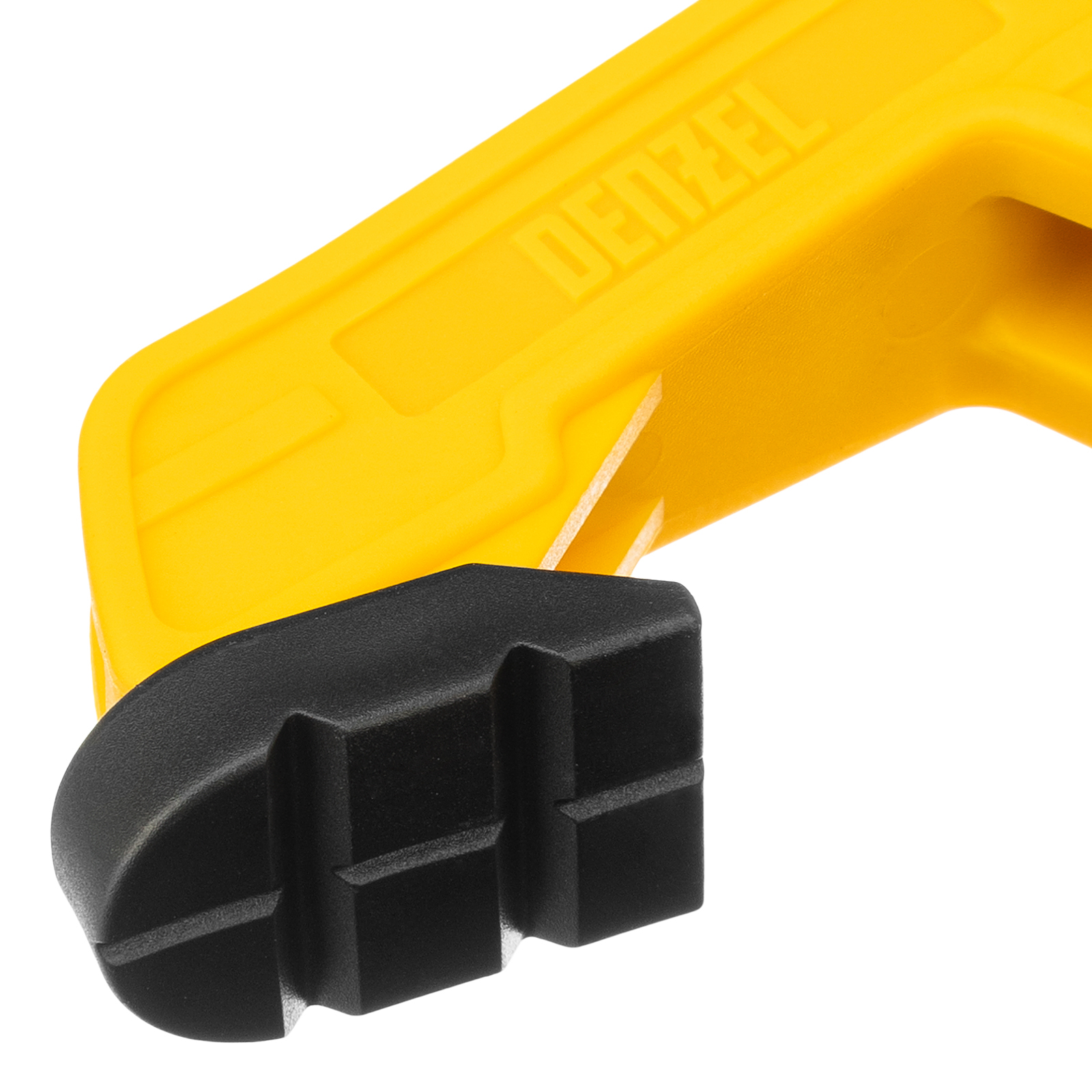 Струбцина клещеобразная удлиненная Denzel 20796 с глубиной зажима 50 мм, с двухкомпонентными рукоятками, способна удерживать детали толщиной до 65 мм. Будет полезна при склеивании или разметке заготовок. Подвижные губки с углублениями на прижимных поверхностях позволяют максимально точно позиционировать деталь при захвате. Струбцина пригодится в столярной мастерской, дома или на даче.