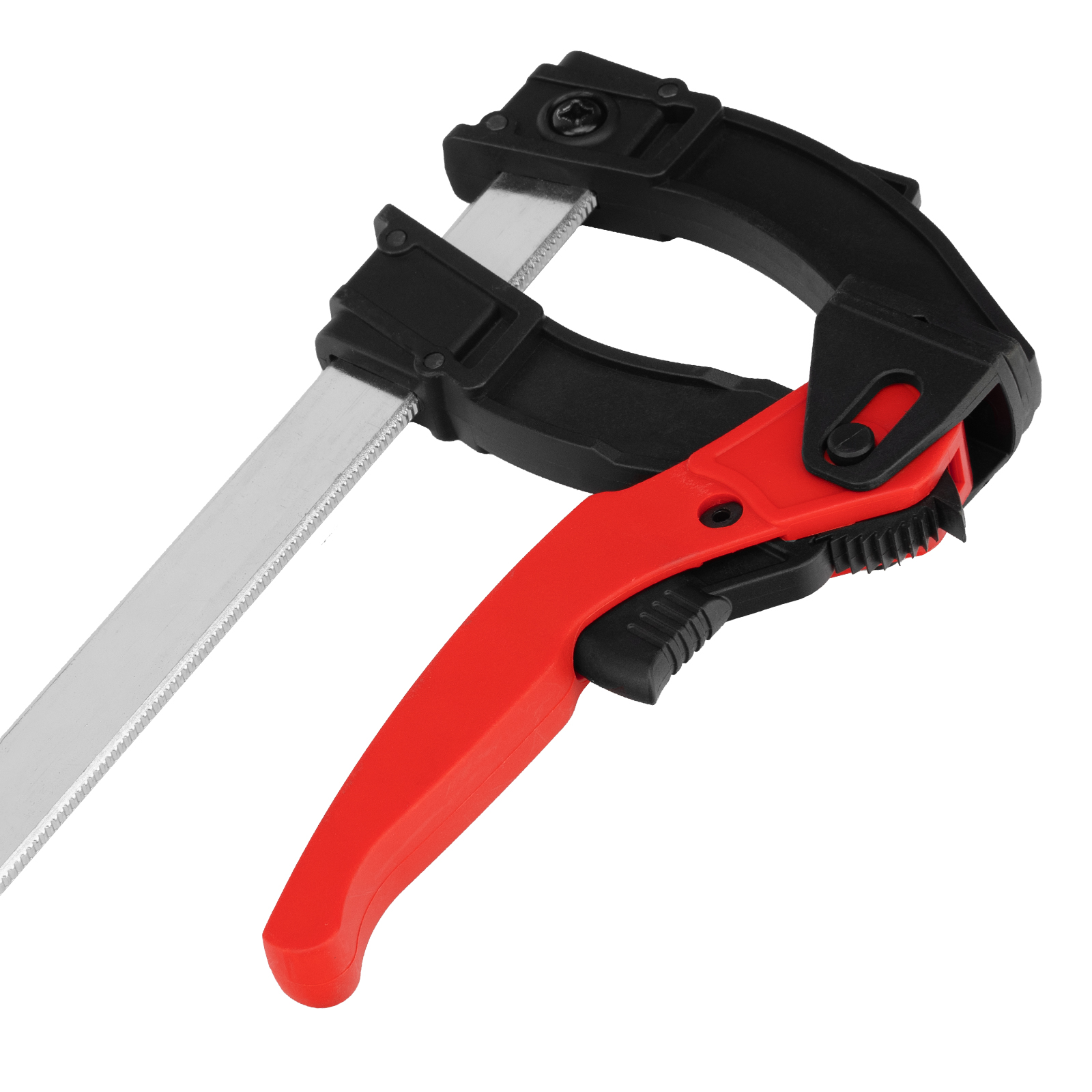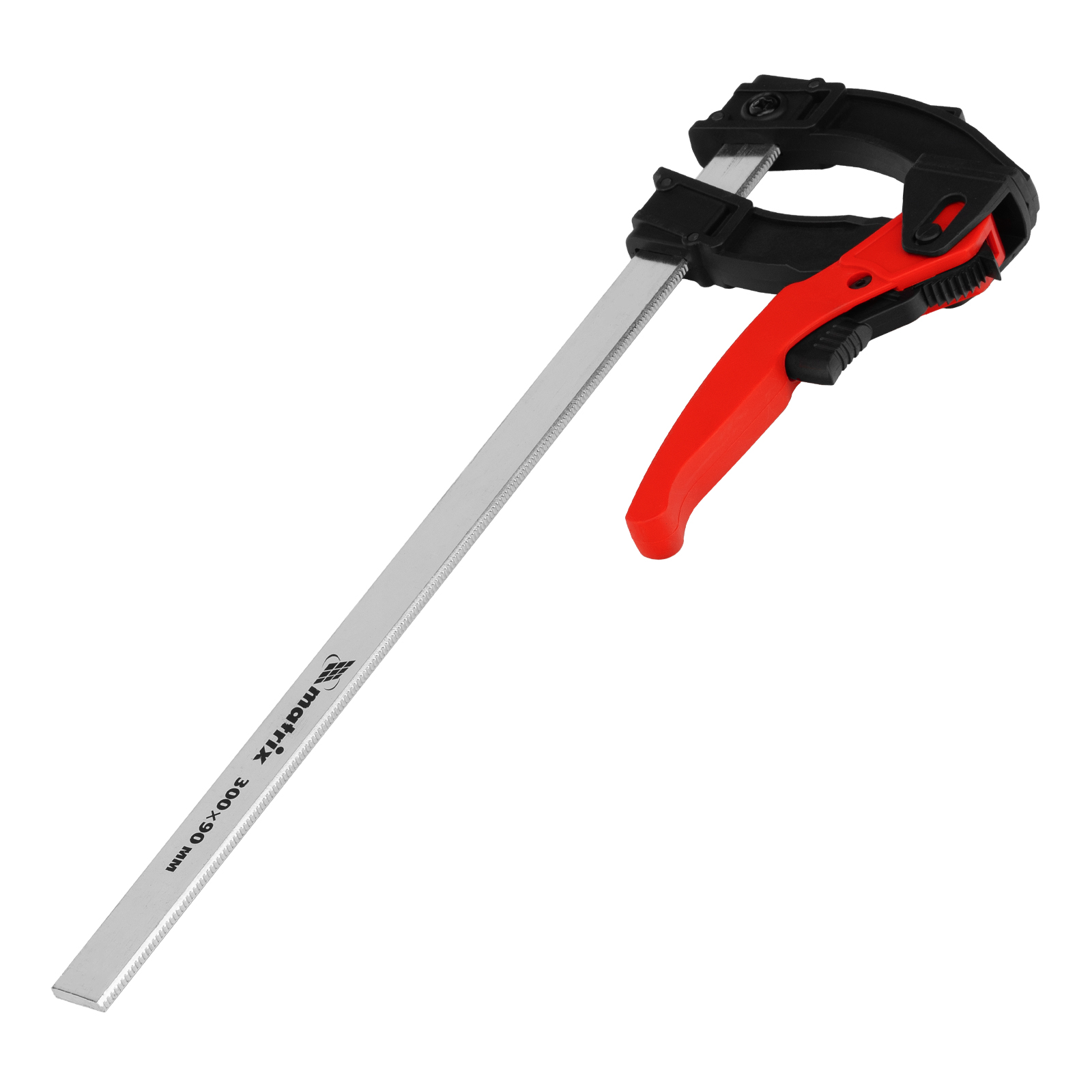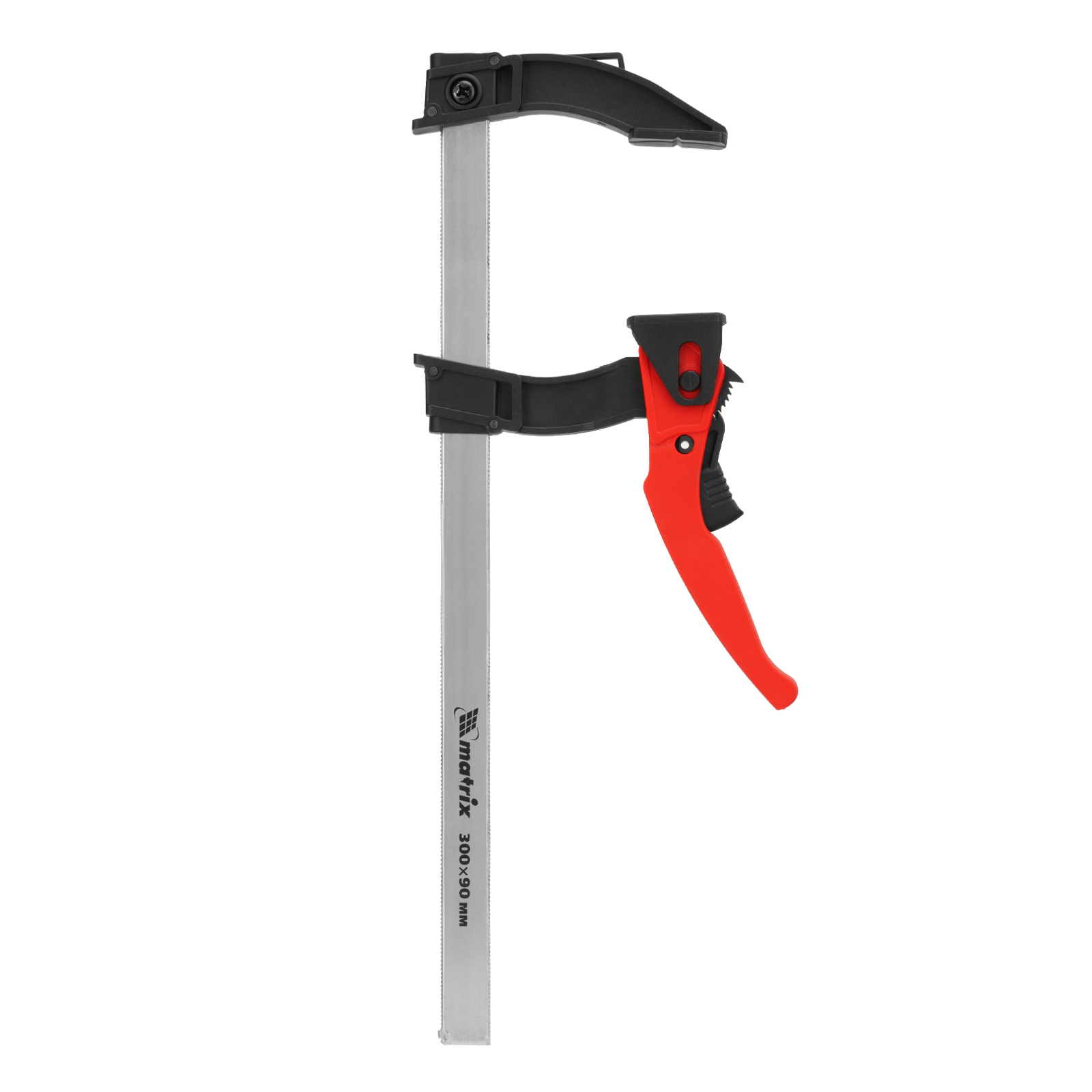 Реечная быстрозажимная струбцина Matrix 20738, 300 х 90 х 390 мм, штанга 5 х 20 мм, с пластиковым корпусом и рычажным храповым механизмом, используется для зажимания и удержания заготовок с целью их скрепления или последующей обработки. Рычажно-храповый механизм позволяет надежно зафиксировать деталь, пошагово перемещая подвижную губку вдоль штанги. Струбцина пригодится при выполнении столярных работ в мастерской, дома или на даче.