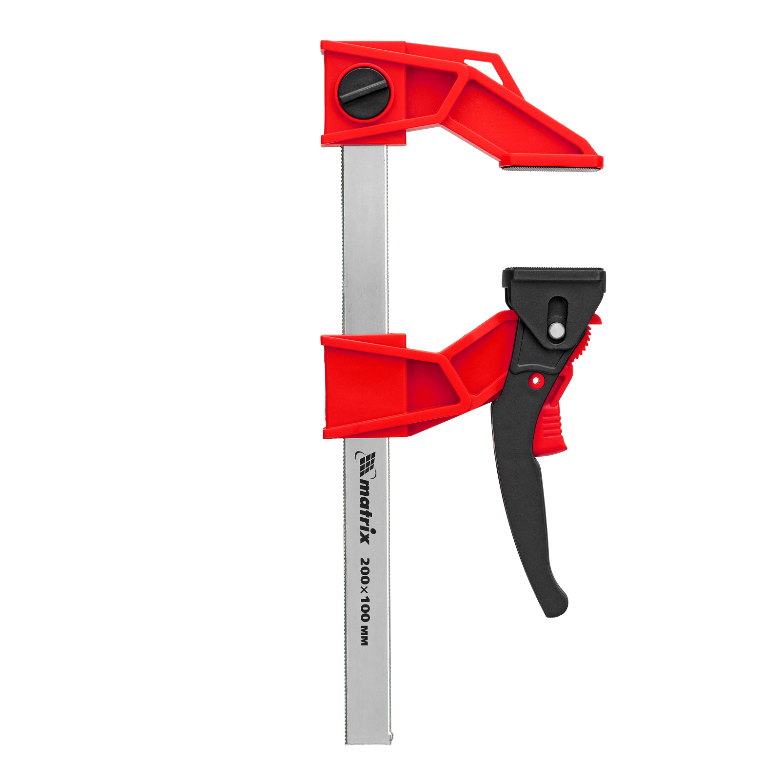 <p>Струбцина реечная быстрозажимная Matrix 20726 размером 200 х 100 х 351 мм, со штангой сечением 5 х 22 мм, с усиленным пластиковым корпусом и рычажным храповым механизмом, предназначена для кратковременной фиксации деталей с целью их склеивания, а также опиливания, сверления и другой обработки. Рычажный храповой механизм позволяет перемещать подвижную губку на небольшое расстояние, сжимая заготовку со значительным усилием. Струбцина пригодится в столярной мастерской, а также будет полезна в быту.</p><h2>Преимущества</h2><ul><li>Надежность — стальная рейка и усиленный корпус из ударопрочного пластика выдерживают значительные нагрузки при сжатии.</li><li>Аккуратная работа с древесиной — пластиковые губки не повреждают поверхность заготовок.</li><li>Дополнительные возможности — съемную неподвижную губку можно перевернуть на рейке, превратив струбцину в распорный инструмент.</li></ul>