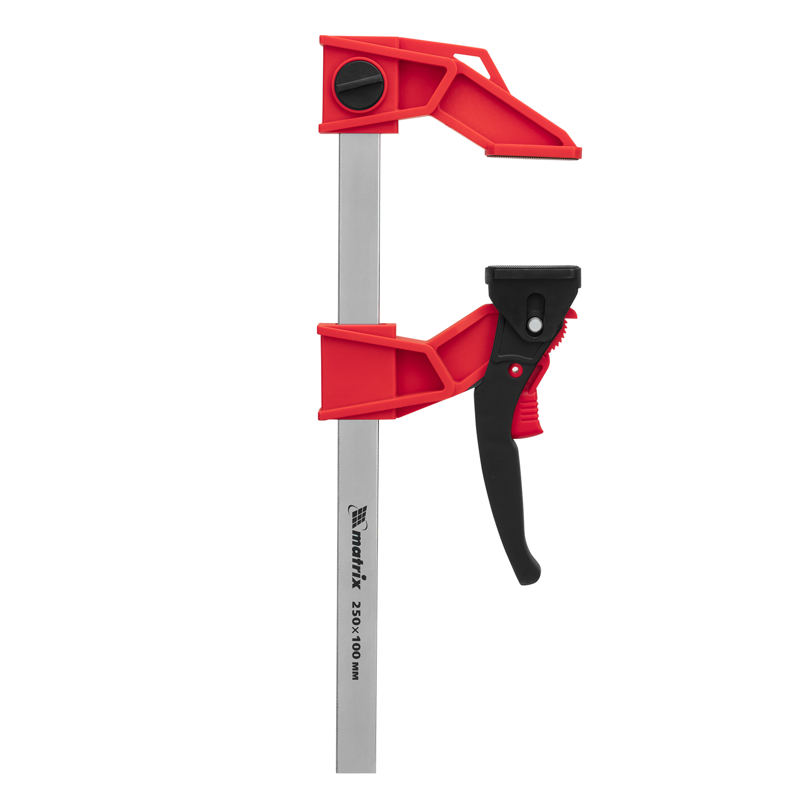 <p>Струбцина реечная быстрозажимная Matrix 20727 размером 250 х 100 х 401 мм, со штангой сечением 5 х 22 мм, с усиленным пластиковым корпусом и рычажным храповым механизмом, предназначена для кратковременной фиксации деталей с целью их склеивания, а также опиливания, сверления и другой обработки. Рычажный храповой механизм позволяет перемещать подвижную губку на небольшое расстояние, сжимая заготовку со значительным усилием. Струбцина пригодится в столярной мастерской, а также будет полезна в быту.</p><h2>Преимущества</h2><ul><li>Надежность — стальная рейка и усиленный корпус из ударопрочного пластика выдерживают значительные нагрузки при сжатии.</li><li>Аккуратная работа с древесиной — пластиковые губки не повреждают поверхность заготовок.</li><li>Дополнительные возможности — съемную неподвижную губку можно перевернуть на рейке, превратив струбцину в распорный инструмент.</li></ul>