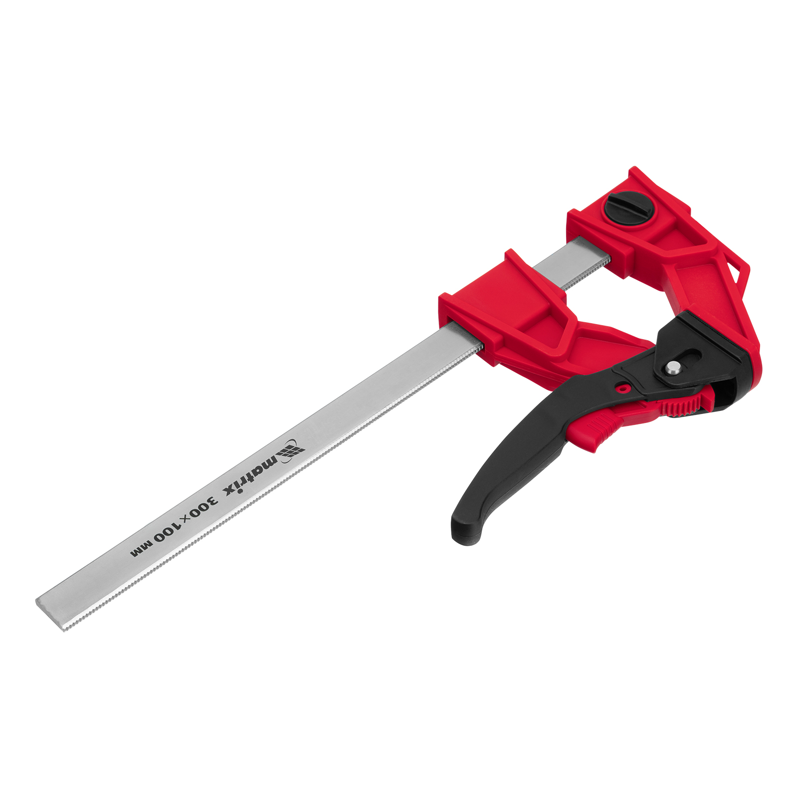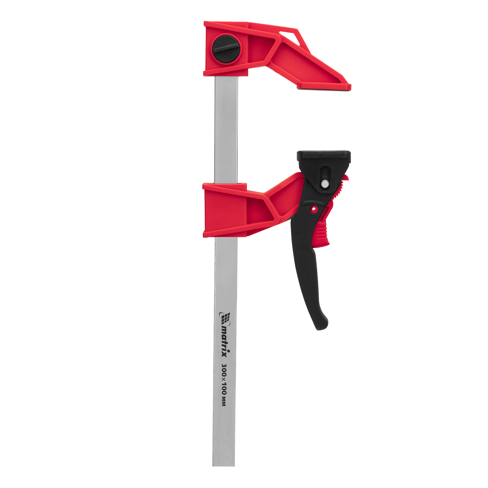 <p>Струбцина реечная быстрозажимная Matrix 20728 размером 300 х 100 х 456 мм, со штангой сечением 5 х 22 мм, с усиленным пластиковым корпусом и рычажным храповым механизмом, предназначена для кратковременной фиксации деталей с целью их склеивания, а также опиливания, сверления и другой обработки. Рычажный храповой механизм позволяет перемещать подвижную губку на небольшое расстояние, сжимая заготовку со значительным усилием. Струбцина пригодится в столярной мастерской, а также будет полезна в быту.</p><h2>Преимущества</h2><ul><li>Надежность — стальная рейка и усиленный корпус из ударопрочного пластика выдерживают значительные нагрузки при сжатии.</li><li>Аккуратная работа с древесиной — пластиковые губки не повреждают поверхность заготовок.</li><li>Дополнительные возможности — съемную неподвижную губку можно перевернуть на рейке, превратив струбцину в распорный инструмент.</li></ul>