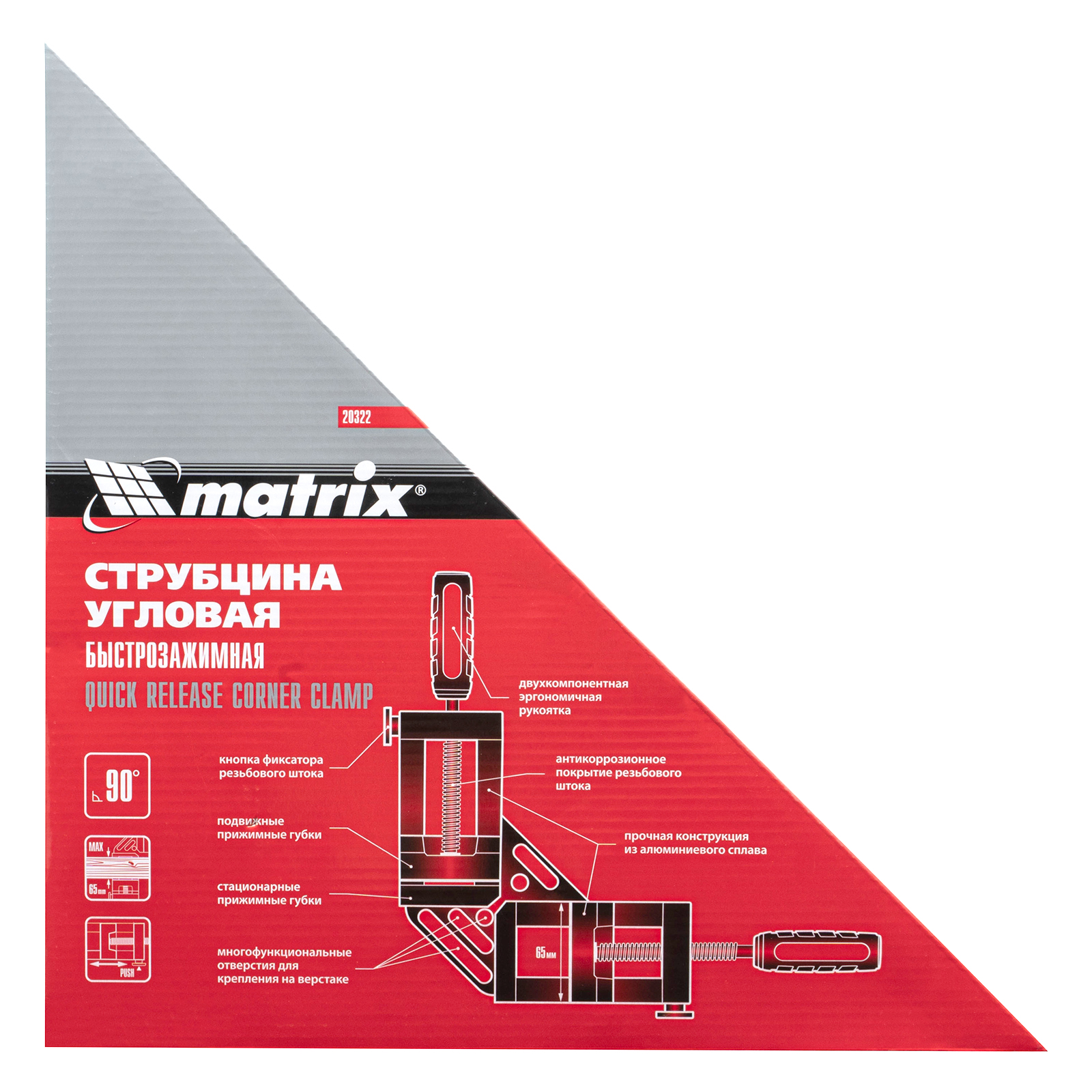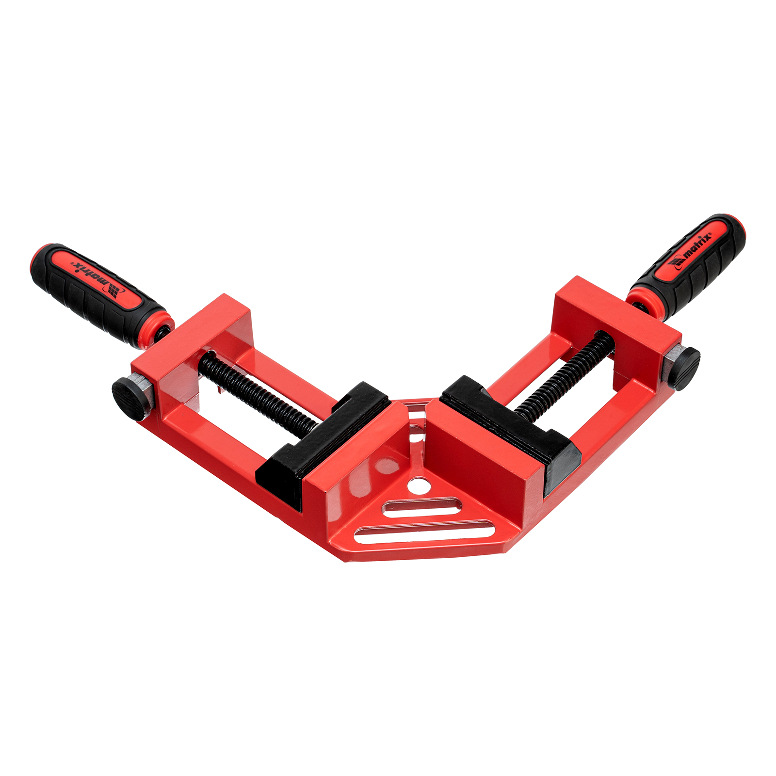 Угловая быстрозажимная струбцина Matrix 20322 с шириной зажима 65 х 65 мм, с двухкомпонентными обрезиненными рукоятками, предназначена для быстрой и надежной фиксации заготовок перпендикулярно друг другу. Рычажно-осевой механизм не требует особых усилий от пользователя. Инструмент позволяет точно выдерживать угол в 90°, обеспечивая высокое качество работ. Струбцину используют для сборки мебели и других конструкций.