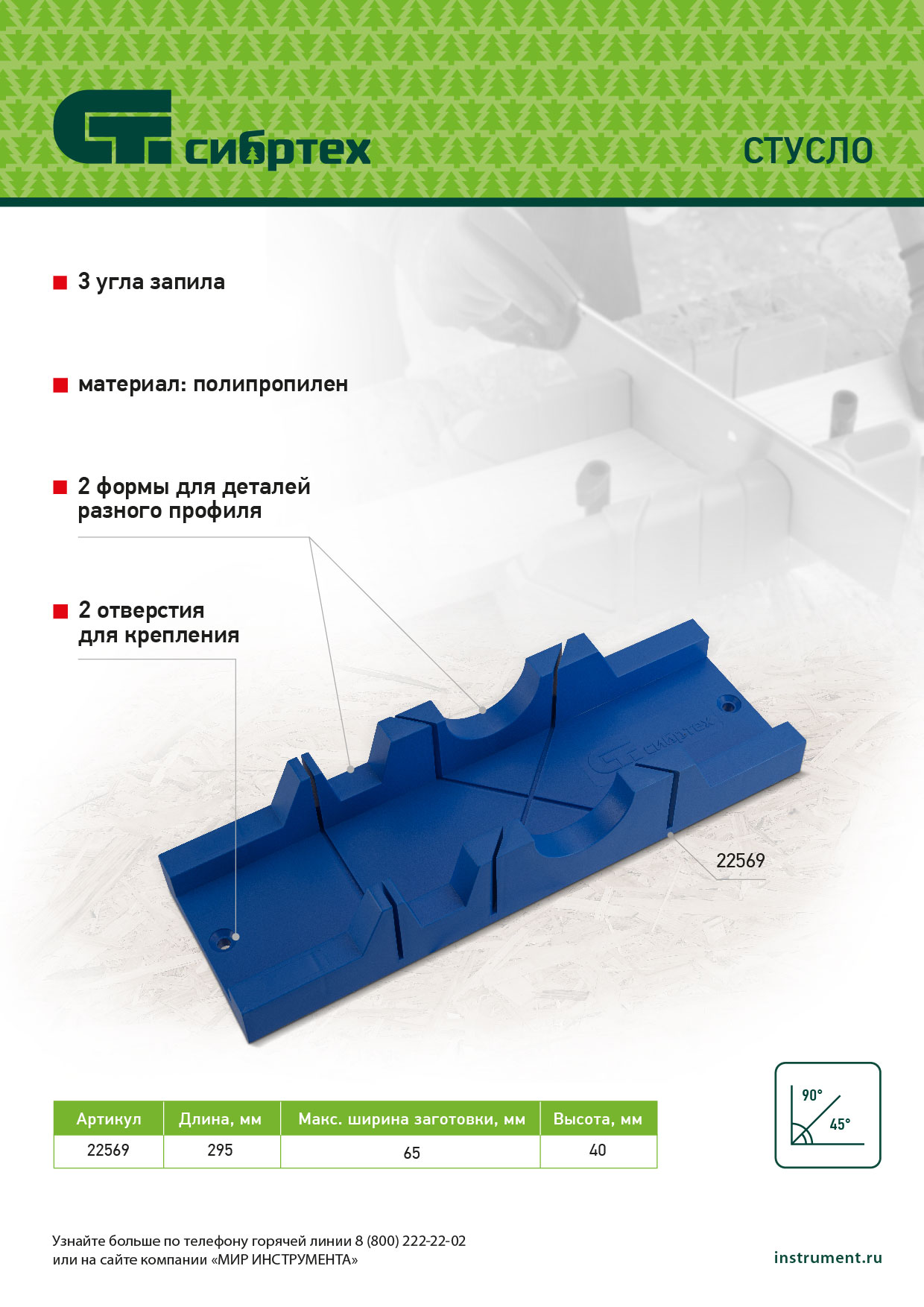 Пластиковое стусло Сибртех 22569 размером 295 х 65 мм предназначено для точного и аккуратного распила заготовок под 3 углами: 45°, 90° и 135°. Позволяет осуществить идеально плотную стыковку заготовок, при этом не требуется проведение дополнительных замеров и использование специальных инструментов. Стусло облегчает формирование внутренних и наружных углов для монтажа плинтусов, наличников и других элементов отделки.