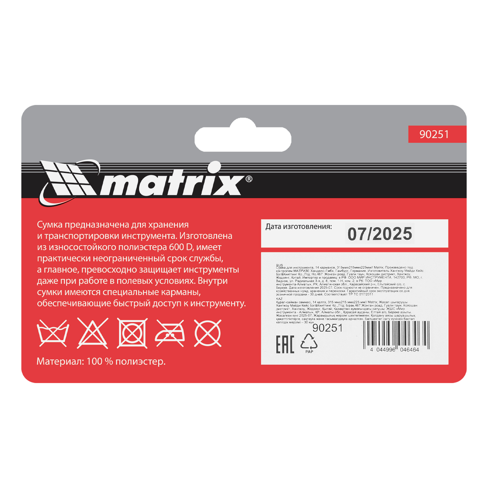 Сумка Matrix 90251 размером 315 х 215 х 225 мм, с 14 карманами, используется для транспортировки и хранения инструментов. 14 карманов и вместительное основное отделение позволяют разместить в сумке инструменты разного размера. Изделие пригодится монтажникам, строителям, будет полезно дома и в поездке.