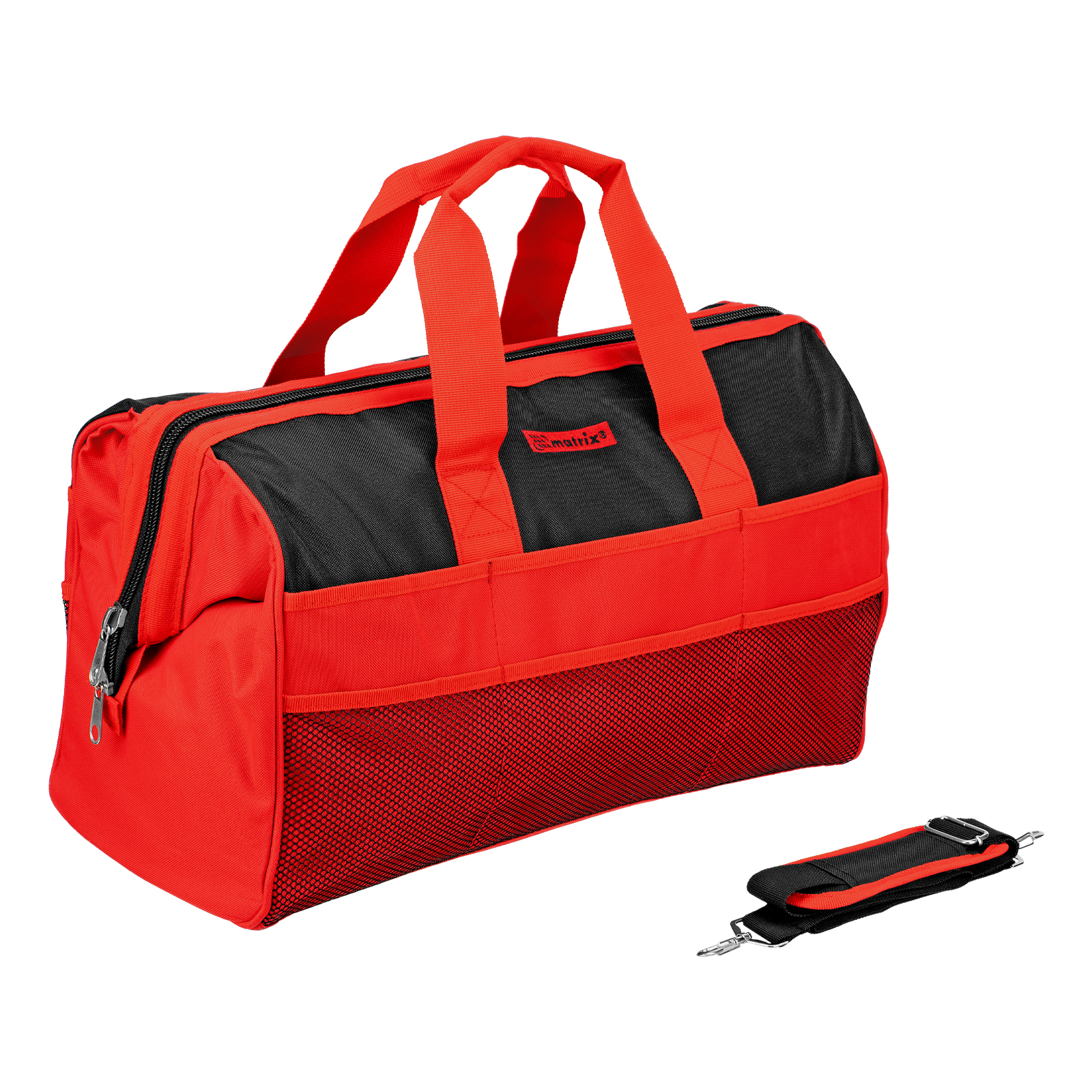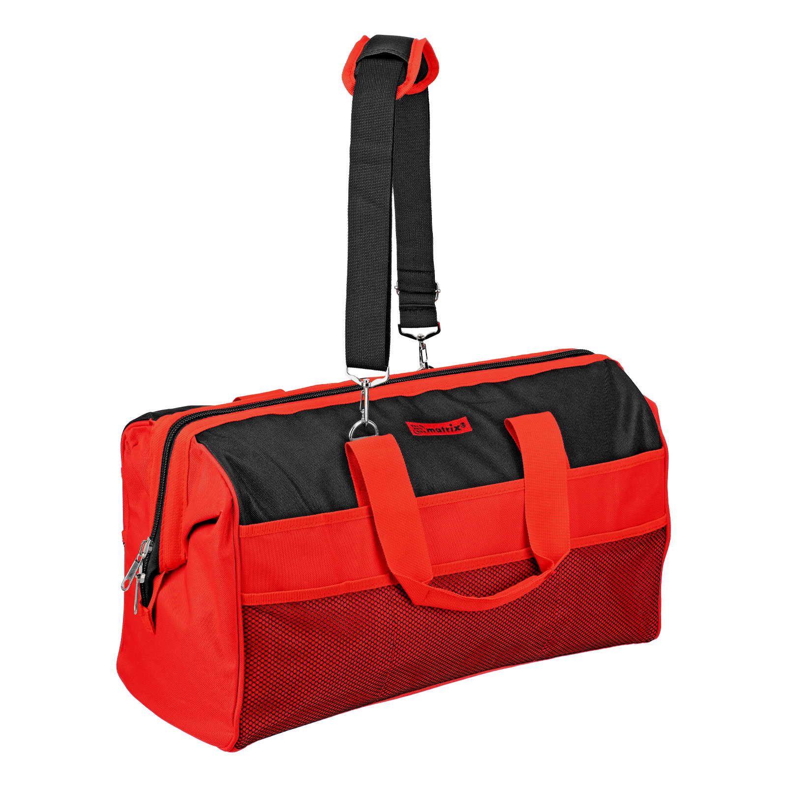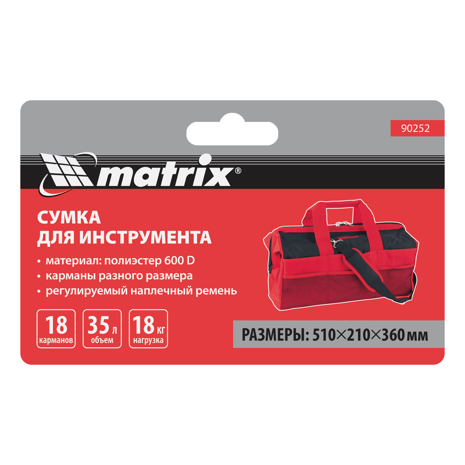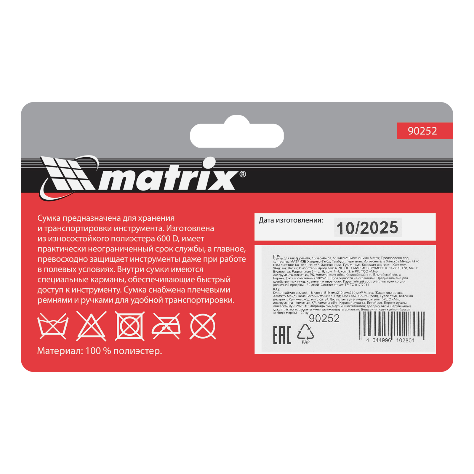 Сумка Matrix 90252 с 18 карманами, размером 510 х 210 х 360 мм, предназначена для транспортировки и хранения слесарных или столярных инструментов. Может использоваться для перевозки автопринадлежностей. В 18 карманах и вместительном основном отделении можно разместить инструменты разного размера. Сумка пригодится монтажнику, слесарю, строителю, будет полезна дома и в поездке.