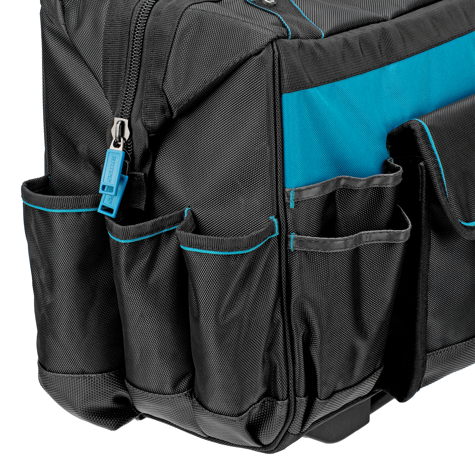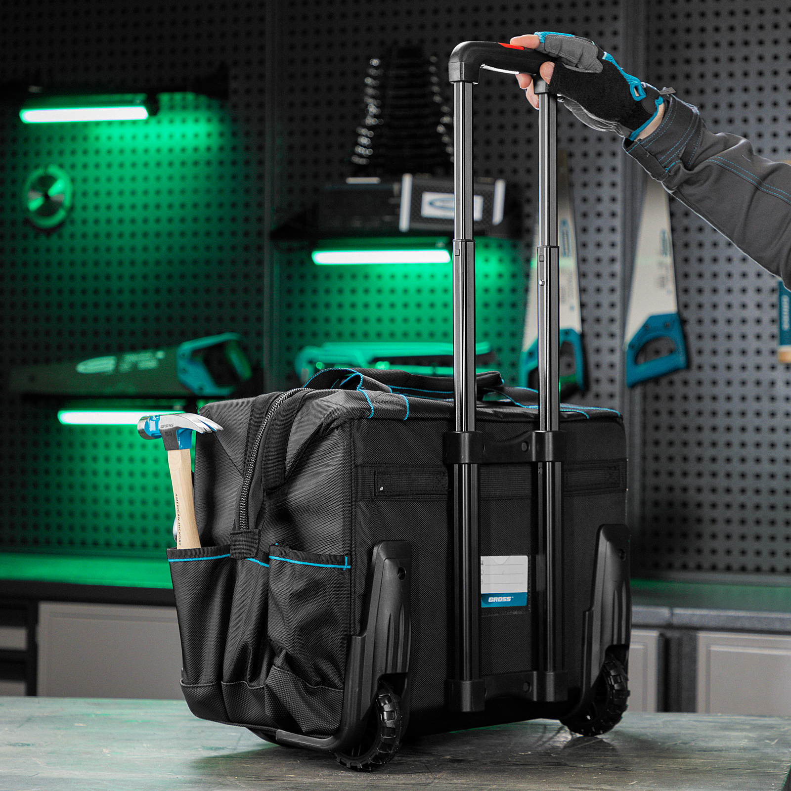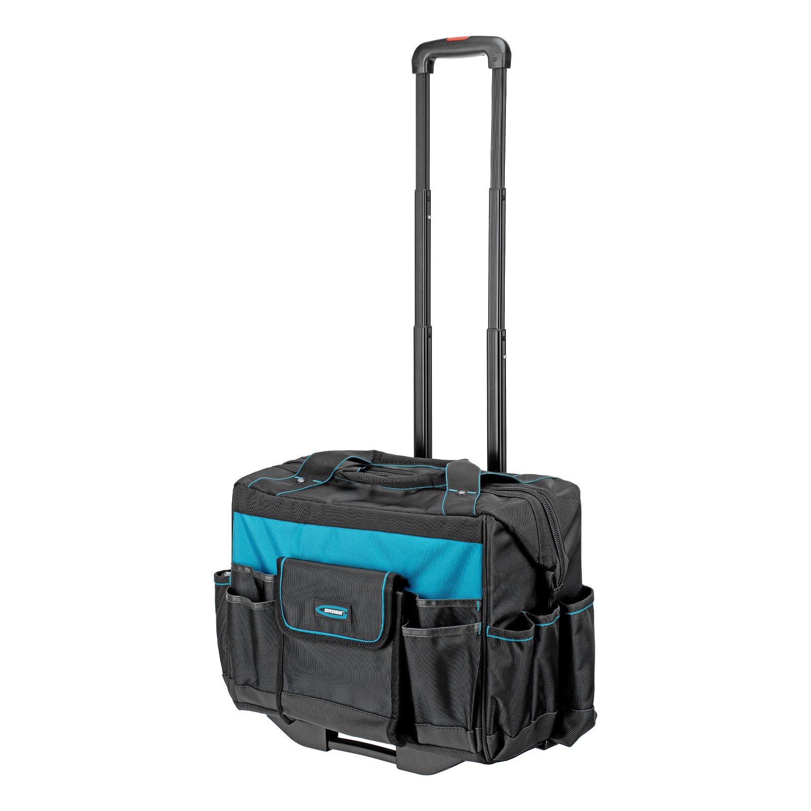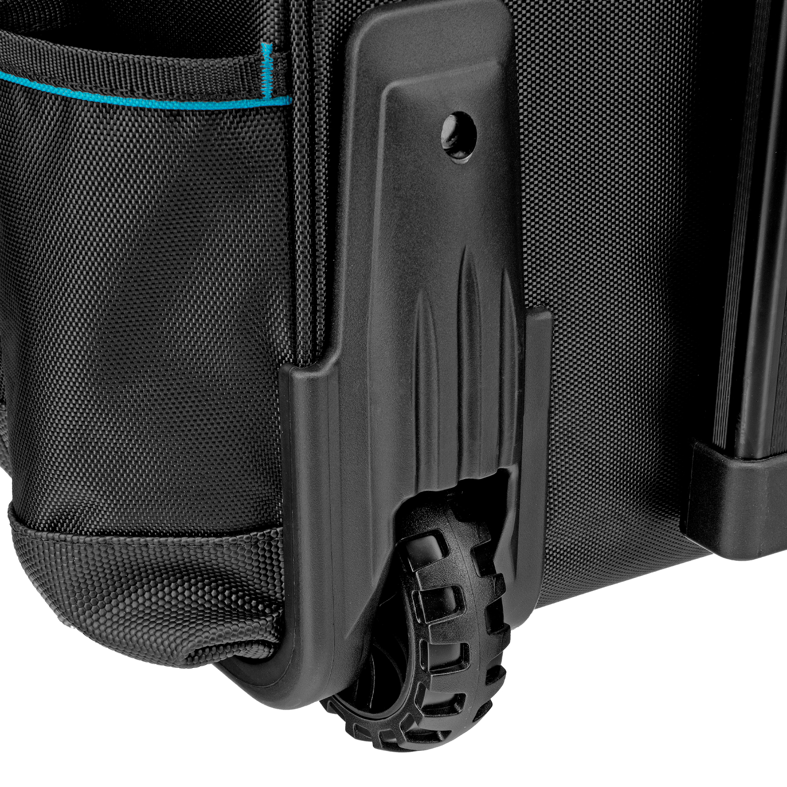 - Мобильность — сумку с инструментами легко перемещать при помощи колес и телескопической рукоятки.
