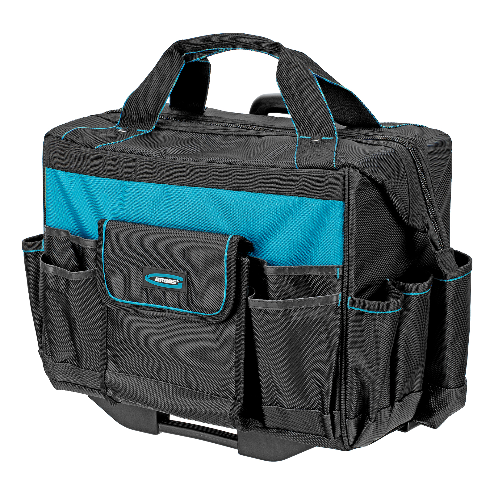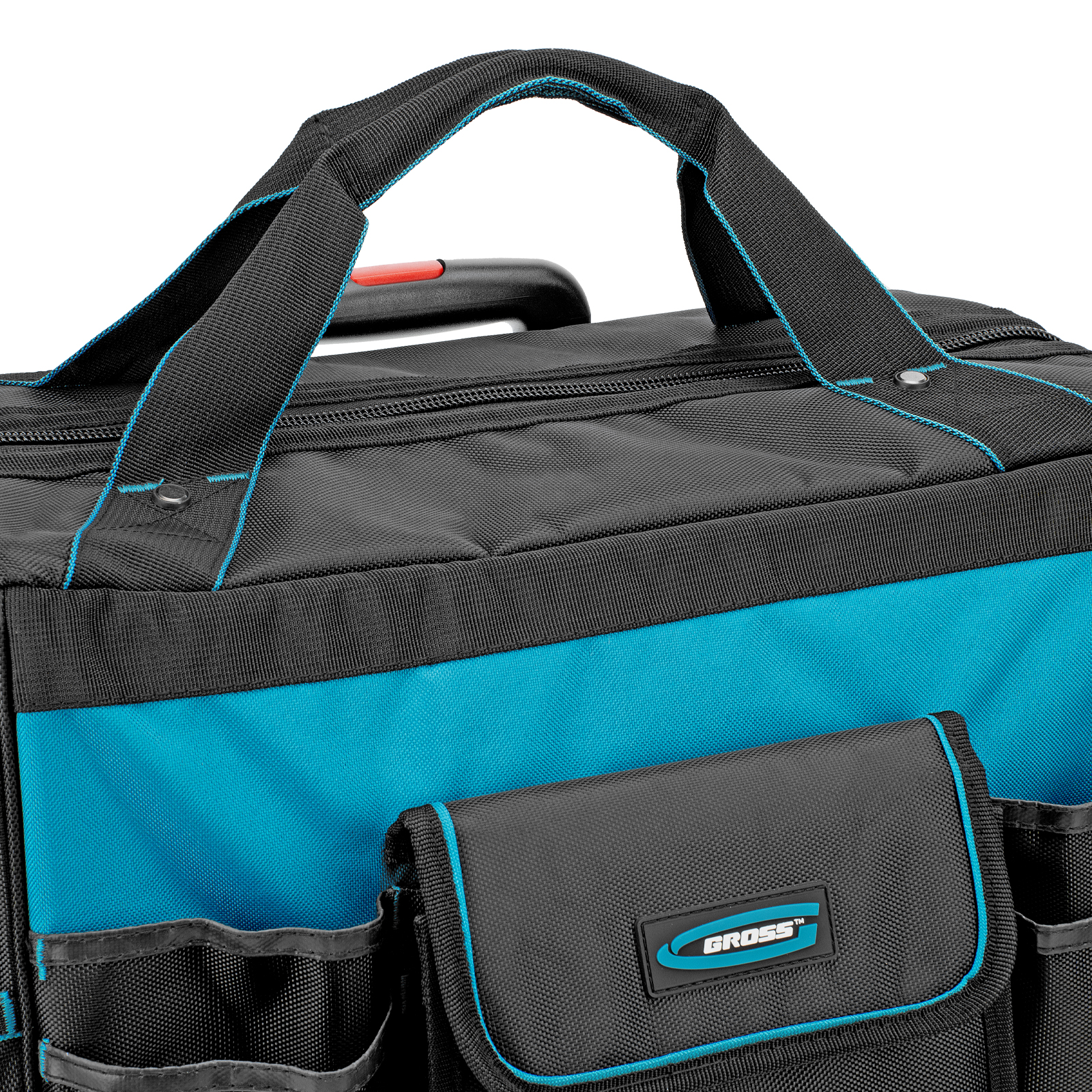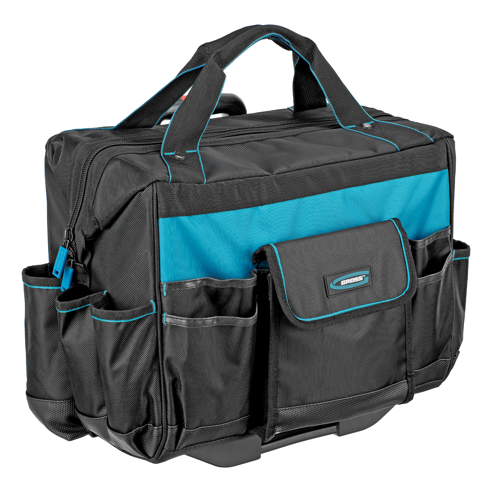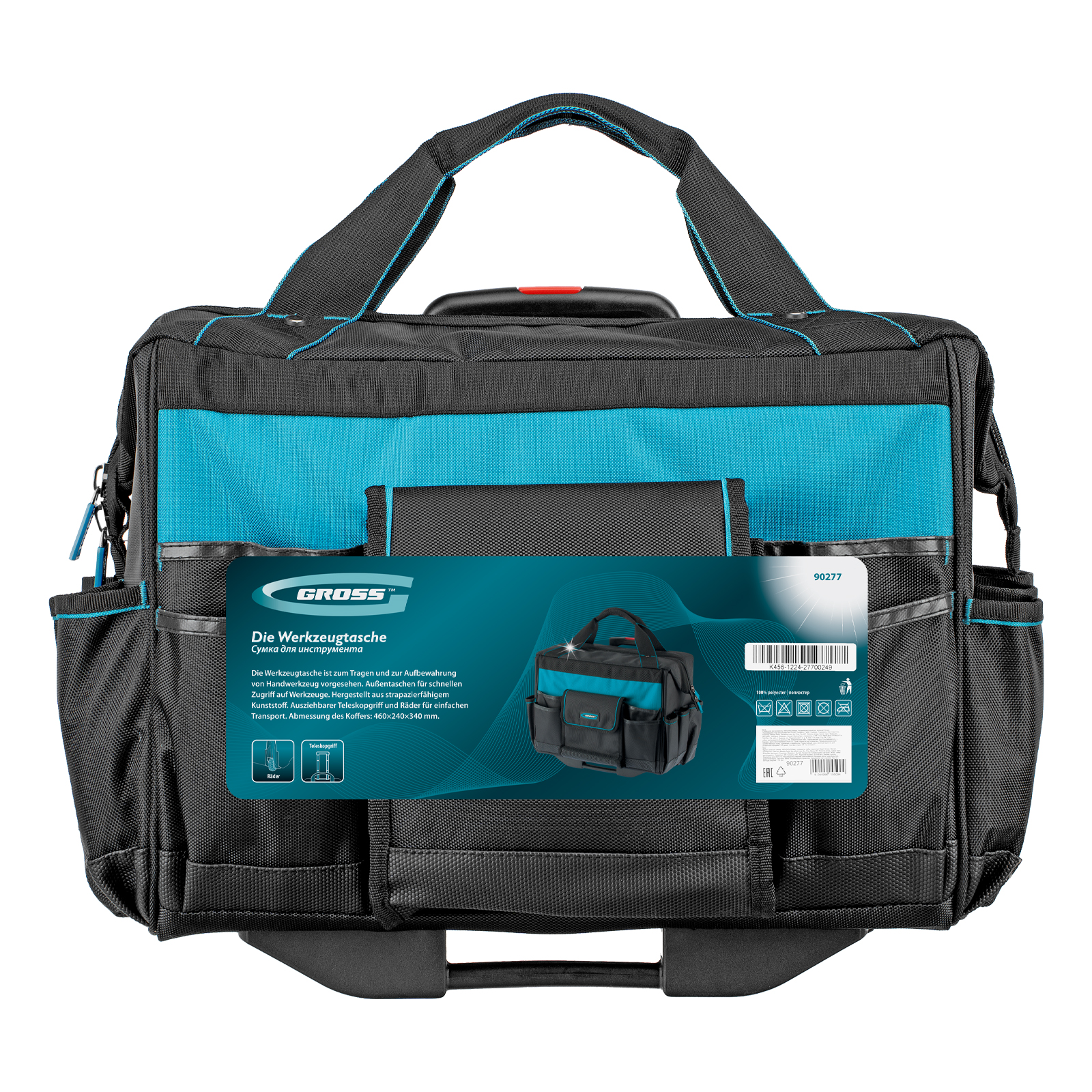 Сумка Gross 90277 размером 460 х 240 х 340 мм, с выдвижной рукояткой и колесами, имеет 18 карманов и вместительное основное отделение, в которые можно сложить необходимый ручной и электроинструмент. Сумка пригодится дома, в гараже и в поездке.