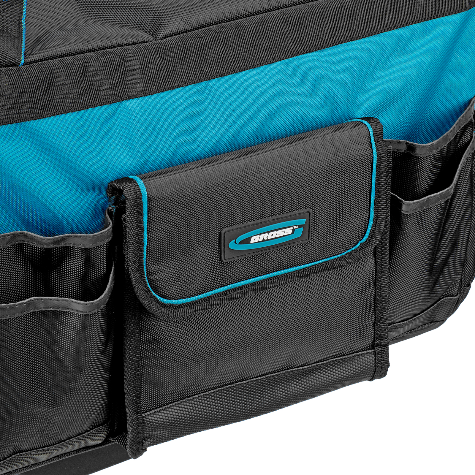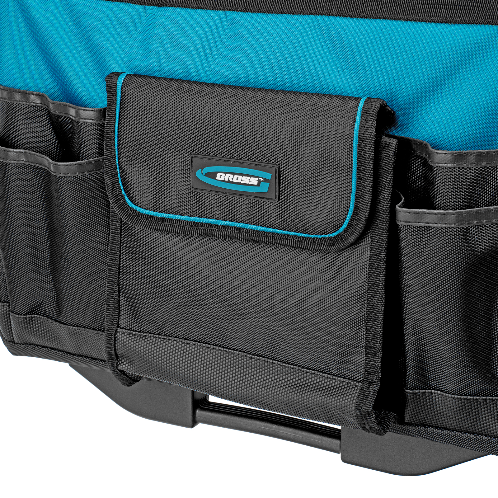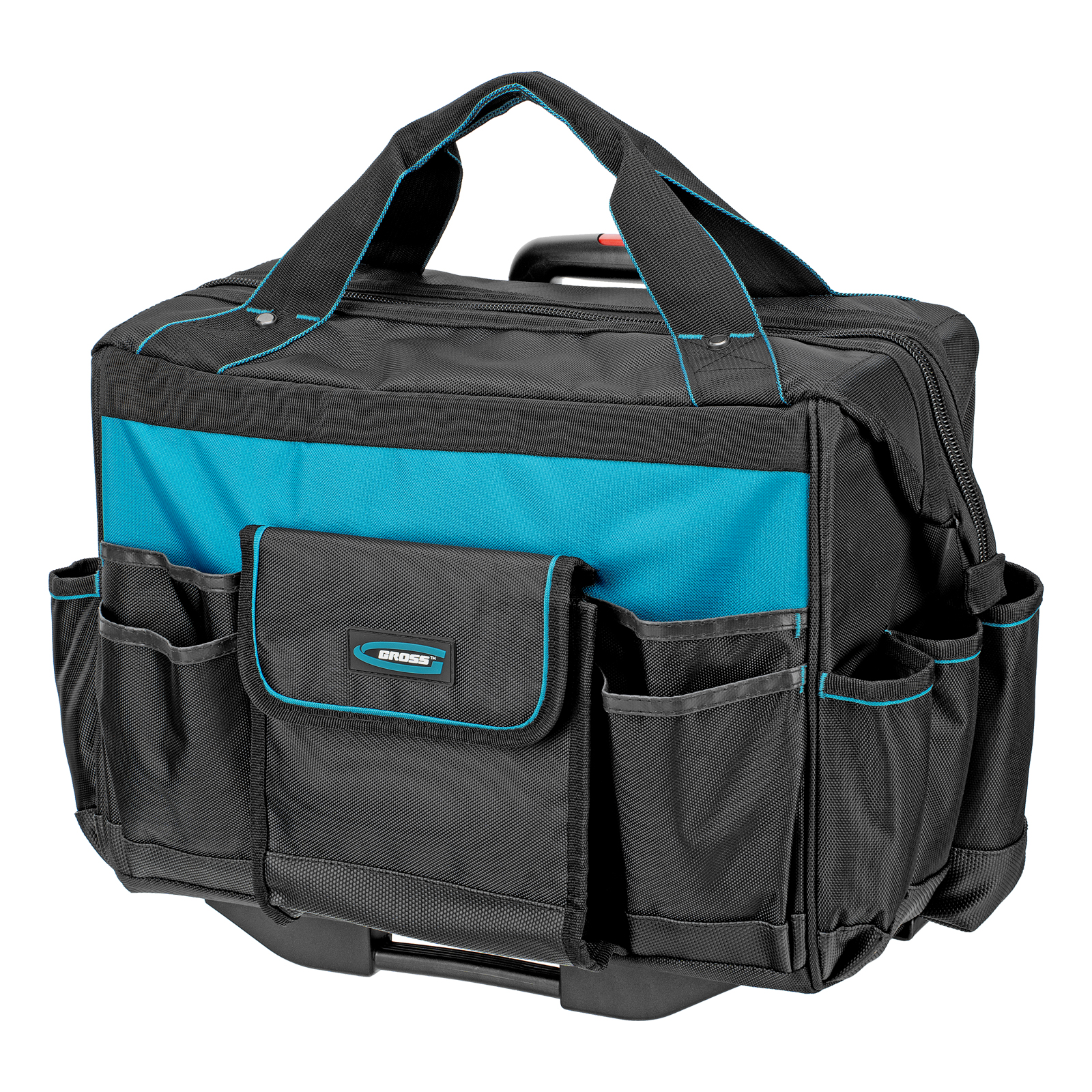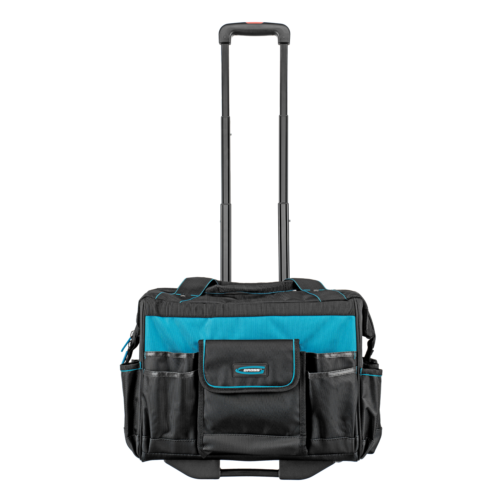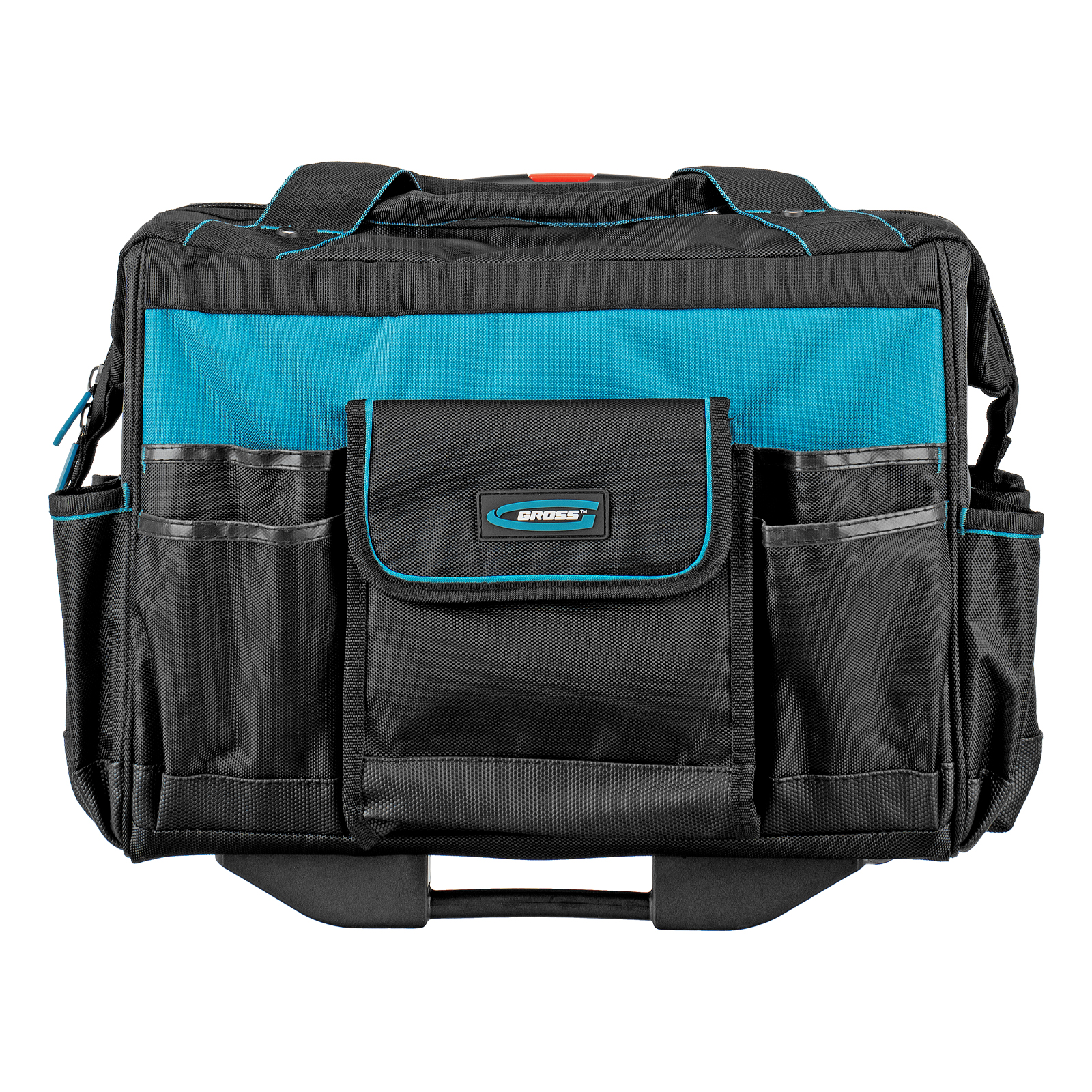 Сумка Gross 90277 размером 460 х 240 х 340 мм, с выдвижной рукояткой и колесами, имеет 18 карманов и вместительное основное отделение, в которые можно сложить необходимый ручной и электроинструмент. Сумка пригодится дома, в гараже и в поездке.