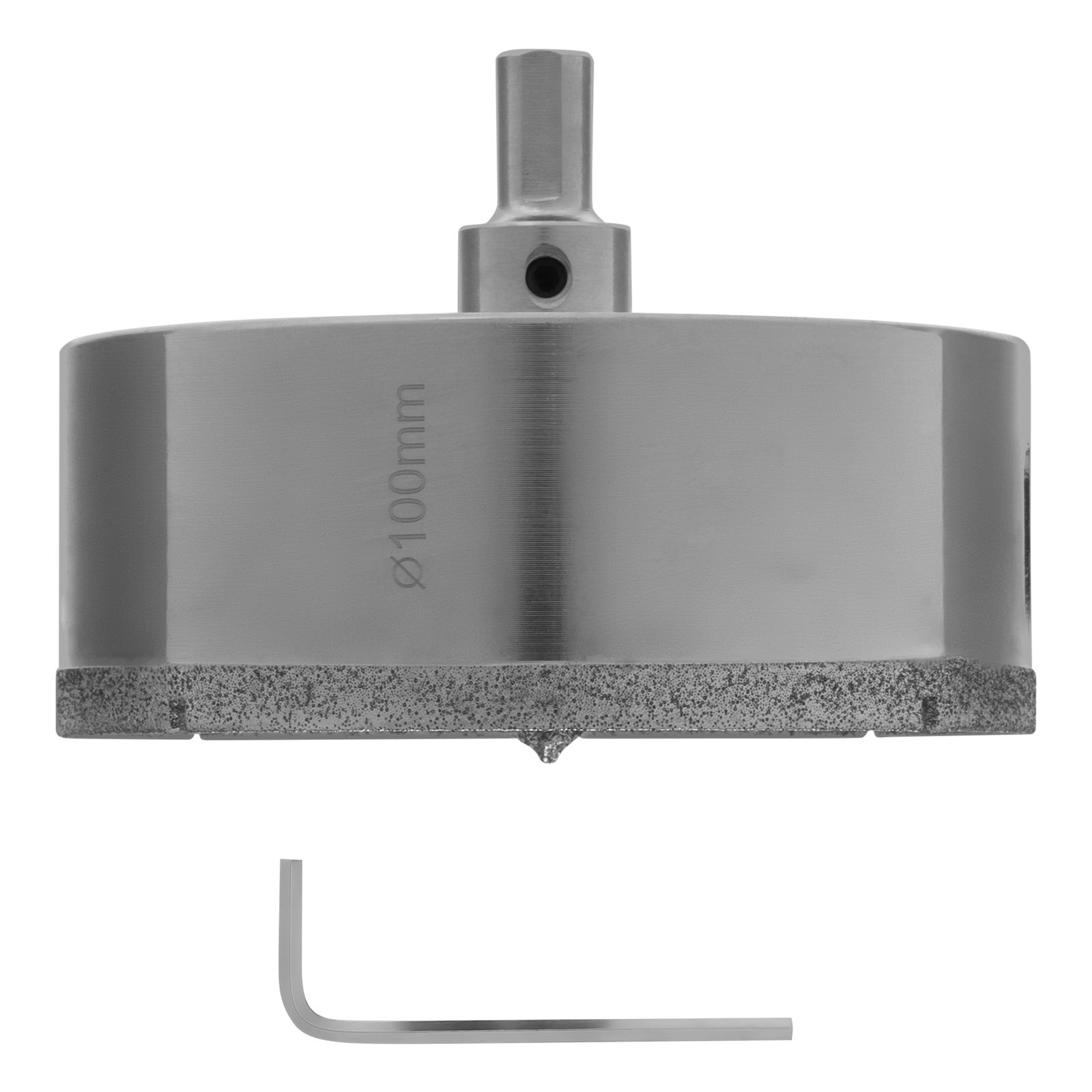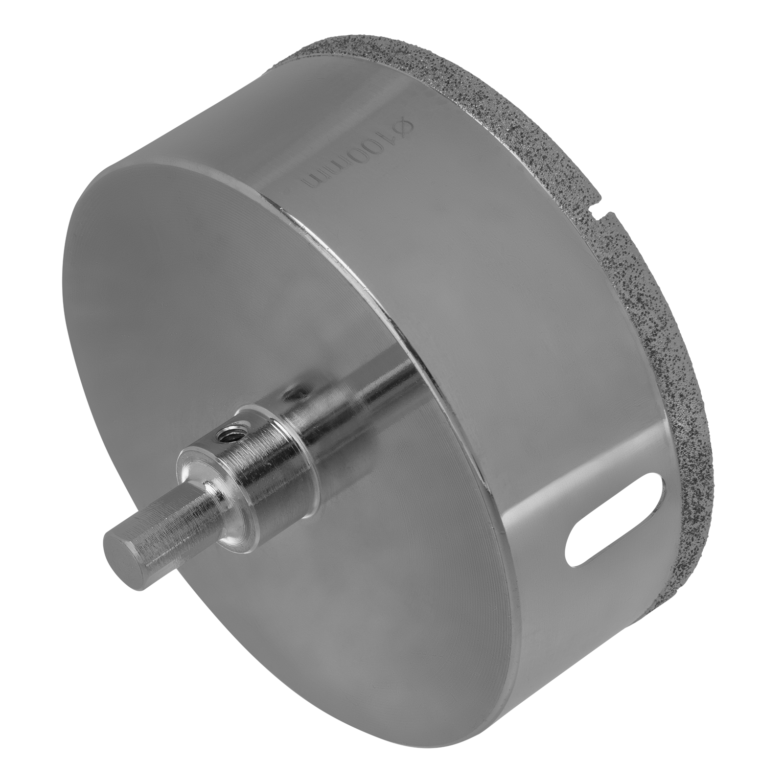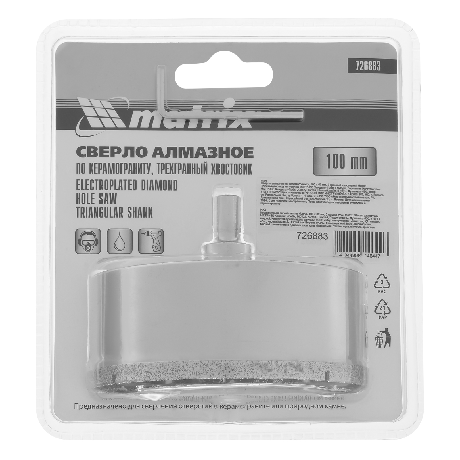 Универсальное алмазное сверло по керамограниту Matrix 726883 размером 100 х 67 мм, с 3-гранным хвостовиком, применяется для получения отверстий в стекле, плитке, кафеле. За счет высокой концентрации алмазов в режущем слое оно легко справляется со сверлением керамогранита. Сверло рассчитано на профессиональное использование с дрелями и шуруповертами. Водяное охлаждение в процессе работы значительно повышает срок службы оснастки.