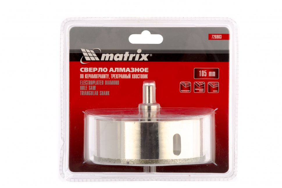 Универсальное алмазное сверло по керамограниту Matrix 726903 размером 105 х 67 мм, с 3-гранным хвостовиком, применяется для получения отверстий в стекле, плитке, кафеле. За счет высокой концентрации алмазов в режущем слое оно легко справляется со сверлением керамогранита. Сверло рассчитано на профессиональное использование с дрелями и шуруповертами. Водяное охлаждение в процессе работы значительно повышает срок службы оснастки.