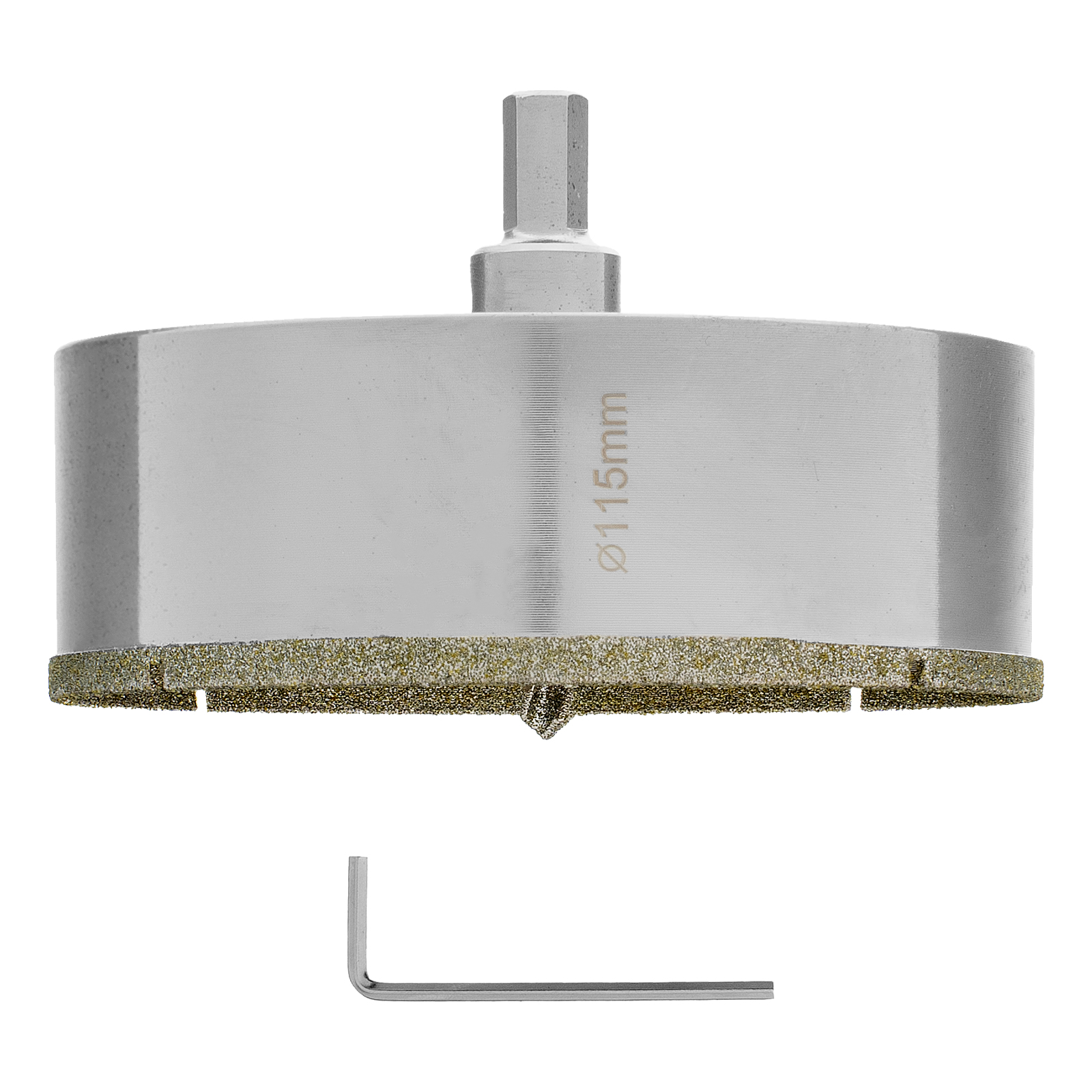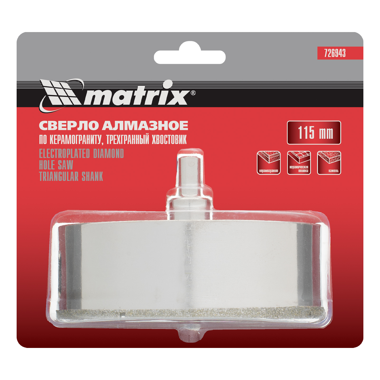 Универсальное алмазное сверло по керамограниту Matrix 726943 размером 115 х 67 мм, с 3-гранным хвостовиком, применяется для получения отверстий в стекле, плитке, кафеле. За счет высокой концентрации алмазов в режущем слое оно легко справляется со сверлением керамогранита. Сверло рассчитано на профессиональное использование с дрелями и шуруповертами. Водяное охлаждение в процессе работы значительно повышает срок службы оснастки.