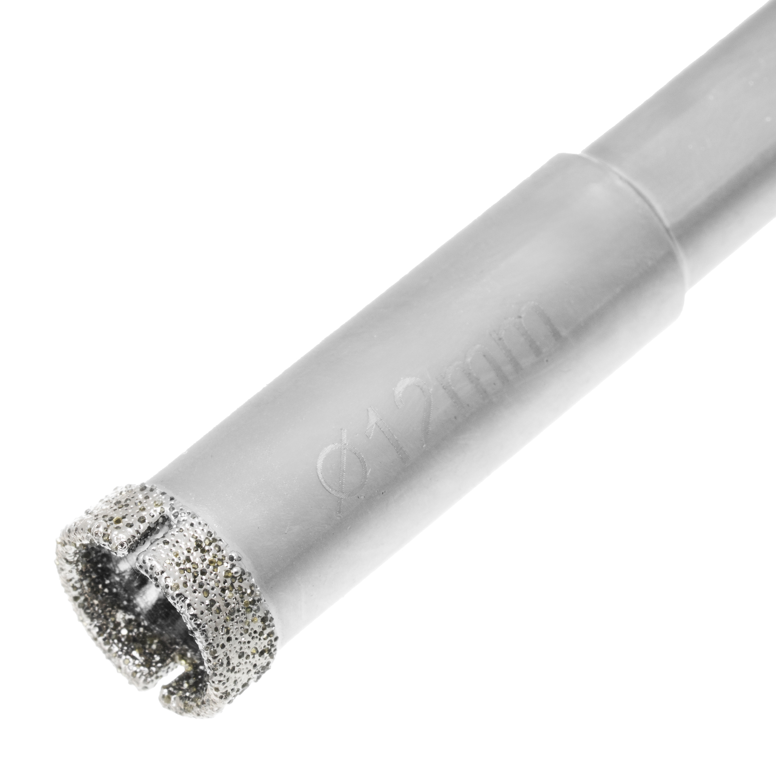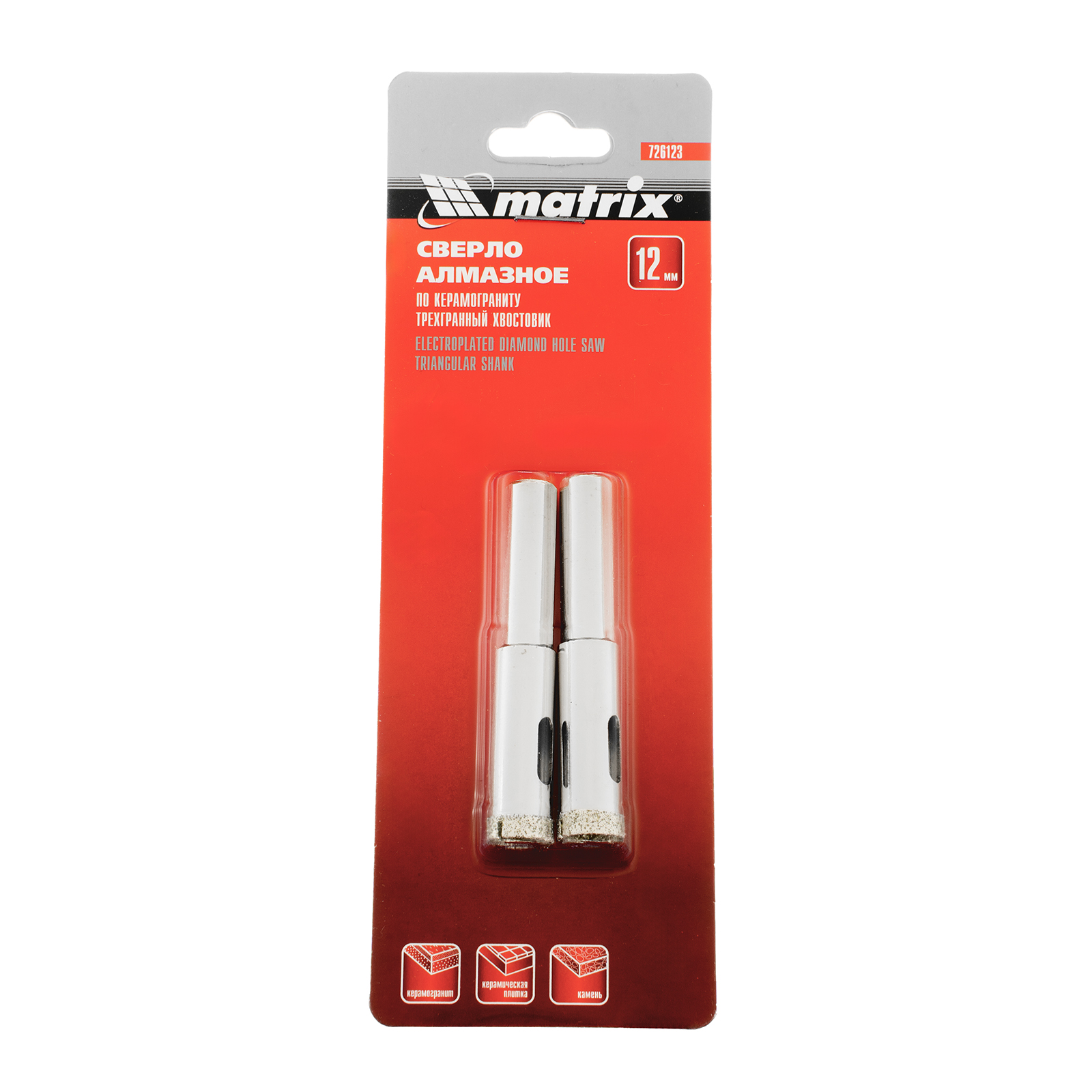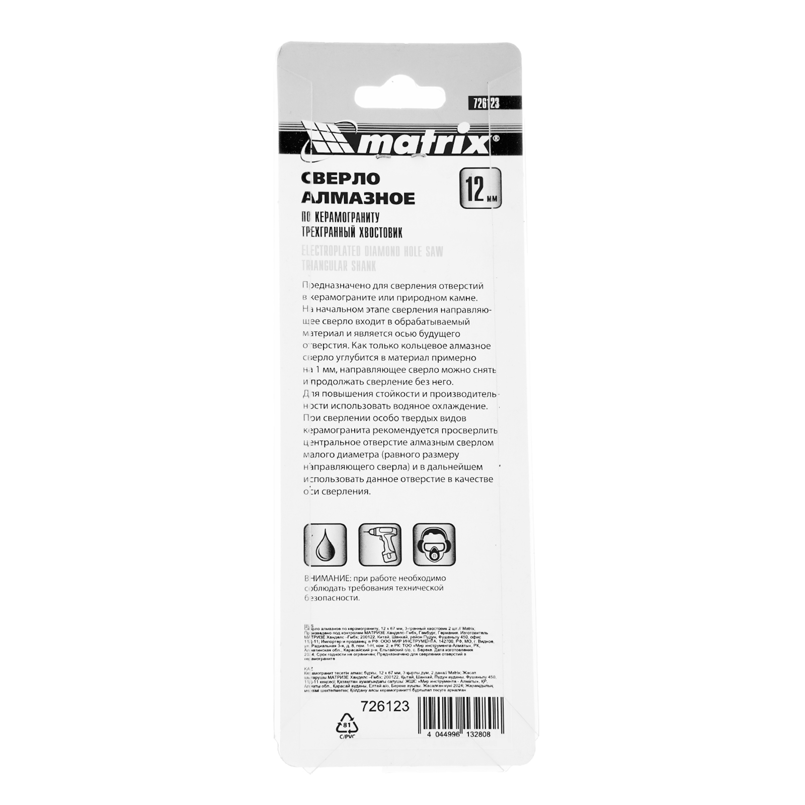 Универсальное алмазное сверло по керамограниту Matrix 726123 размером 12 х 67 мм, с 3-гранным хвостовиком, 2 шт. в упаковке, применяется для получения отверстий в стекле, плитке, кафеле. За счет высокой концентрации алмазов в режущем слое оно легко справляется со сверлением керамогранита. Сверло рассчитано на профессиональное использование с дрелями и шуруповертами, рекомендованная скорость составляет 350-700 об/мин. Водяное охлаждение в процессе работы значительно повышает срок службы оснастки.