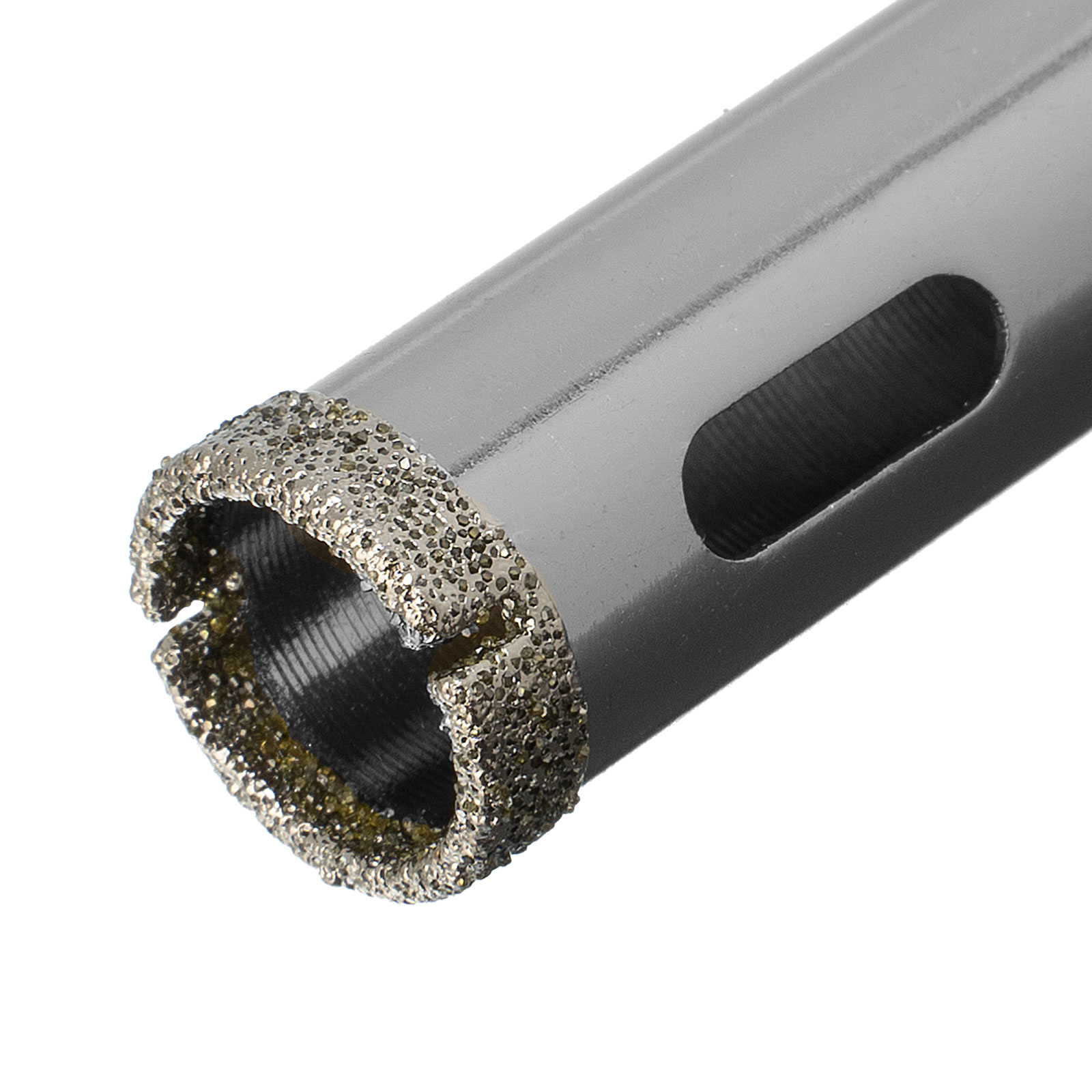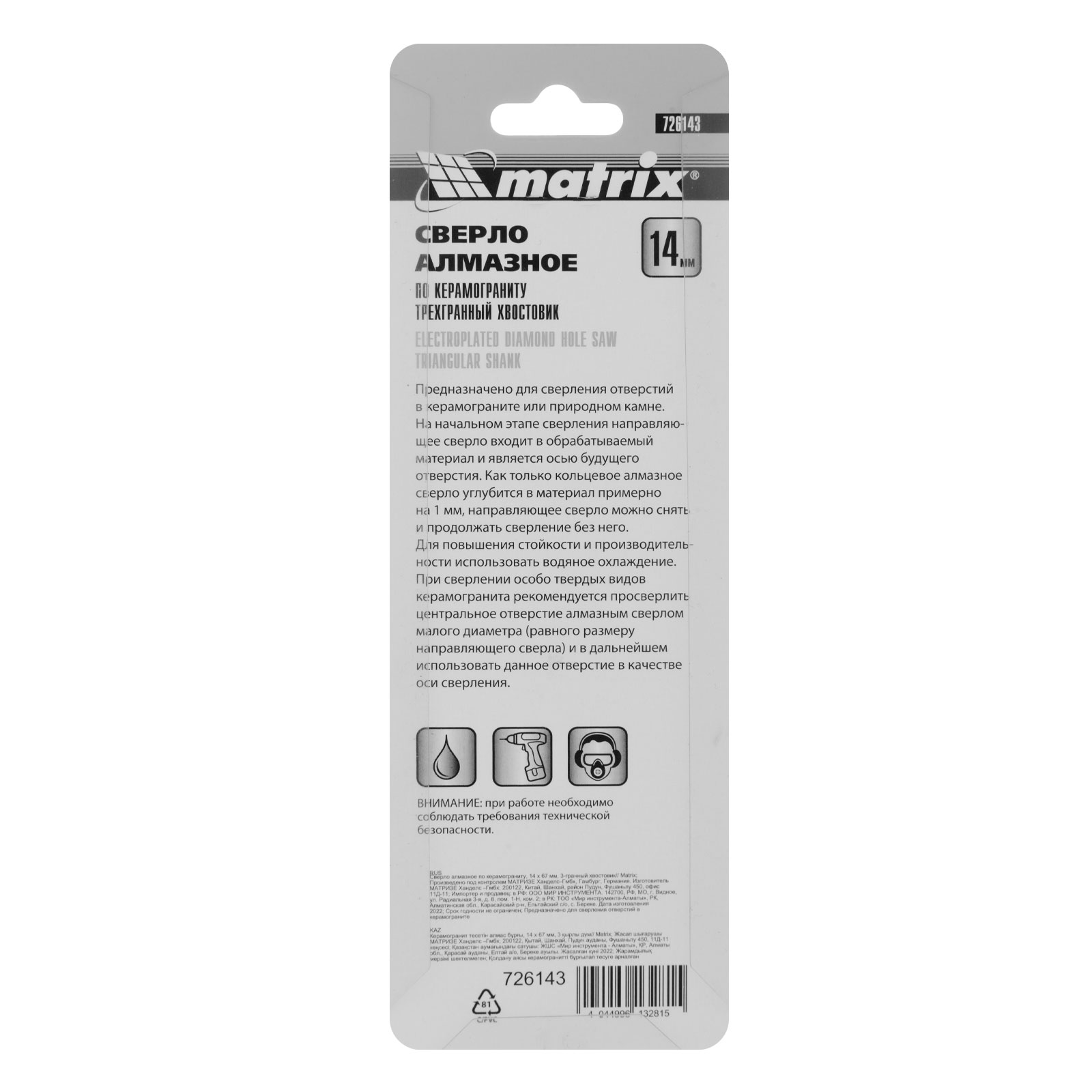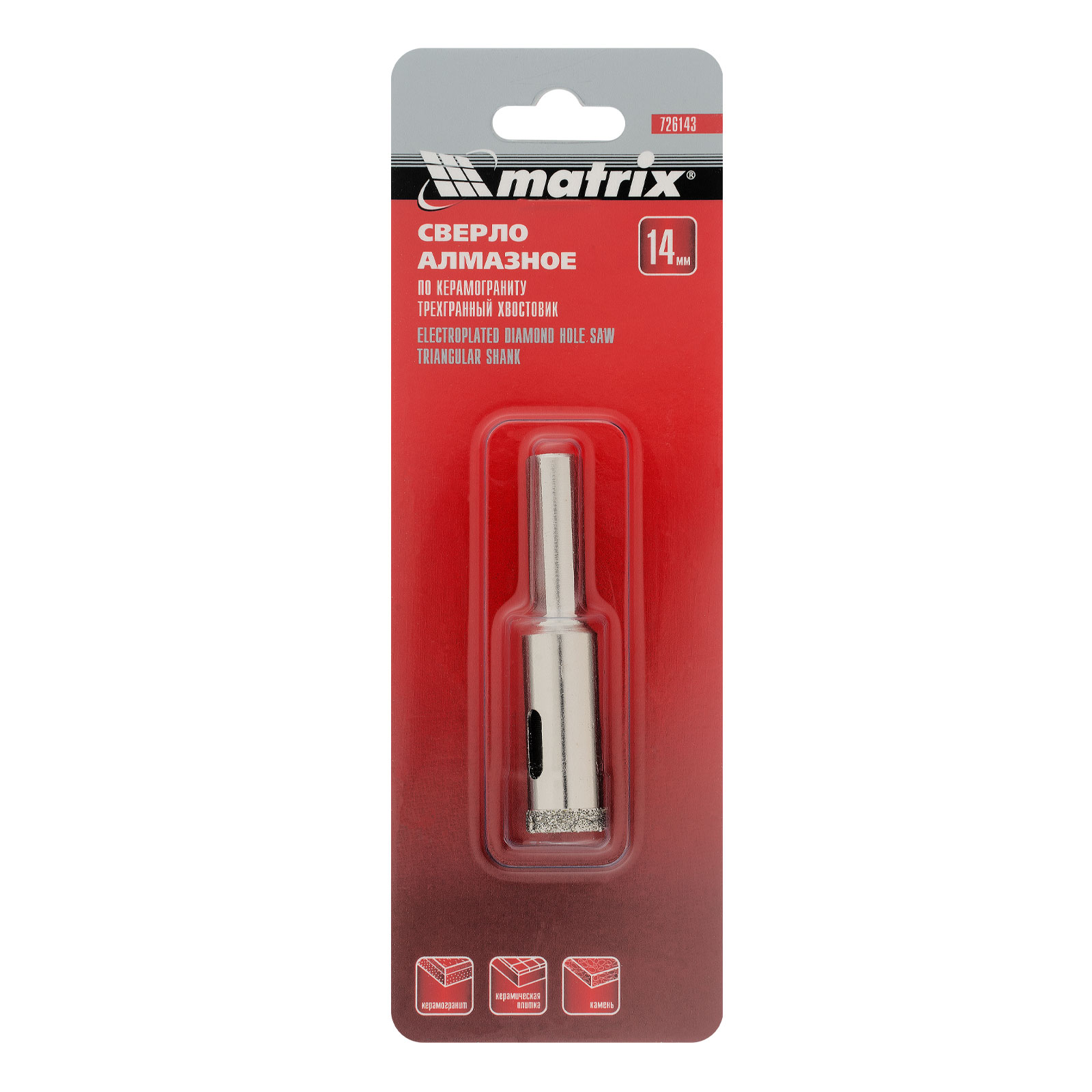 Универсальное алмазное сверло по керамограниту Matrix 726143 размером 14 х 67 мм, с 3-гранным хвостовиком, применяется для получения отверстий в стекле, плитке, кафеле. За счет высокой концентрации алмазов в режущем слое оно легко справляется со сверлением керамогранита. Сверло рассчитано на профессиональное использование с дрелями и шуруповертами, рекомендованная скорость составляет 350-700 об/мин. Водяное охлаждение в процессе работы значительно повышает срок службы оснастки.