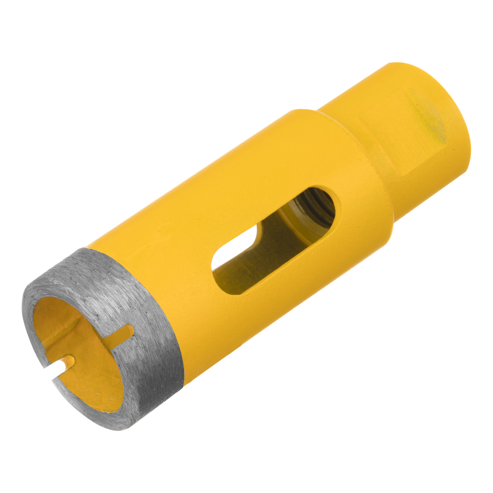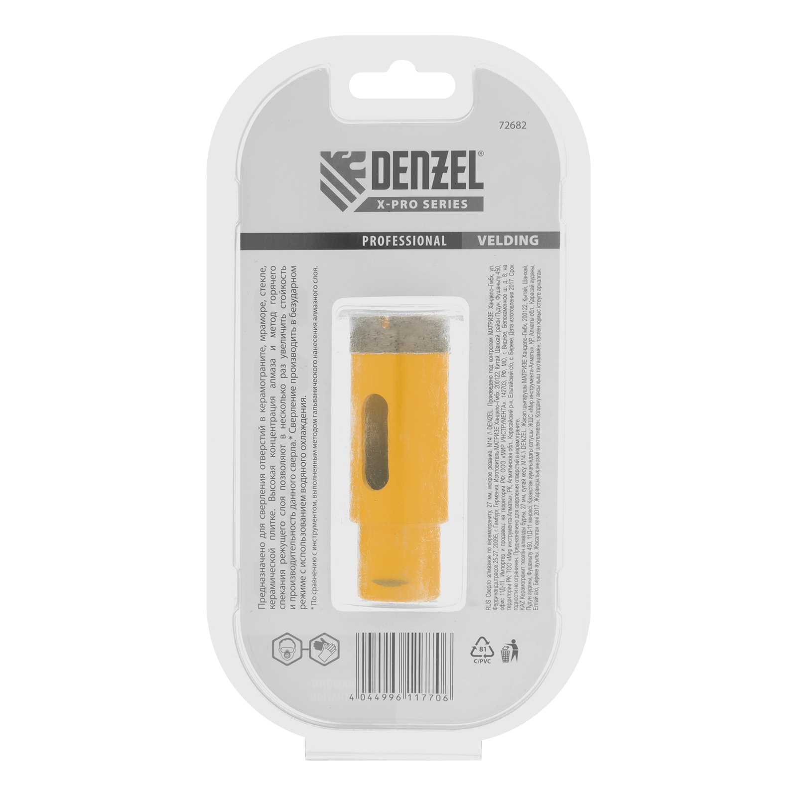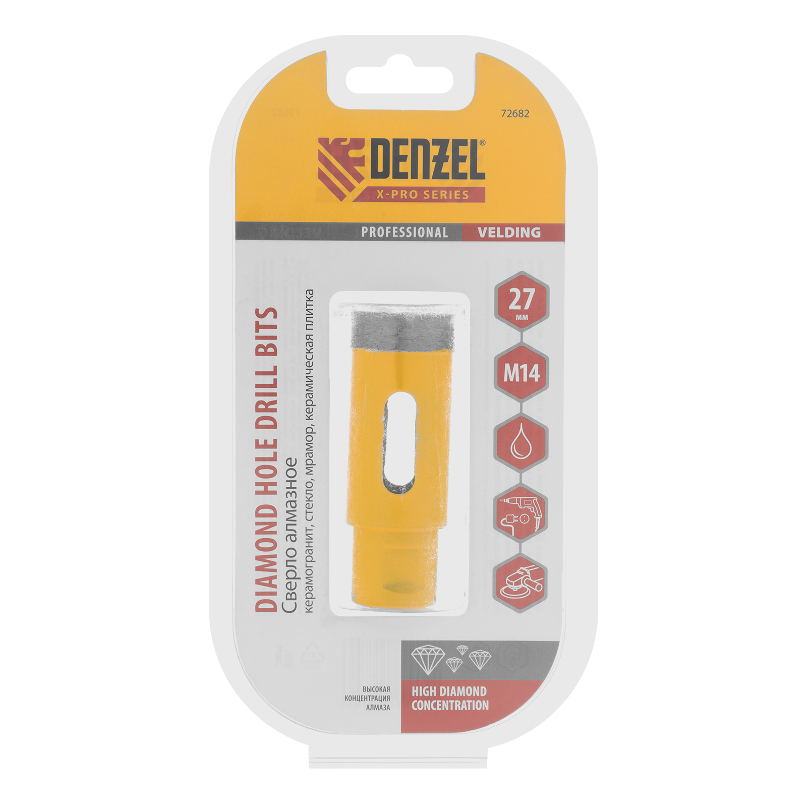 Алмазное сверло Denzel 72682 диаметром 27 мм, с резьбой М14, предназначено для «мокрого» сверления по керамограниту, мрамору, стеклу и керамической плитке. Позволяет получать ровные отверстия без сколов, используется для проведения ремонтных и отделочных работ. Сверло (коронку) устанавливают на вал углошлифовальной машины, благодаря чему скорость сверления увеличивается в несколько раз по сравнению с дрелью или шуруповертом. Применение водяного охлаждения повышает срок службы оснастки. Чтобы точно позиционировать сверло при сверлении дрелью, рекомендуется использовать кондуктор (арт. 72830).