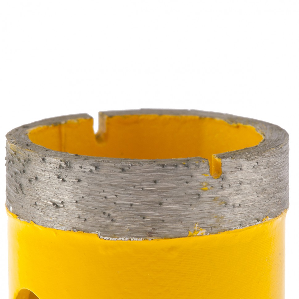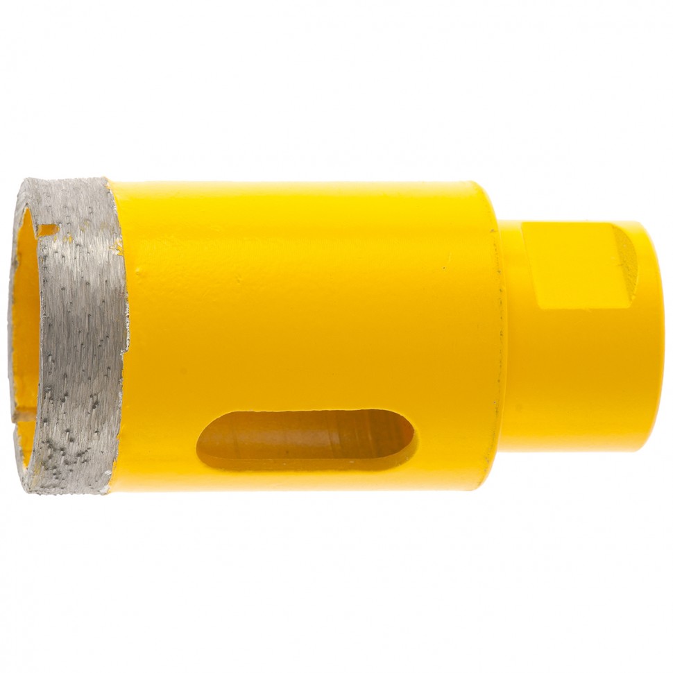 Алмазное сверло Denzel 72686 диаметром 38 мм, с резьбой М14, предназначено для «мокрого» сверления по керамограниту, мрамору, стеклу и керамической плитке. Позволяет получать ровные отверстия без сколов, используется для проведения ремонтных и отделочных работ. Сверло (коронку) устанавливают на вал углошлифовальной машины, благодаря чему скорость сверления увеличивается в несколько раз по сравнению с дрелью или шуруповертом. Применение водяного охлаждения повышает срок службы оснастки. Чтобы точно позиционировать сверло при сверлении дрелью, рекомендуется использовать кондуктор (арт. 72830).