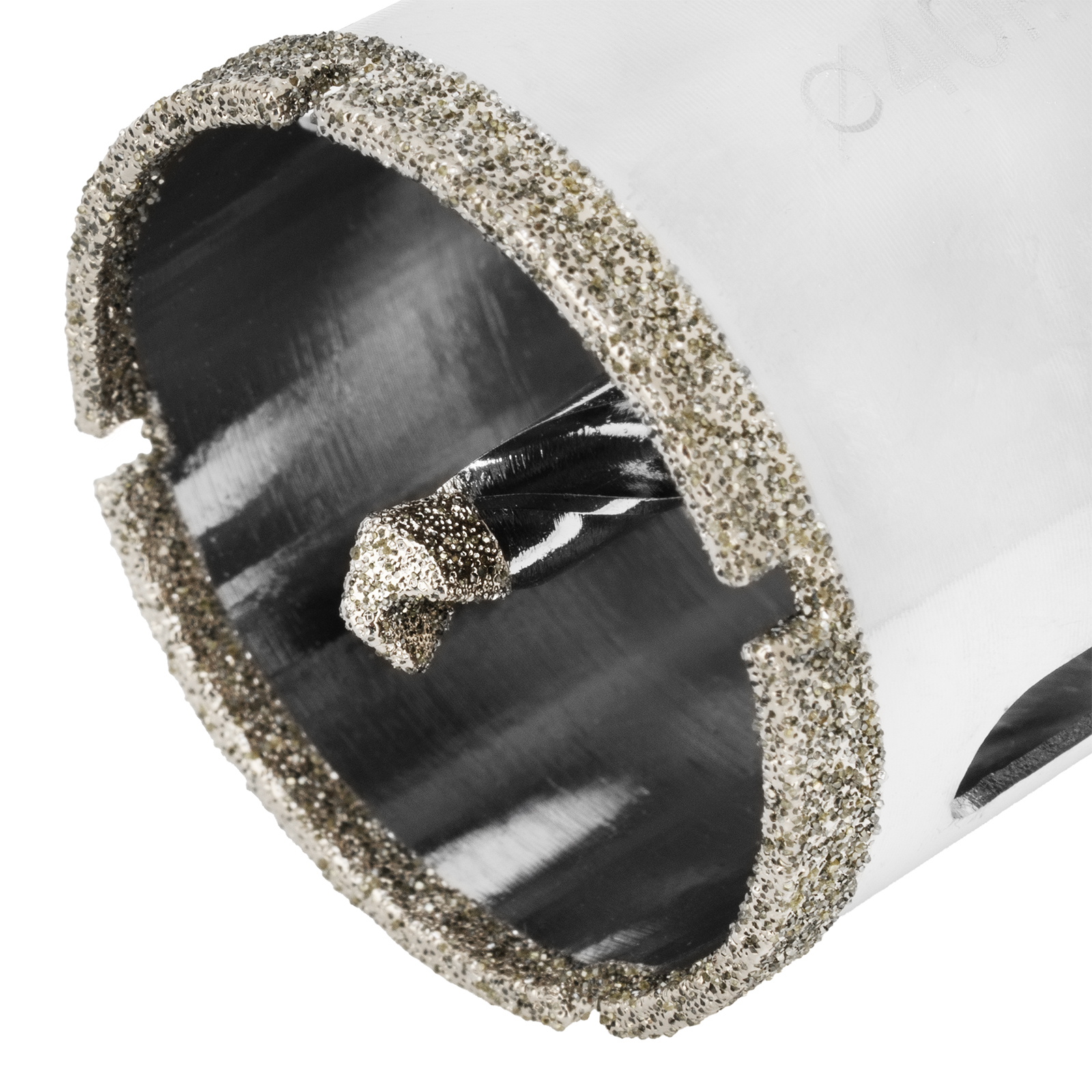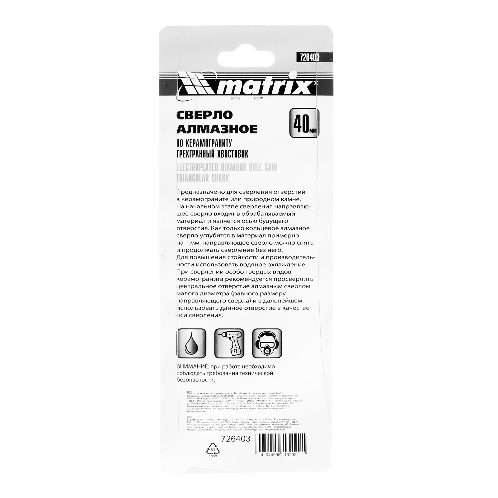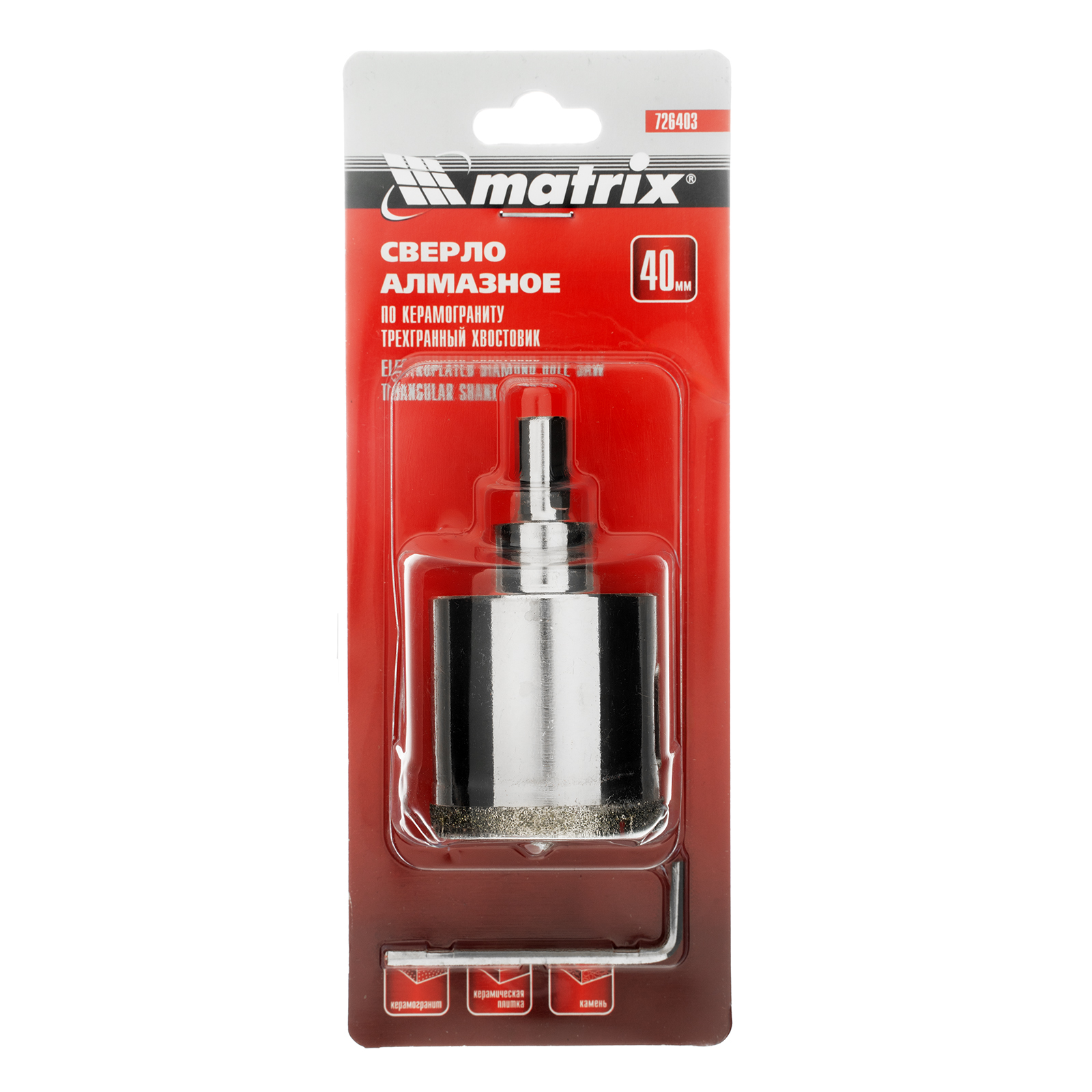 Универсальное алмазное сверло по керамограниту Matrix 726403 размером 40 х 67 мм, с 3-гранным хвостовиком, применяется для получения отверстий в стекле, плитке, кафеле. За счет высокой концентрации алмазов в режущем слое оно легко справляется со сверлением керамогранита. Сверло рассчитано на профессиональное использование с дрелями и шуруповертами. Водяное охлаждение в процессе работы значительно повышает срок службы оснастки.