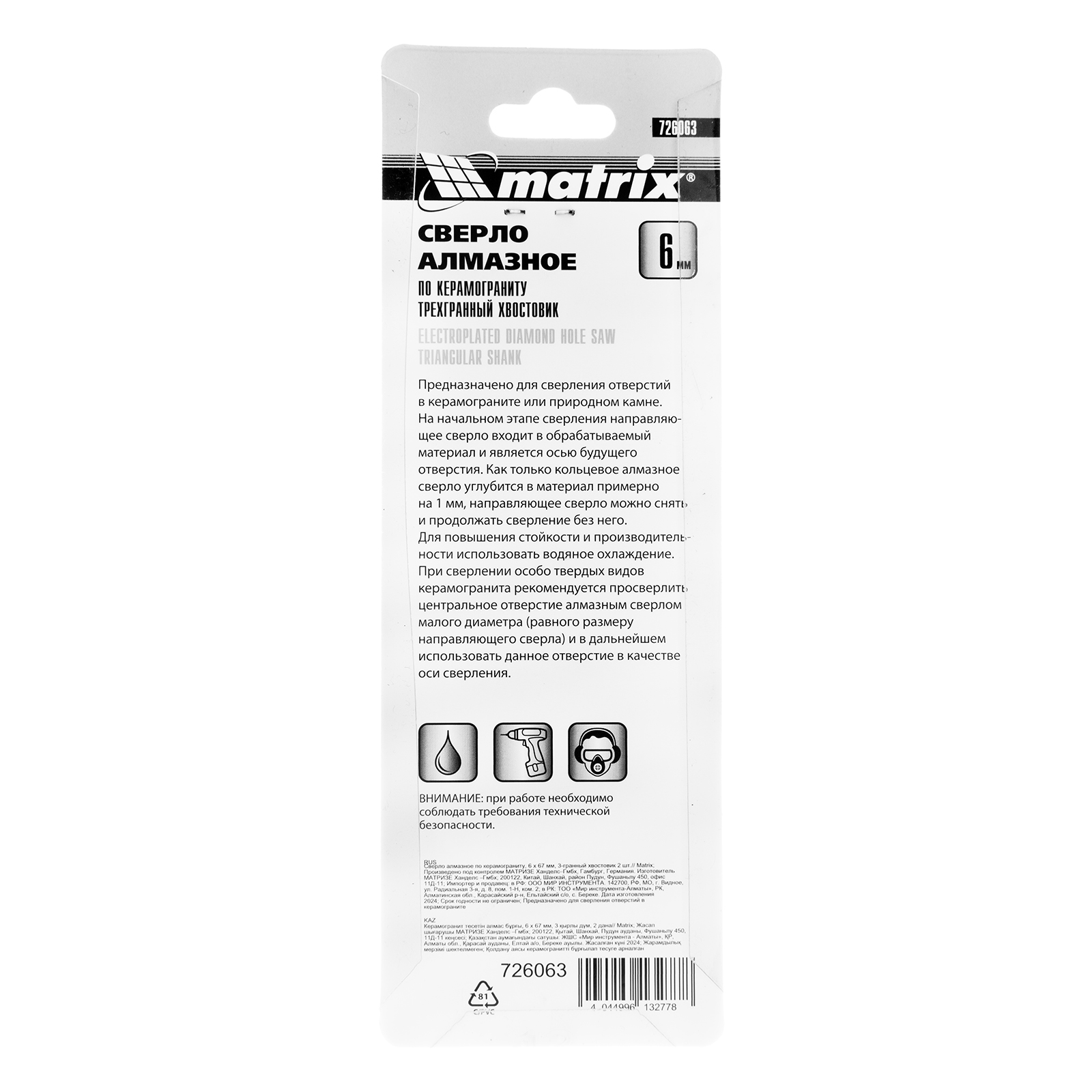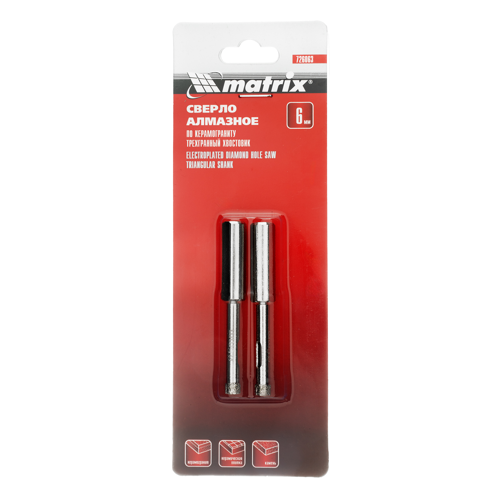 Универсальное алмазное сверло по керамограниту Matrix 726063 размером 6 х 67 мм, с 3-гранным хвостовиком, 2 шт. в упаковке, применяется для получения отверстий в стекле, плитке, кафеле. За счет высокой концентрации алмазов в режущем слое оно легко справляется со сверлением керамогранита. Сверло рассчитано на профессиональное использование с дрелями и шуруповертами, рекомендованная скорость составляет 350-700 об/мин. Водяное охлаждение в процессе работы значительно повышает срок службы оснастки.