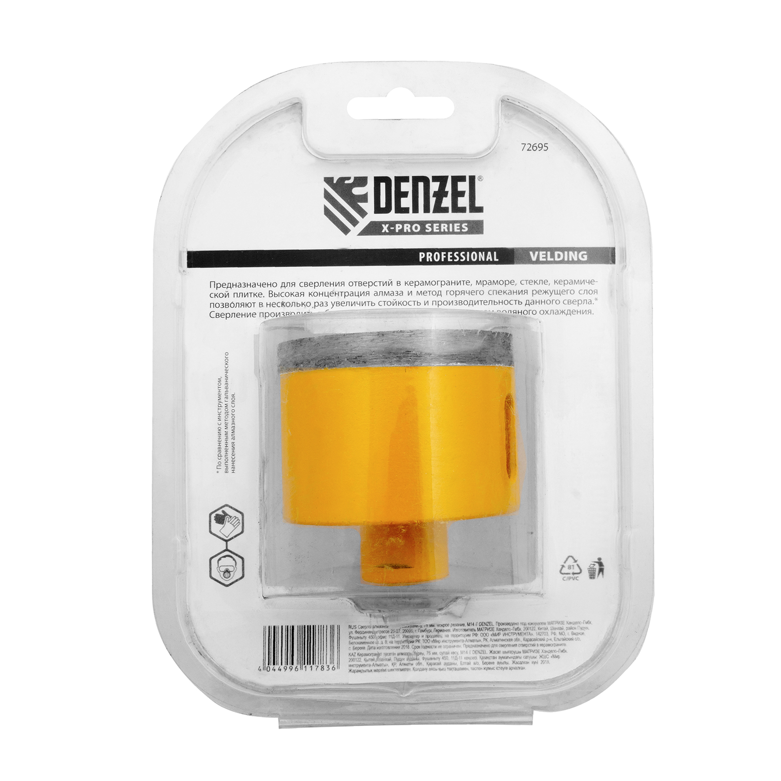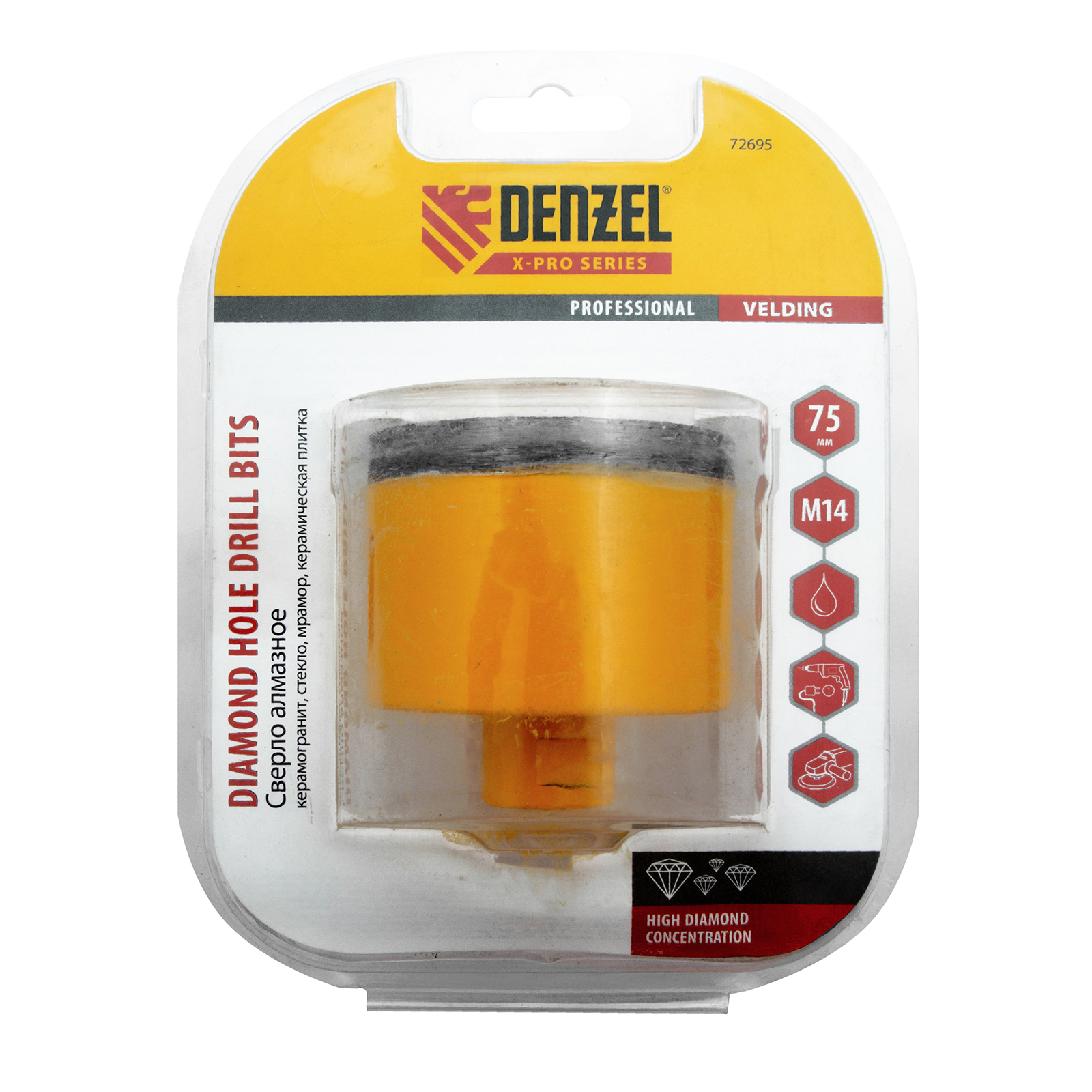 Алмазное сверло Denzel 72695 диаметром 75 мм, с резьбой М14, предназначено для «мокрого» сверления по керамограниту, мрамору, стеклу и керамической плитке. Позволяет получать ровные отверстия без сколов, используется для проведения ремонтных и отделочных работ. Сверло (коронку) устанавливают на вал углошлифовальной машины, благодаря чему скорость сверления увеличивается в несколько раз по сравнению с дрелью или шуруповертом. Применение водяного охлаждения повышает срок службы оснастки. Чтобы точно позиционировать сверло при сверлении дрелью, рекомендуется использовать кондуктор (арт. 72830).
