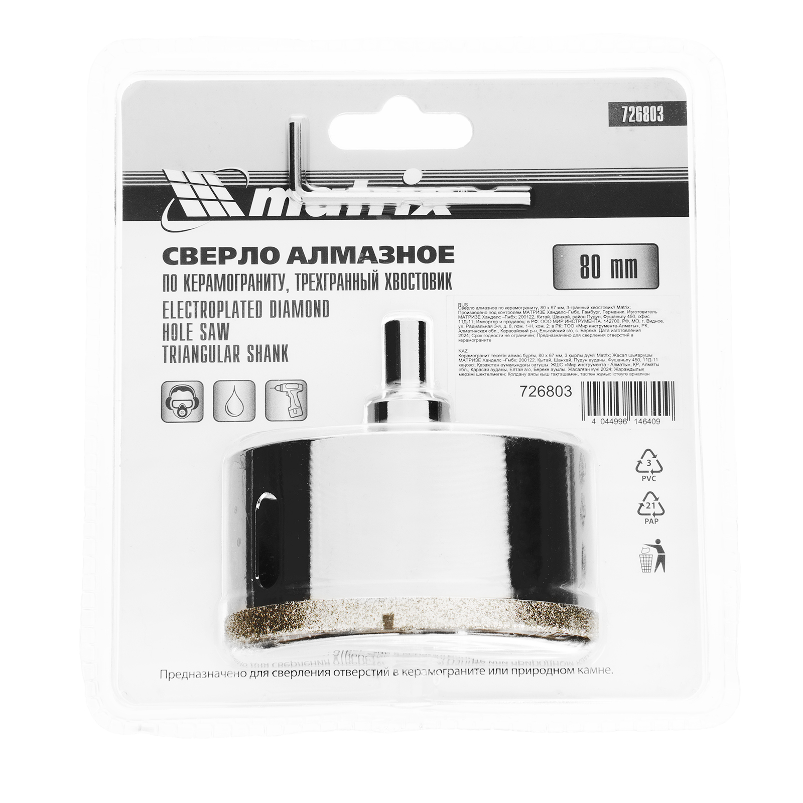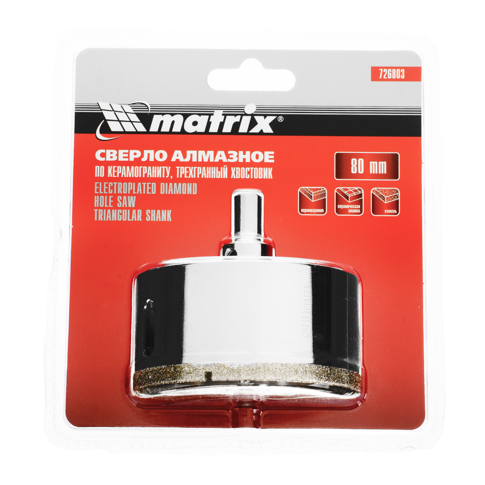 Универсальное алмазное сверло по керамограниту Matrix 726803 размером 80 х 67 мм, с 3-гранным хвостовиком, применяется для получения отверстий в стекле, плитке, кафеле. За счет высокой концентрации алмазов в режущем слое оно легко справляется со сверлением керамогранита. Сверло рассчитано на профессиональное использование с дрелями и шуруповертами. Водяное охлаждение в процессе работы значительно повышает срок службы оснастки.