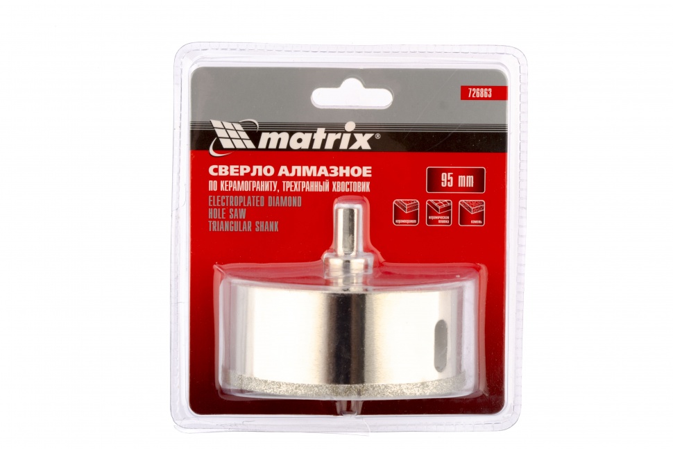 Универсальное алмазное сверло по керамограниту Matrix 726863 размером 95 х 67 мм, с 3-гранным хвостовиком, применяется для получения отверстий в стекле, плитке, кафеле. За счет высокой концентрации алмазов в режущем слое оно легко справляется со сверлением керамогранита. Сверло рассчитано на профессиональное использование с дрелями и шуруповертами. Водяное охлаждение в процессе работы значительно повышает срок службы оснастки.