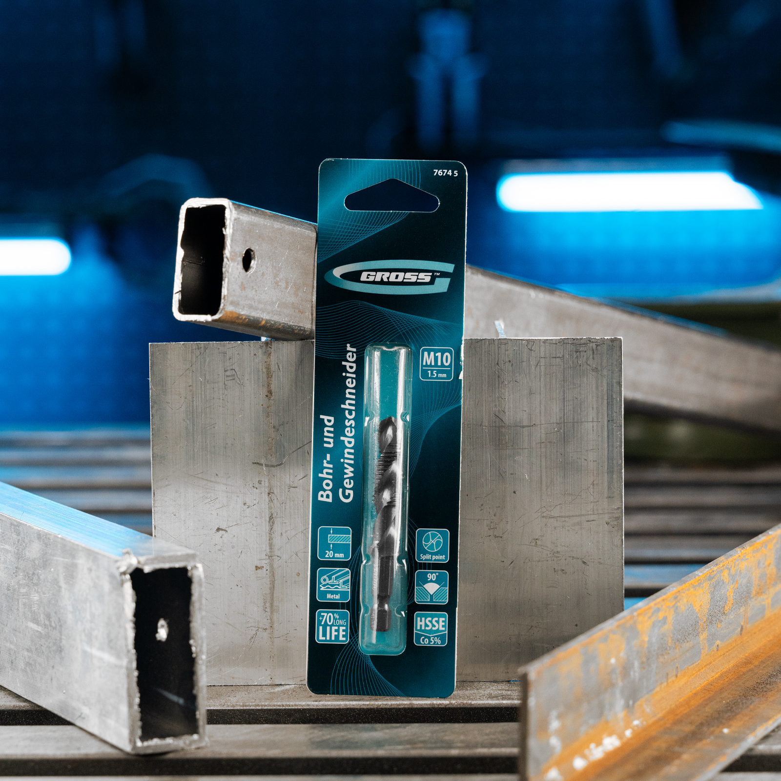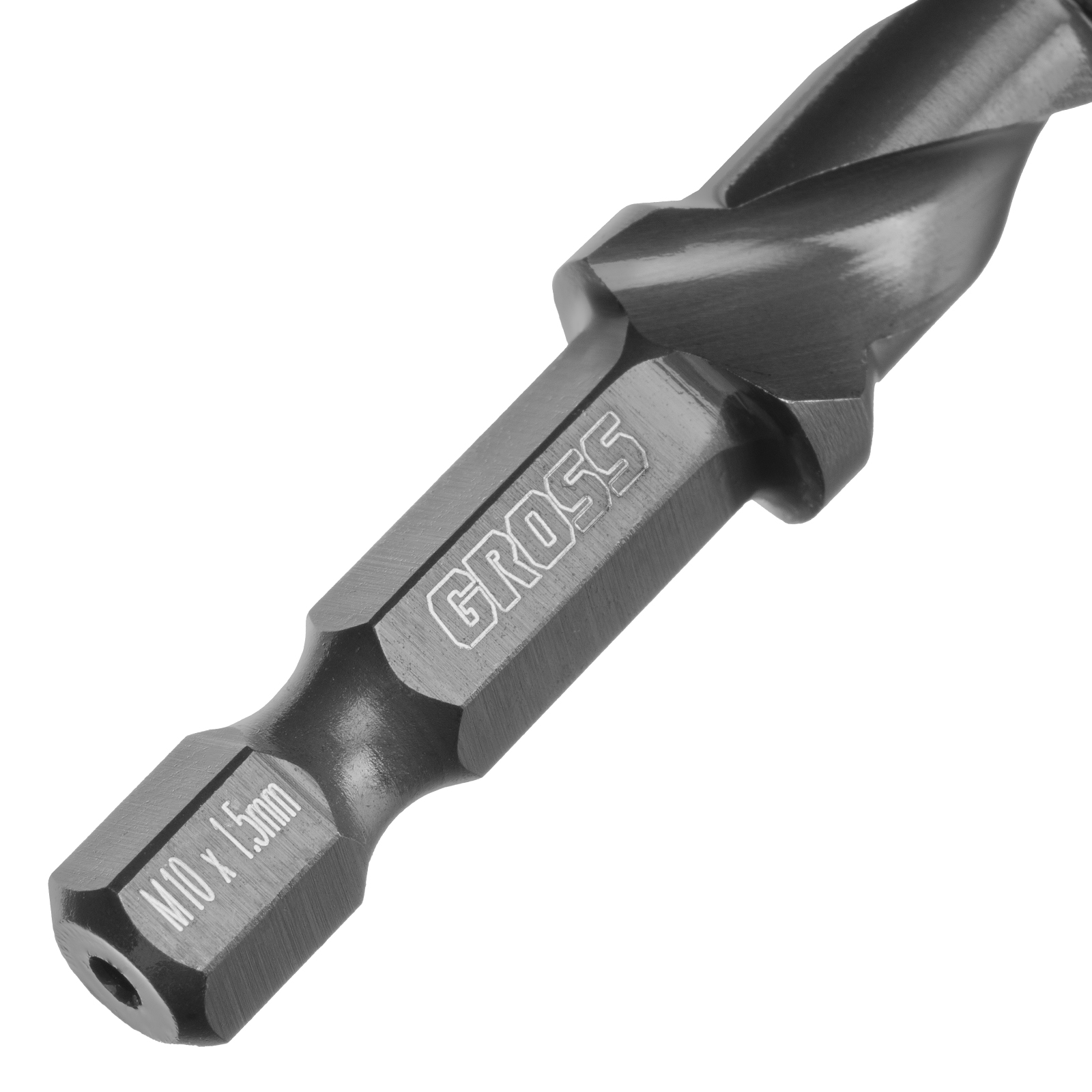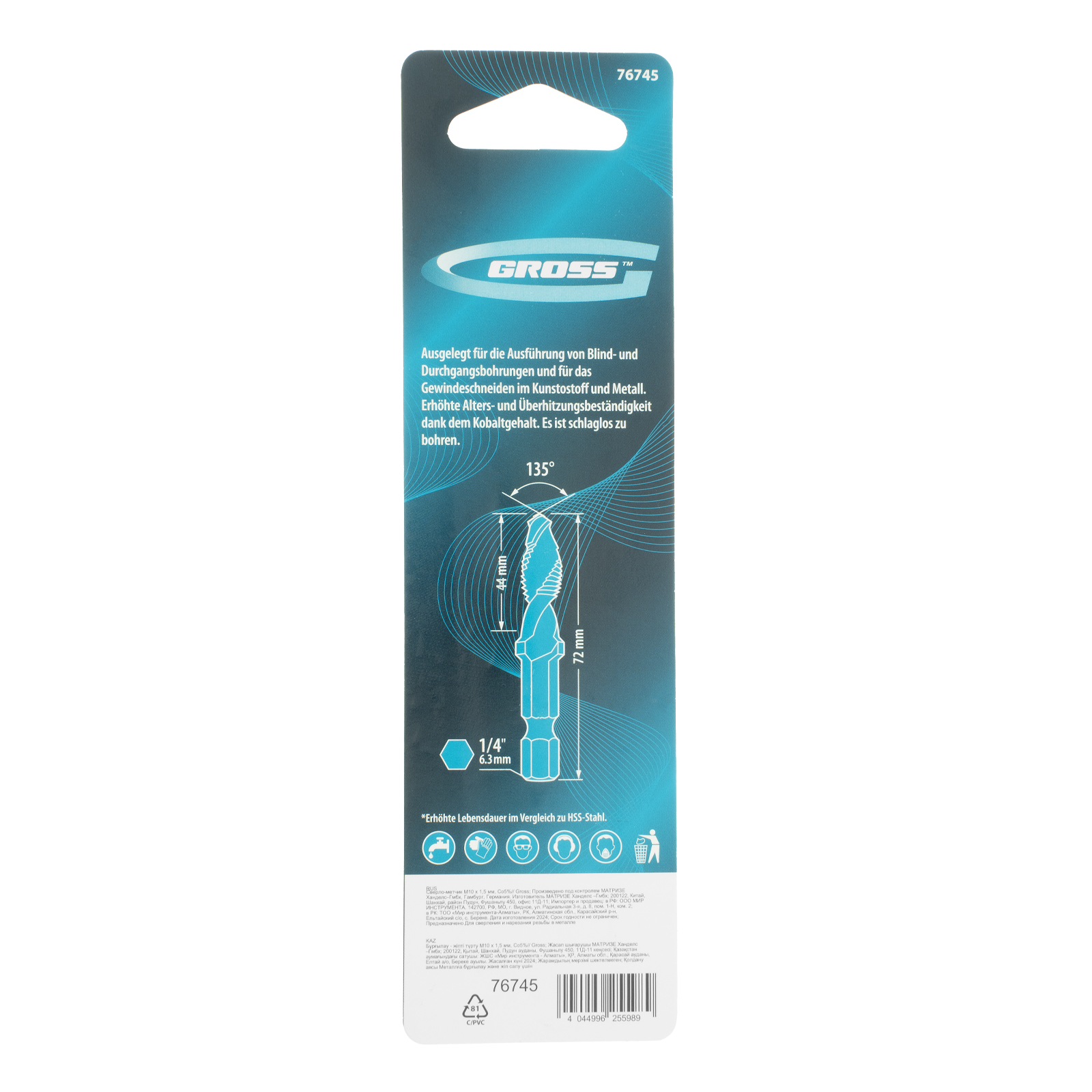 Сверло-метчик Gross 76745 из стали с 5%-м содержанием кобальта предназначено для получения глухих и сквозных отверстий в металлических заготовках с одновременным нарезанием правой резьбы M10 с шагом 1,5 мм. Позволяет существенно сэкономить время работы, объединив две операции в одну. Угол заточки 135° оптимален для работы с чугуном, сталью, алюминием, медью, бронзой.