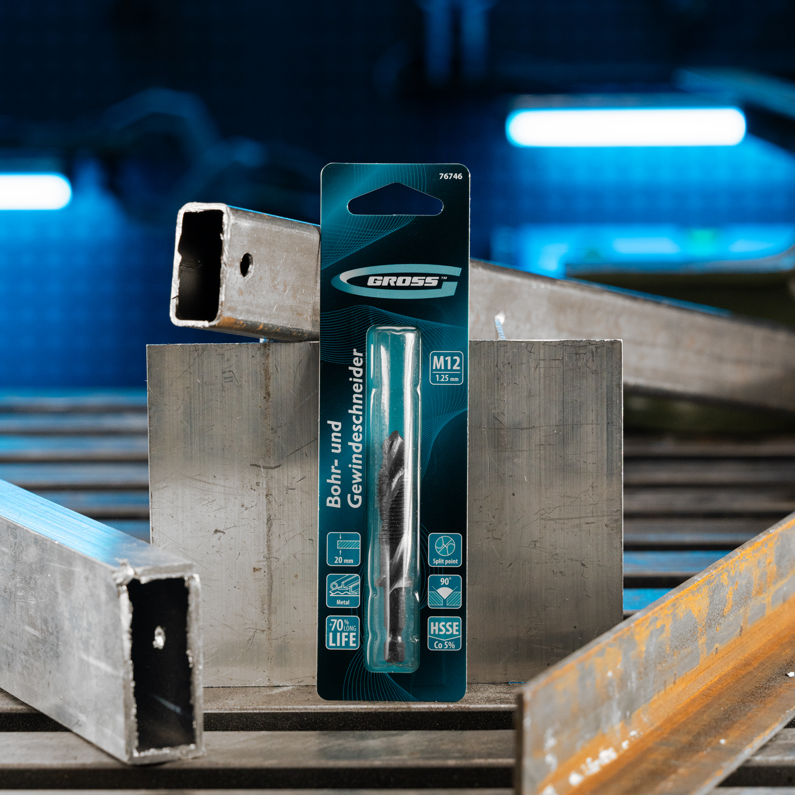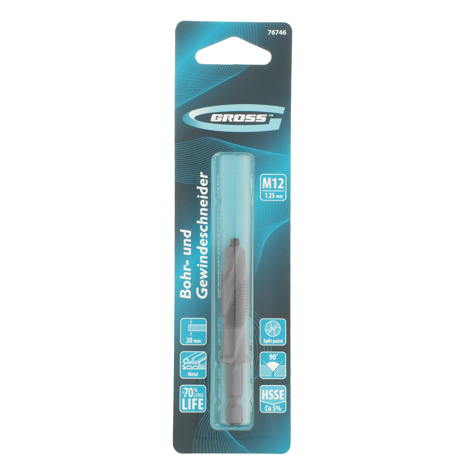 Сверло-метчик Gross 76746 из стали с 5%-м содержанием кобальта предназначено для получения глухих и сквозных отверстий в металлических заготовках с одновременным нарезанием правой резьбы M12 с шагом 1,25 мм. Позволяет существенно сэкономить время работы, объединив две операции в одну. Угол заточки 135° оптимален для работы с чугуном, сталью, алюминием, медью, бронзой.