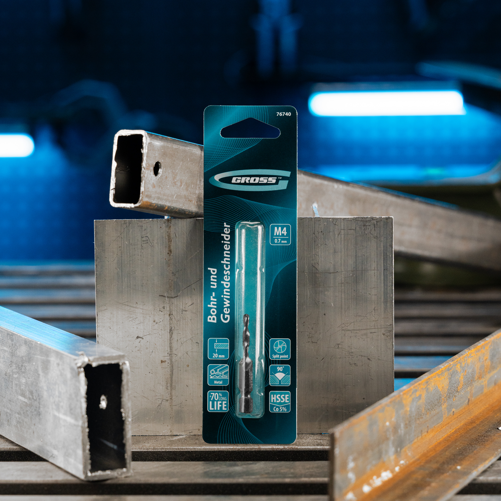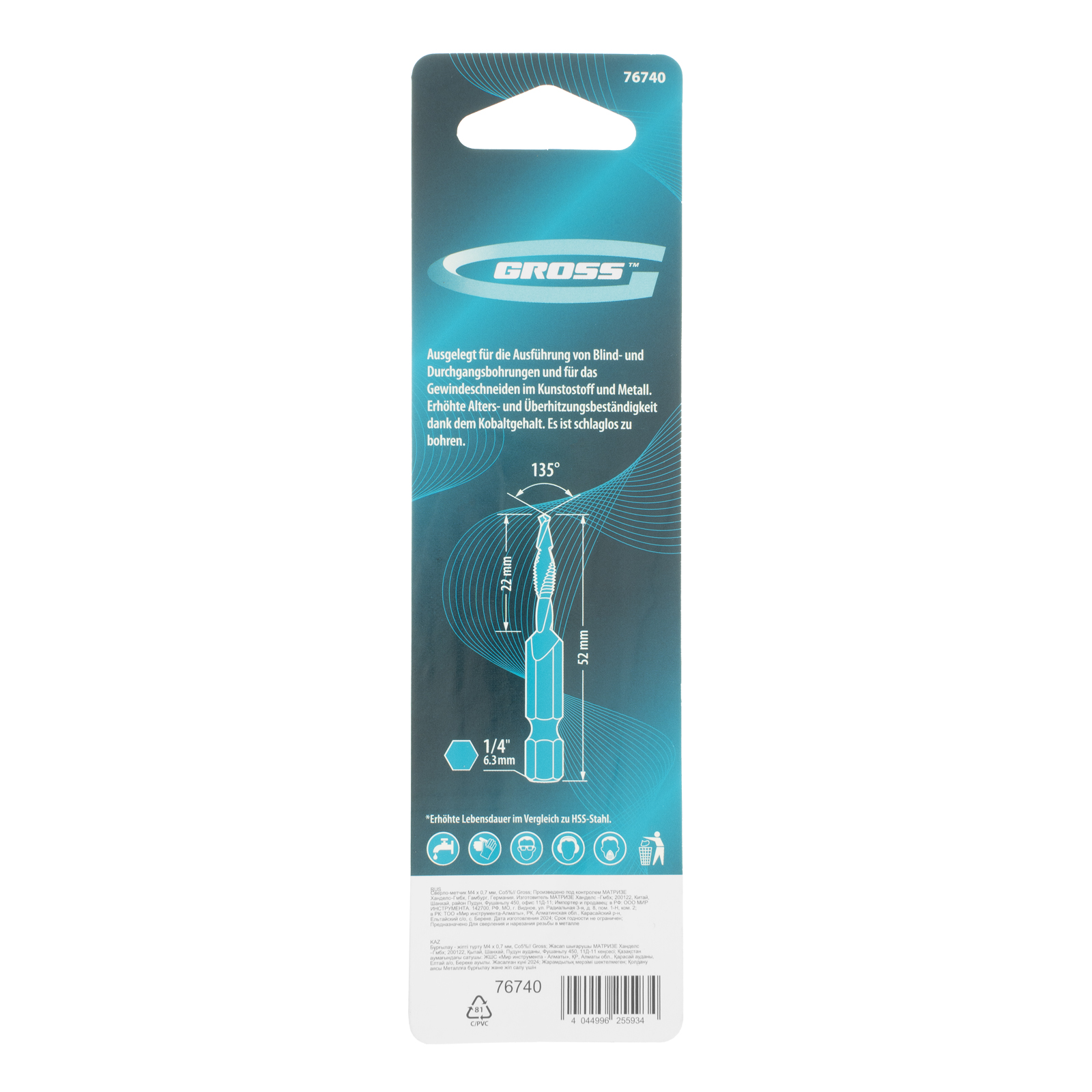 Сверло-метчик Gross 76740 из стали с 5%-м содержанием кобальта предназначено для получения глухих и сквозных отверстий в металлических заготовках с одновременным нарезанием правой резьбы M4 с шагом 0,7 мм. Позволяет существенно сэкономить время работы, объединив две операции в одну. Угол заточки 135° оптимален для работы с чугуном, сталью, алюминием, медью, бронзой.