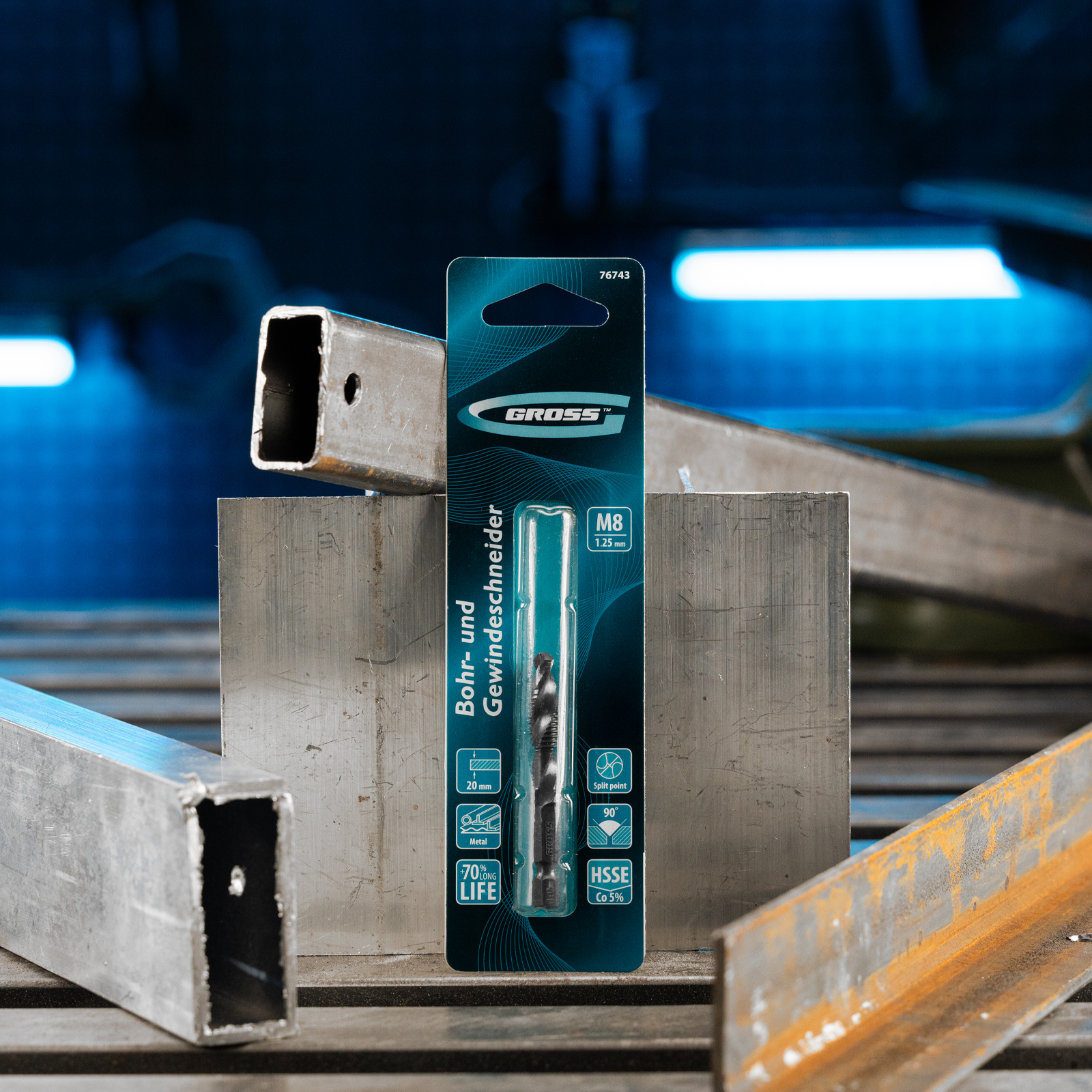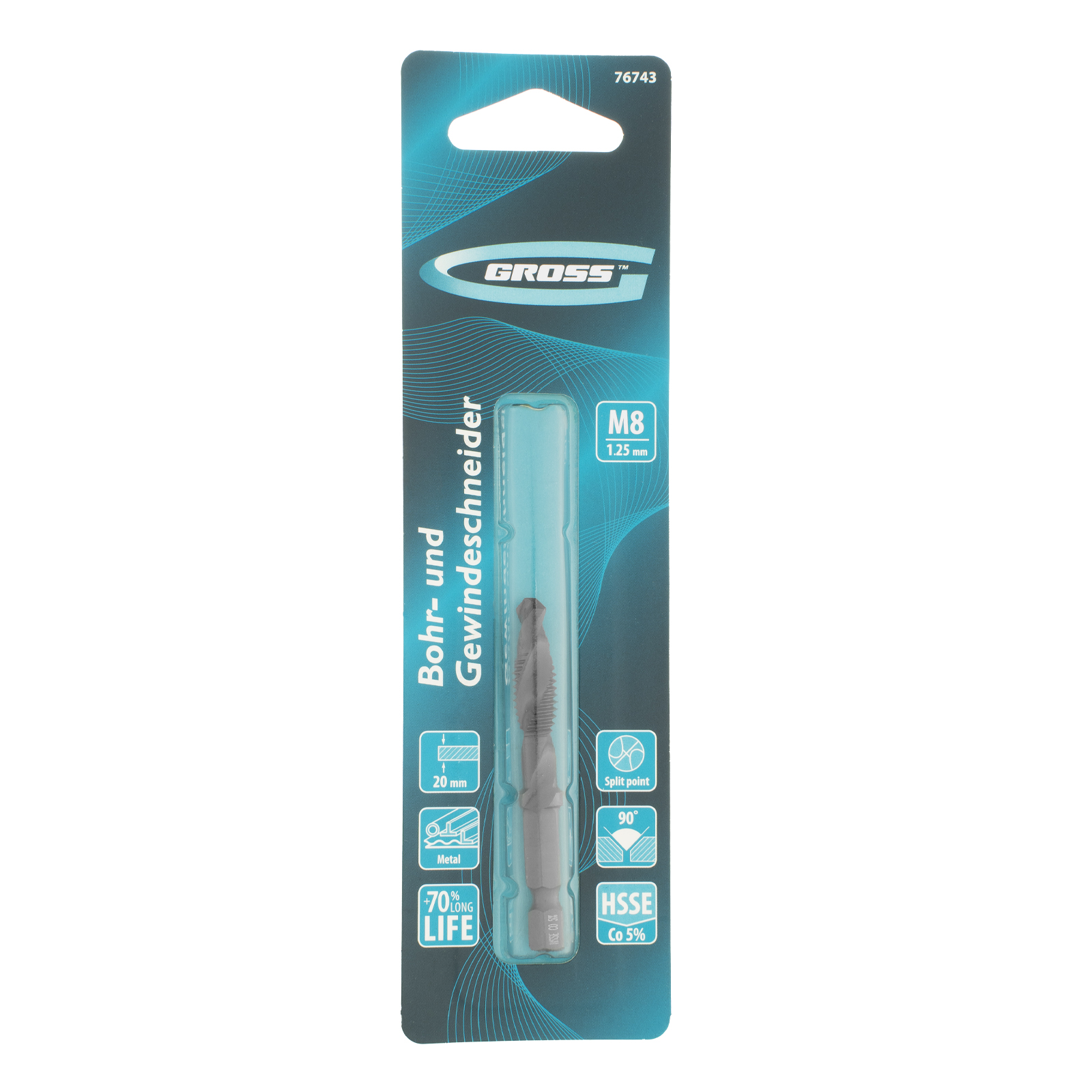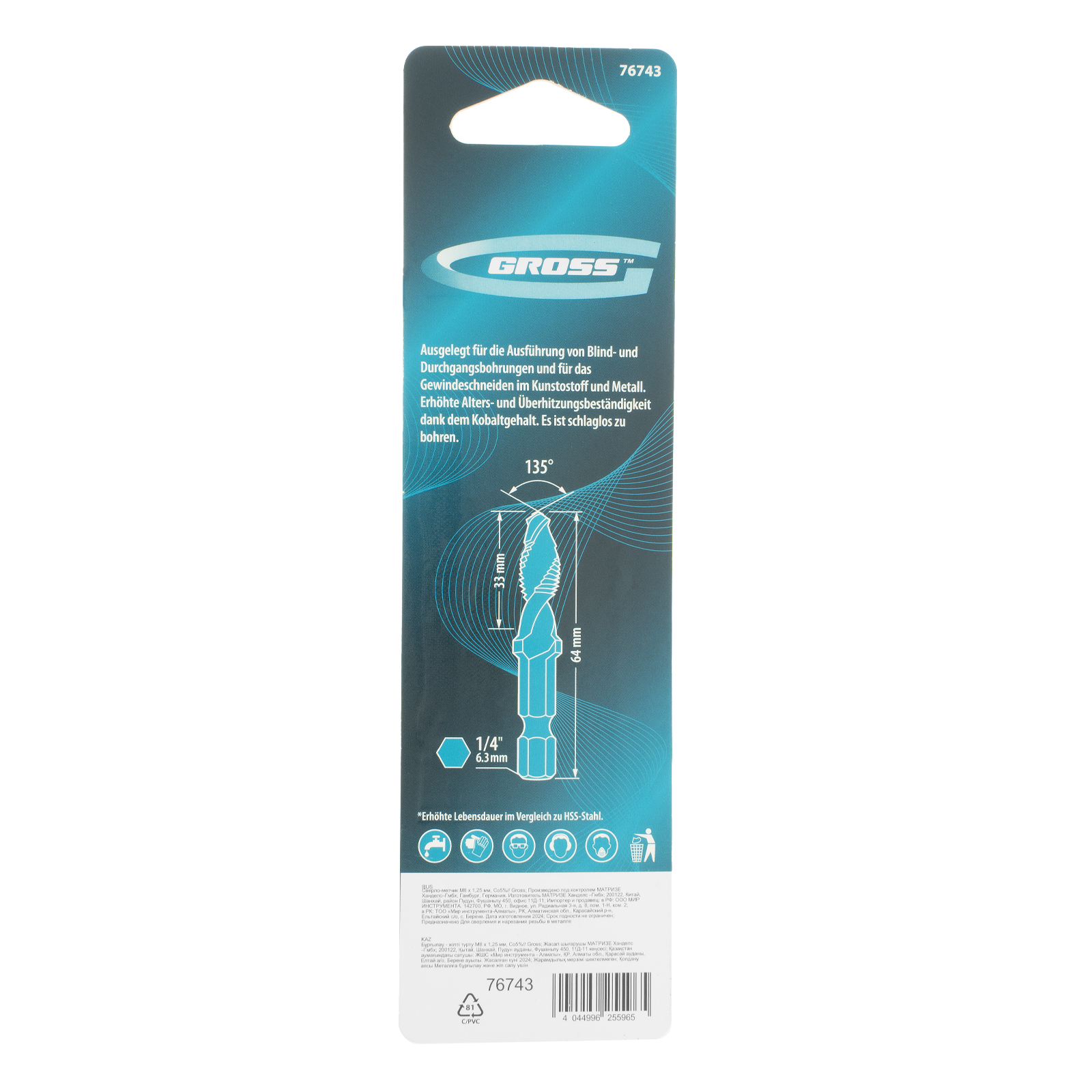 Сверло-метчик Gross 76743 из стали с 5%-м содержанием кобальта предназначено для получения глухих и сквозных отверстий в металлических заготовках с одновременным нарезанием правой резьбы M8 с шагом 1,25 мм. Позволяет существенно сэкономить время работы, объединив две операции в одну. Угол заточки 135° оптимален для работы с чугуном, сталью, алюминием, медью, бронзой.